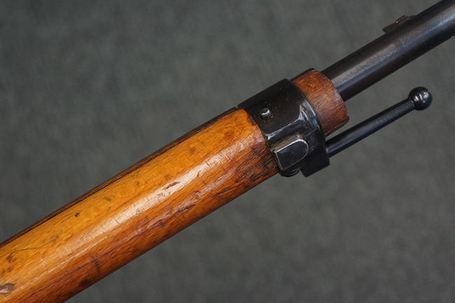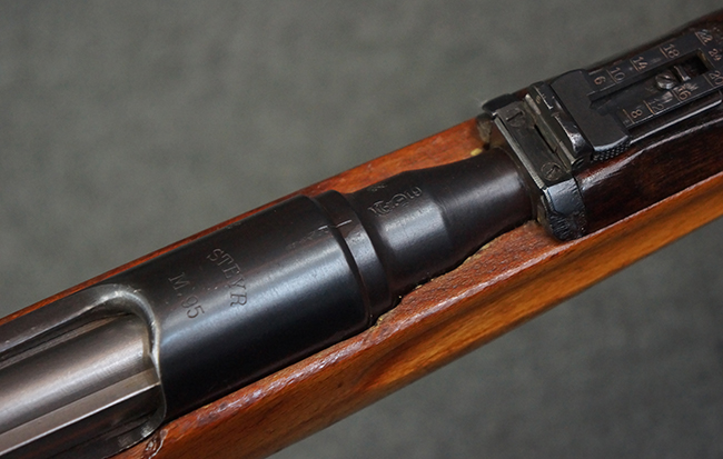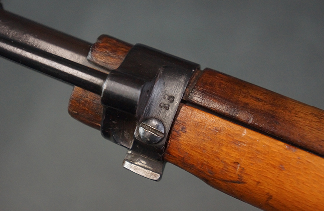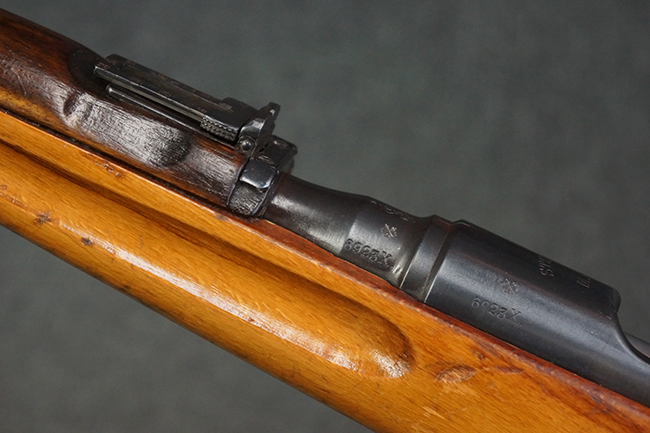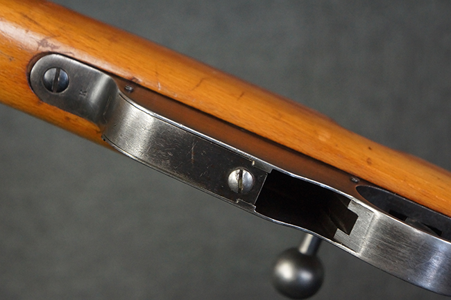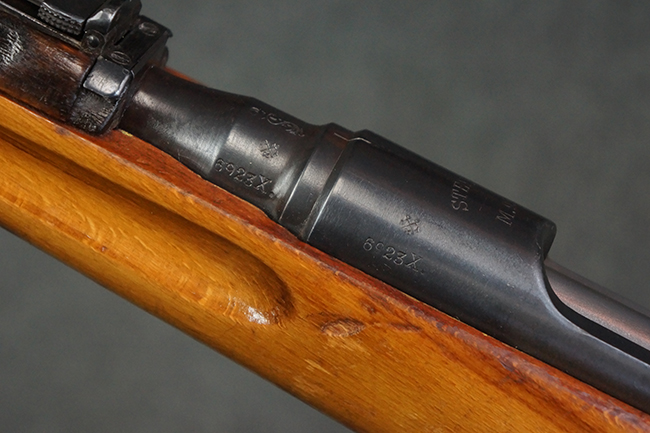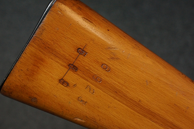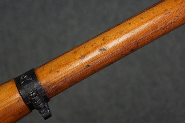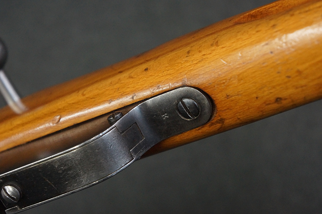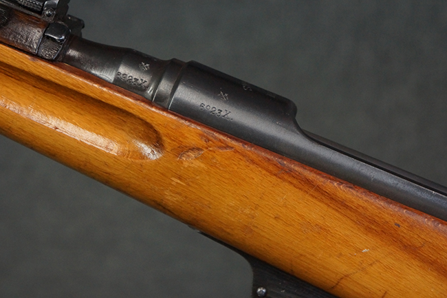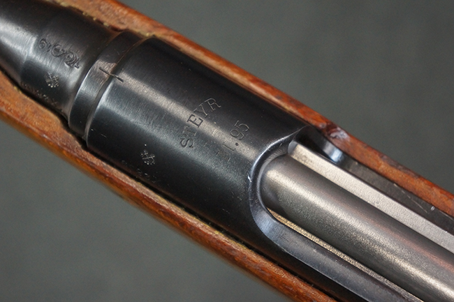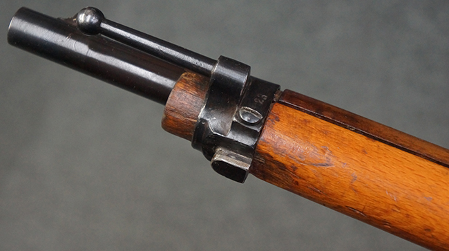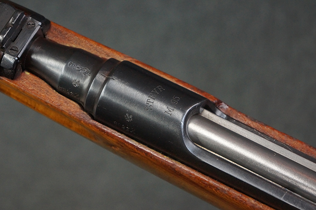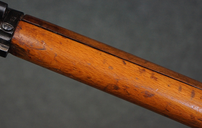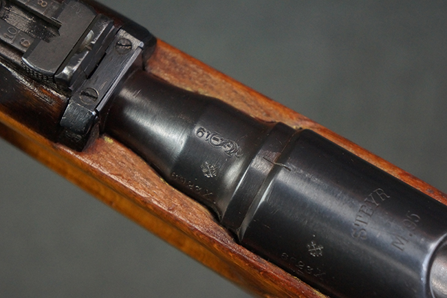 本品はステアー・マンリッカー M95 騎兵銃ベースのM95/30 騎兵銃で、薬室上面に尖頭弾仕様である事を示す「S」の刻印が打刻されています。 機関部上面には「STEYR」の刻印及び「M.95」の刻印が入っています。 また、薬室上面にはWiener-Neustadtを示す「W-n」と「19」と思われる数字を組み合わせた軍の受領刻印が入っています。 シリアルNo.は、機関部、銃身が6923Xでマッチしており、バット・ストックも打ち直しにより6923、フロント・バンドが23、ボルト・ハンドルは手書きにより827となっています。