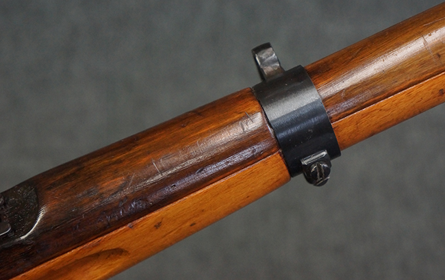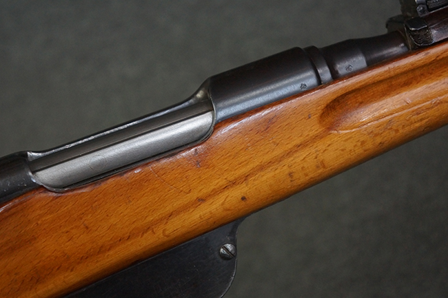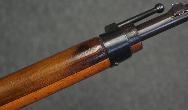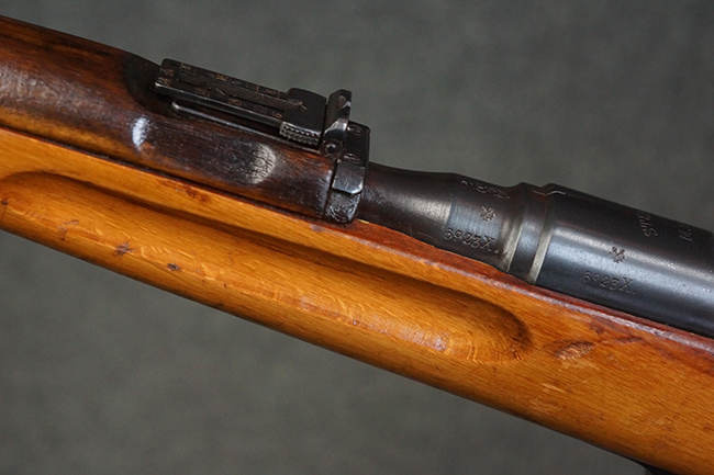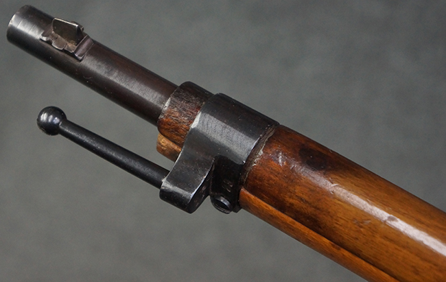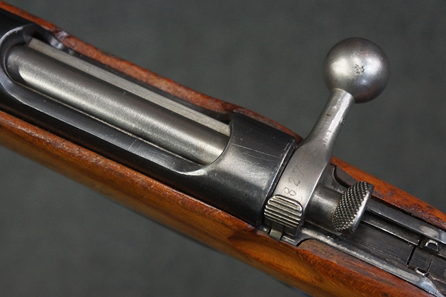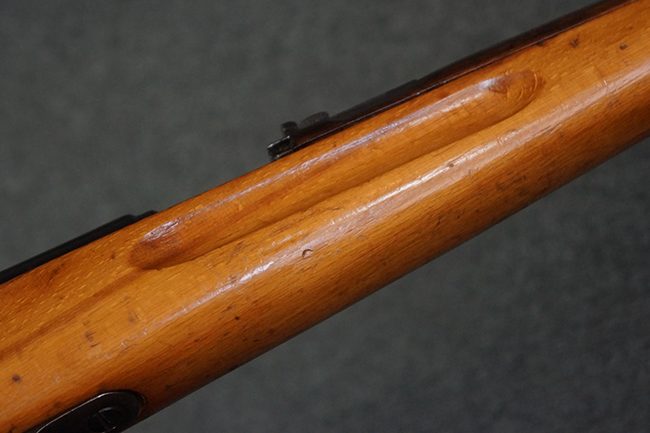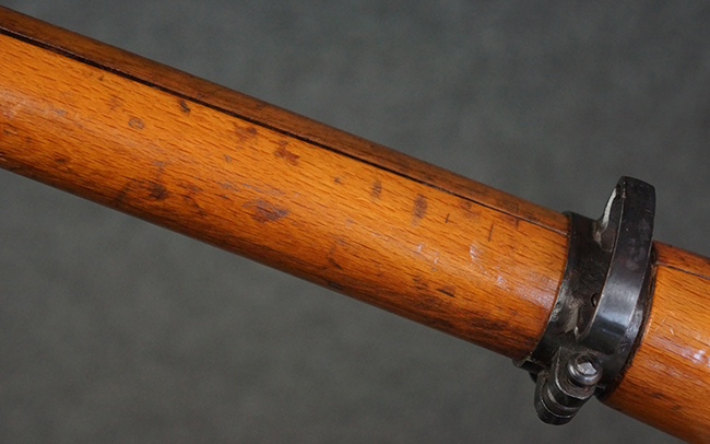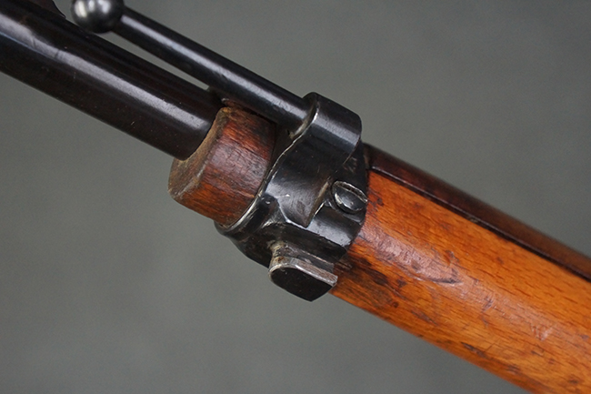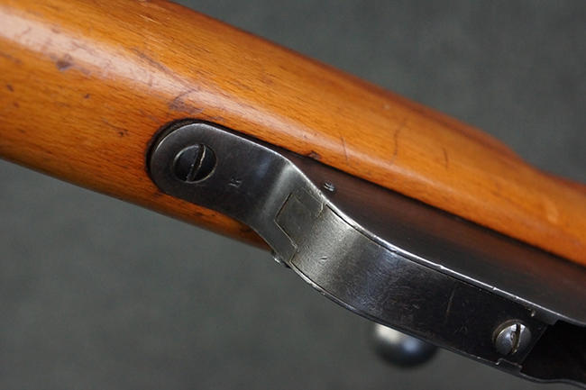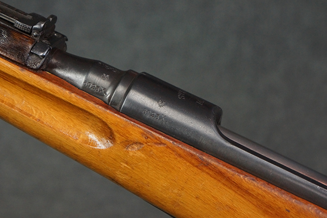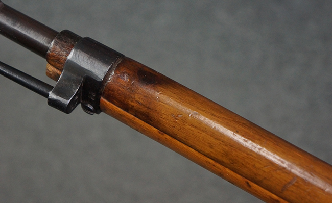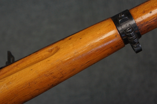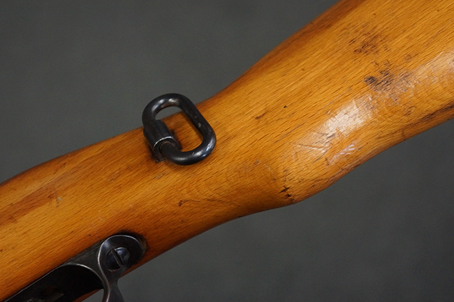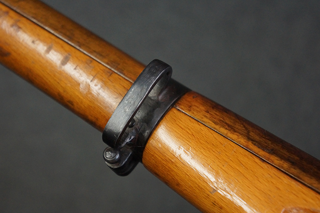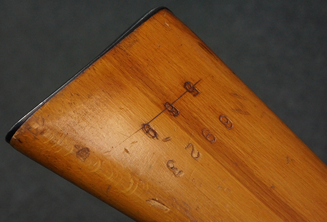 本品はステアー・マンリッカー M95 騎兵銃ベースのM95/30 騎兵銃で、薬室上面に尖頭弾仕様である事を示す「S」の刻印が打刻されています。 機関部上面には「STEYR」の刻印及び「M.95」の刻印が入っています。 また、薬室上面にはWiener-Neustadtを示す「W-n」と「19」と思われる数字を組み合わせた軍の受領刻印が入っています。 シリアルNo.は、機関部、銃身が6923Xでマッチしており、バット・ストックも打ち直しにより6923、フロント・バンドが23、ボルト・ハンドルは手書きにより827となっています。