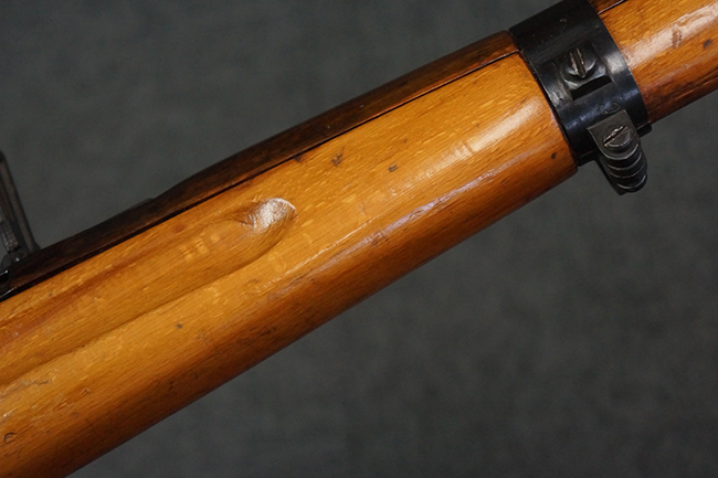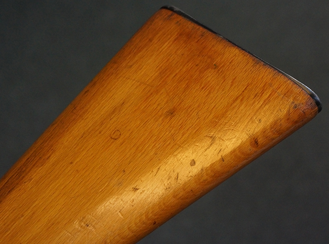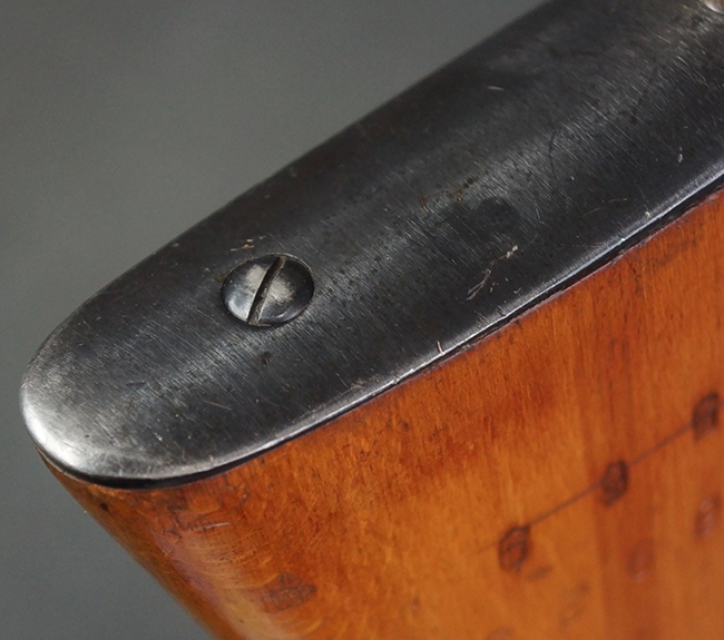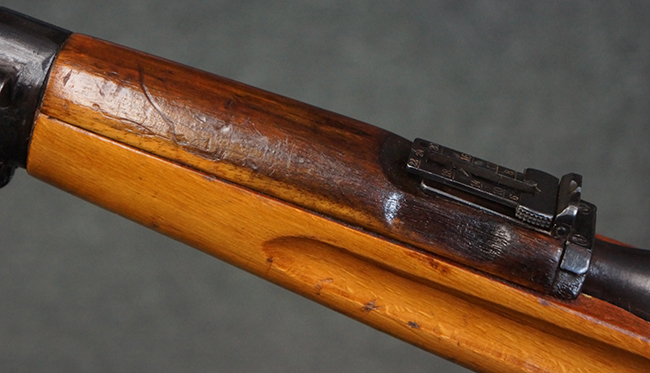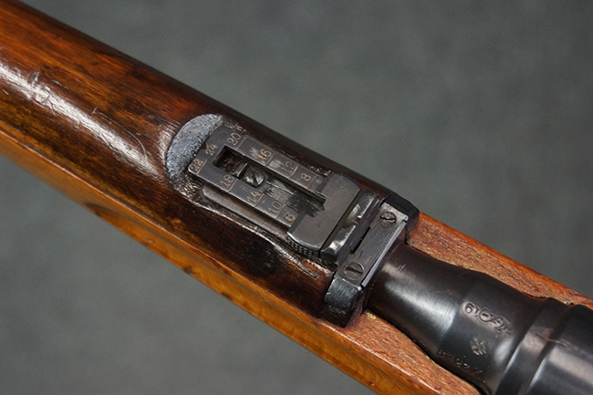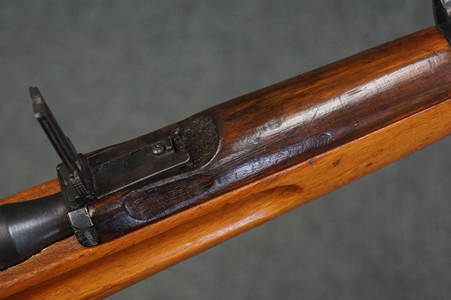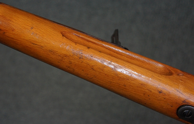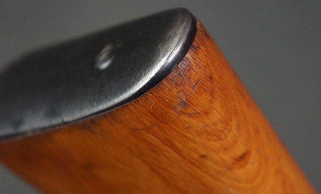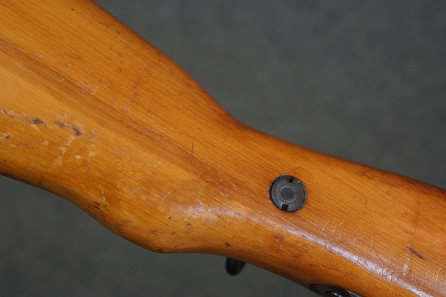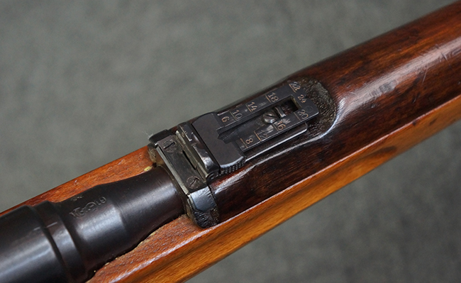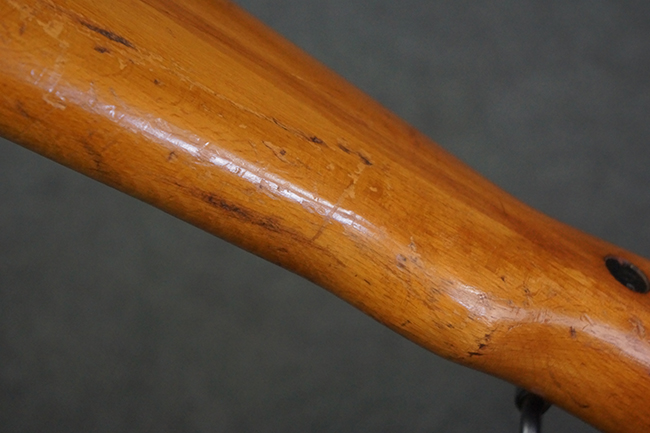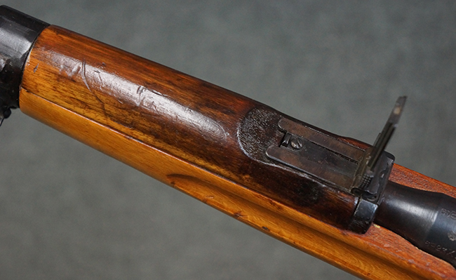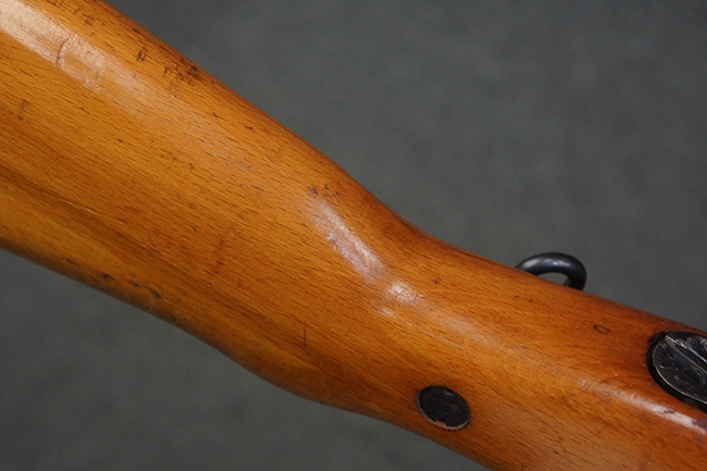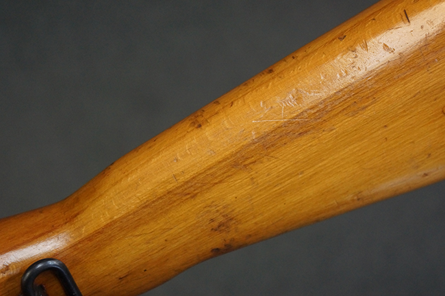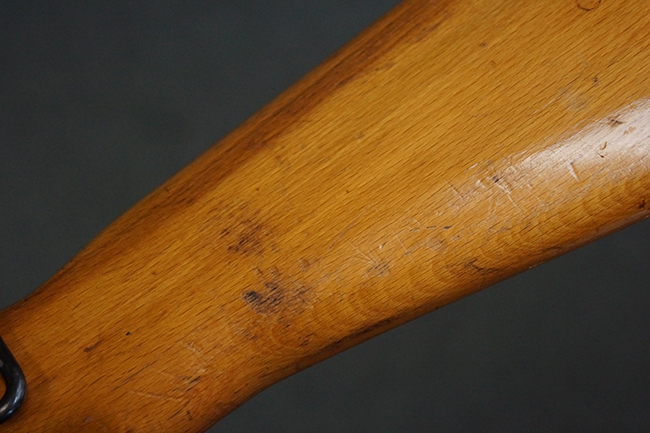 本品の銃身や機関部、弾倉といった金属部は、やや打ち傷や経年による褪色、若干の表面錆痕の他、一部仕上げが薄くなり金属の地肌が表れている箇所が見られるものの、目立った欠損等は見受けられず、概ねしっかりとした状態が保たれています。 木製銃床についても、やや打ち傷や線傷等は見られるものの、現状大きな破損等は見受けられません。 バット・プレートについても、若干の打ち傷や擦れ、僅かな凹みが見られる他、角の部分等に仕上げが落ちて金属の地肌が表れている箇所が見られますが、銃床への取り付けはがたつきもなくしっかりとしています。 リア・サイトの起倒・調整については問題なく行う事が可能です。