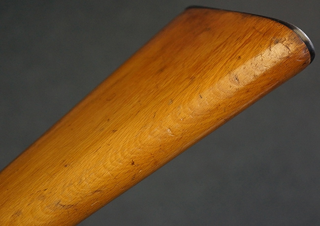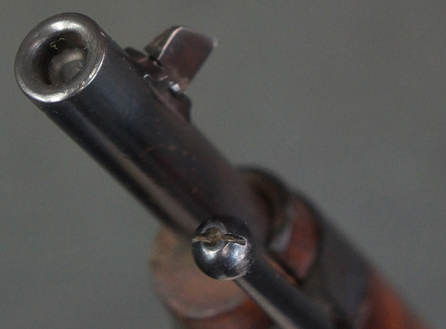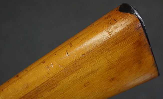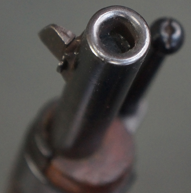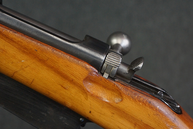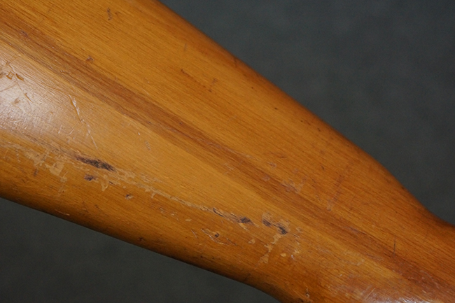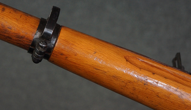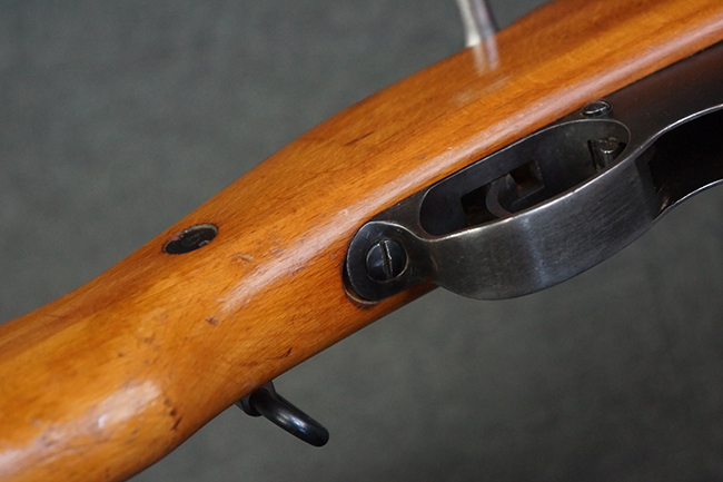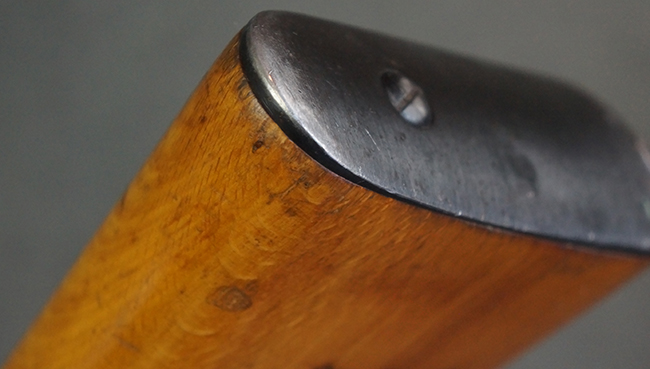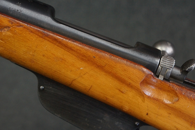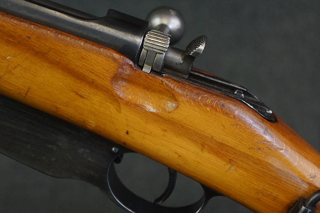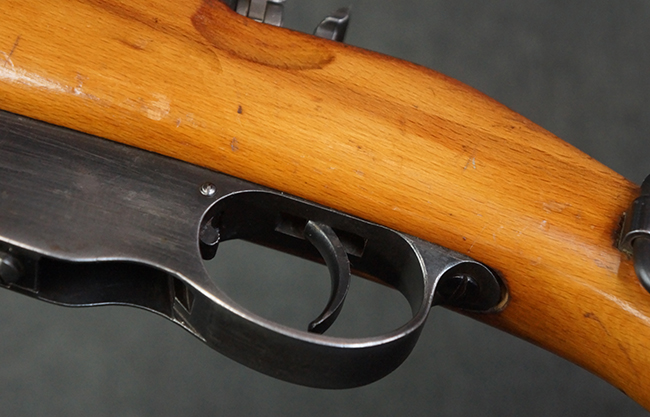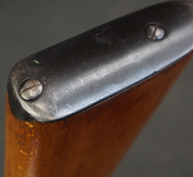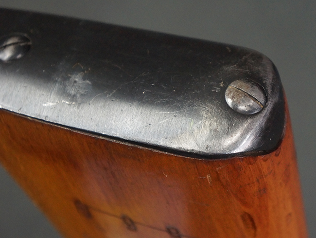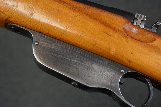 本品の銃身や機関部、弾倉といった金属部は、やや打ち傷や経年による褪色、若干の表面錆痕の他、一部仕上げが薄くなり金属の地肌が表れている箇所が見られるものの、目立った欠損等は見受けられず、概ねしっかりとした状態が保たれています。 木製銃床についても、やや打ち傷や線傷等は見られるものの、現状大きな破損等は見受けられません。 バット・プレートについても、若干の打ち傷や擦れ、僅かな凹みが見られる他、角の部分等に仕上げが落ちて金属の地肌が表れている箇所が見られますが、銃床への取り付けはがたつきもなくしっかりとしています。 リア・サイトの起倒・調整については問題なく行う事が可能です。
