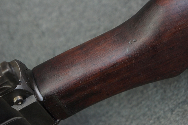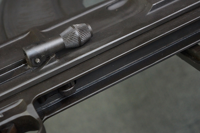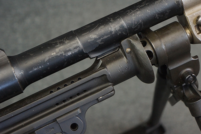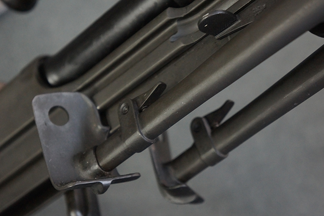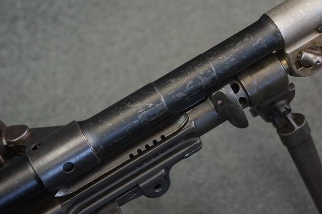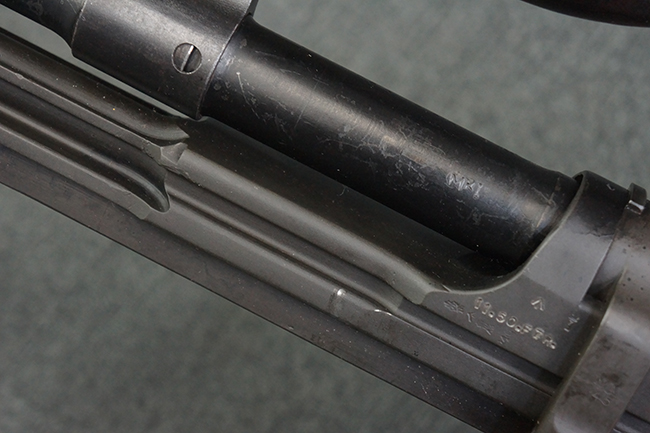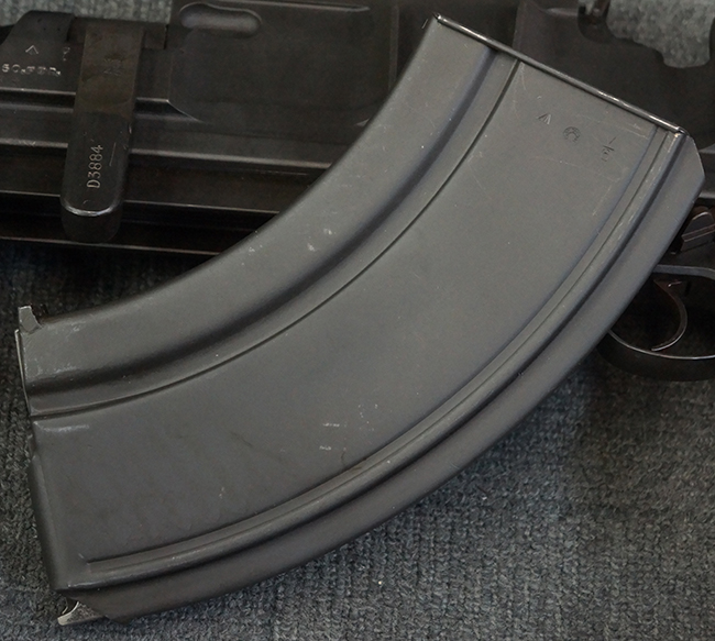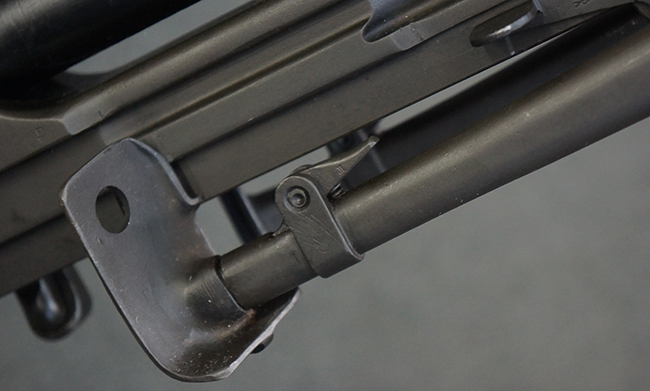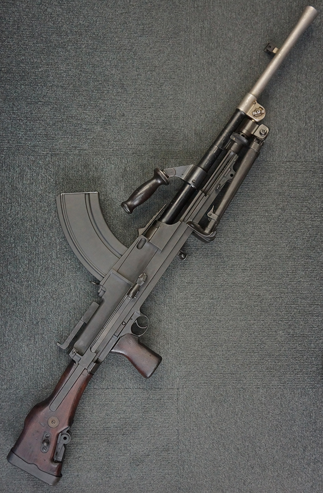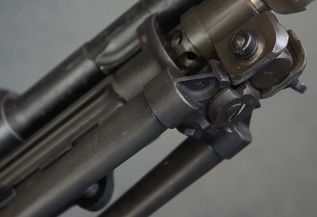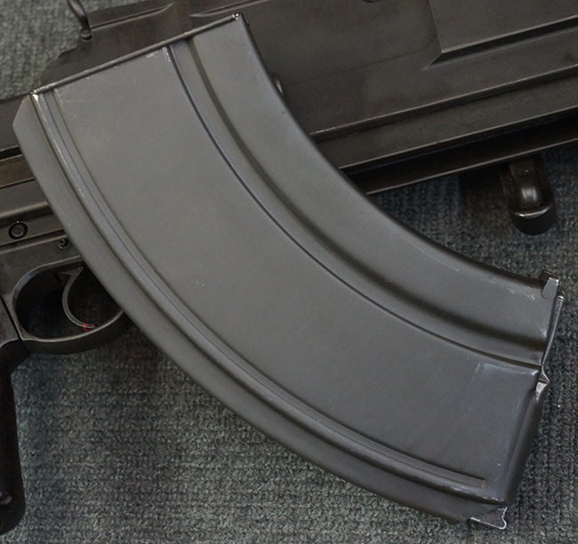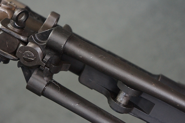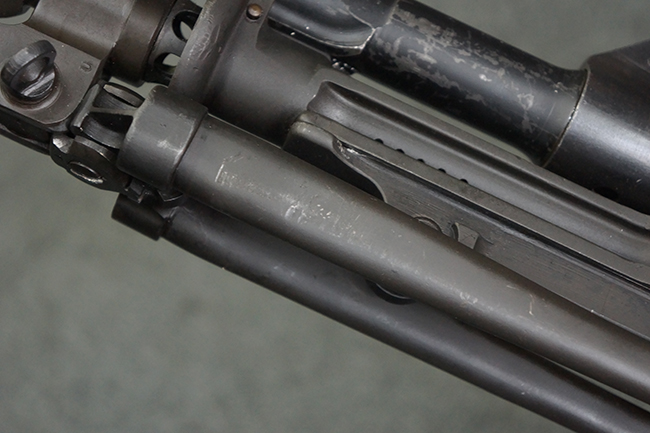 本品の機関部は再整備時のものと思われるパーカー仕上げとなっており、やや小傷や擦れは見られるものの、目立った欠損等は見られず、概ねしっかりとした状態が保たれています。 銃身は黒色焼き付け塗装仕上げとなっており、やや打ち傷や部分的な塗装の剥落が見受けられます。 木製のキャリング・ハンドルやグリップ、バット・ストックについては、やや打ち傷や線傷、表面的な欠けが見られる他は大きな破損等も見られず、比較的良好な状態が保たれています。 二脚の展開/伸縮やダイヤル・サイトの調整、排莢孔及びマガジン取り付け部のダスト・カバーの開閉、キャリング・ハンドルの角度変更、セレクター・レバーの切り替え、マガジンの着脱については問題なく行う事が可能です。 付属のマガジンについては、若干の小傷や擦れを除いて目立った凹みや変形等は見受けられず、概ね良好な状態が保たれています。 尚、マガジン・スプリングは入っています。