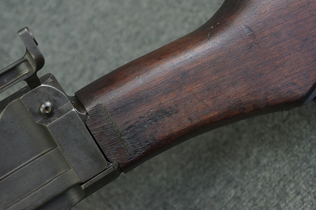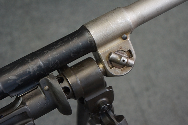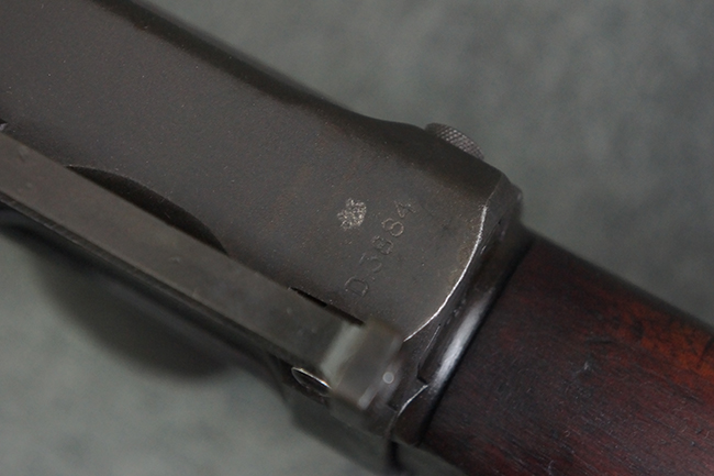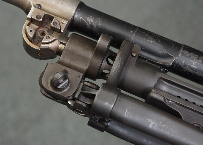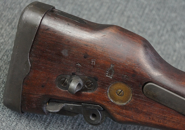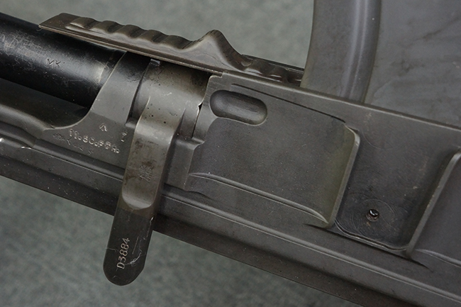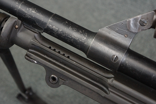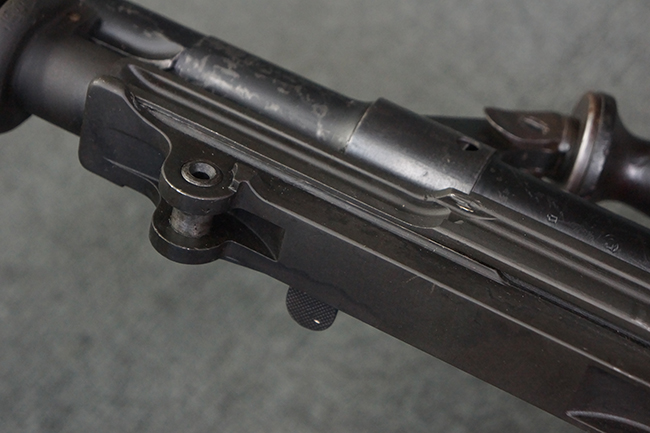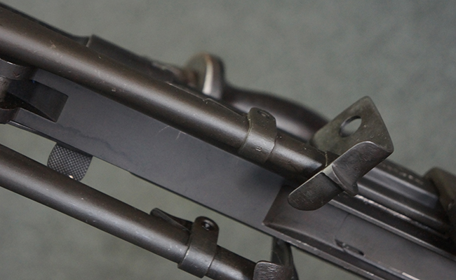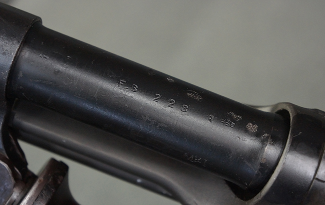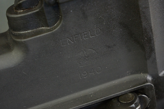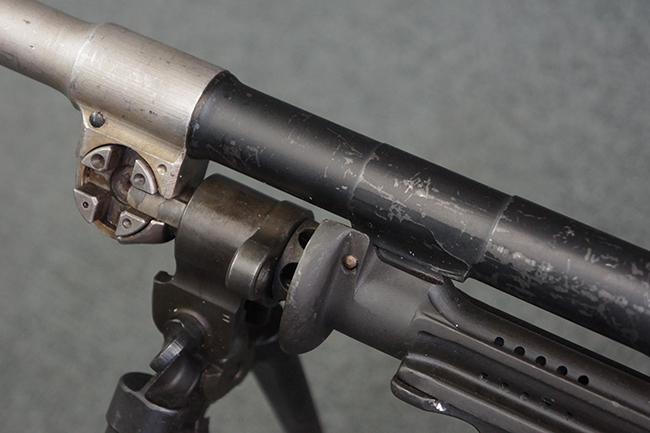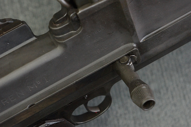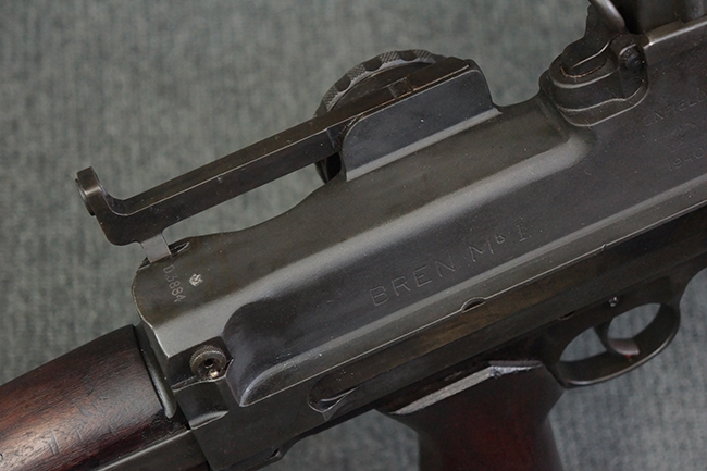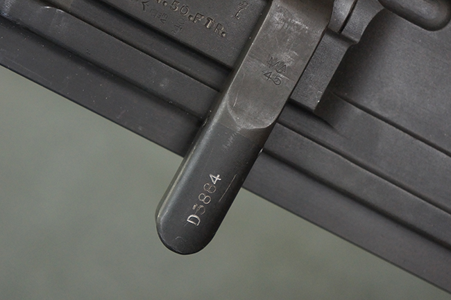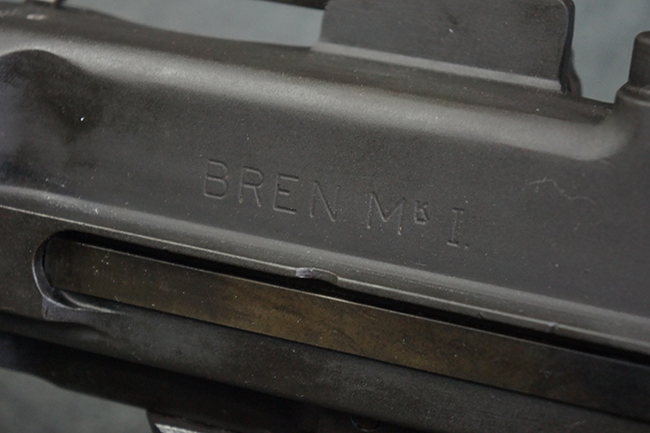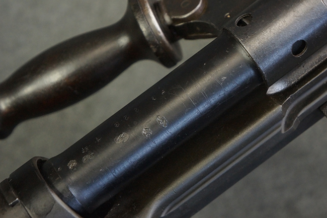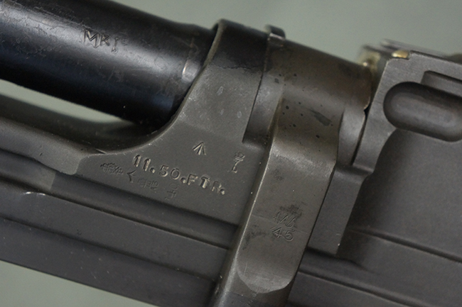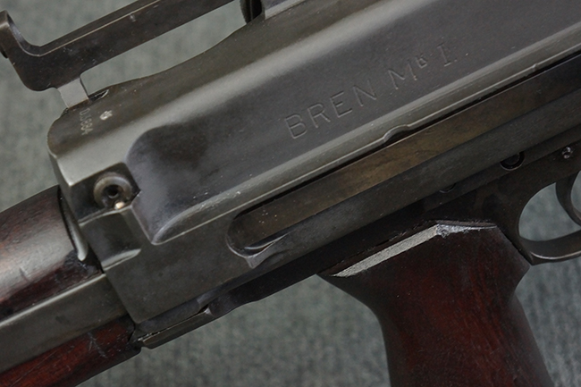 本品のアッパー・レシーバー右側面には「BREN MKI.」のモデル名の他、「ENFIELD 1940」及び王冠の刻印が打たれており、英国のエンフィールド造兵廠で1940年に製造された事が判ります。 レシーバーはブレン Mk I 初期型のもので、戦時生産型のMk Iとは異なり、マガジン・ハウジング左側面に光学照準器用のブラケットを備える他、ガス・シリンダー側面の溝が前方まで伸びた形状となっています。 また、ガス・ディフレクション・シールドが皿型の一体削り出し製で、マガジン・ハウジングの側面に補強リブが加工されているなど、レシーバー各部が凝った作りとなっています。 本品のバット・ストックはサポート・ハンドルが取付け可能ですが、ショルダー・レストがない戦時型Mk Iタイプで、銃身についても先端形状が簡略化された戦時型Mk Iタイプとなっています。 その他、レシーバー左側面前部にブロード・アロー刻印の他、「11.50.FTR」の刻印が確認出来る事から、本品は1950年11月に各部品の強度検査や摩耗した部品等の正規の交換修理であるFTR (Factory Through Repair) を受けた事が窺えます。 また、銃身には「Mk I」の刻印が入っており、銃身交換用ハンドルには、オーストラリアのLITHGOW造兵廠を示す「MA」の刻印及び1945年を示す「45」の刻印、バット・ストックにBSA製を示す刻印が確認出来ます。 アッパー・レシーバー及び銃身交換用レバーにはシリアルNo.D3884が入っており、ロア・レシーバーのシリアルNo.はH6904、銃身はFB228となっています。