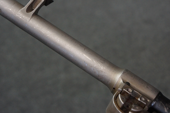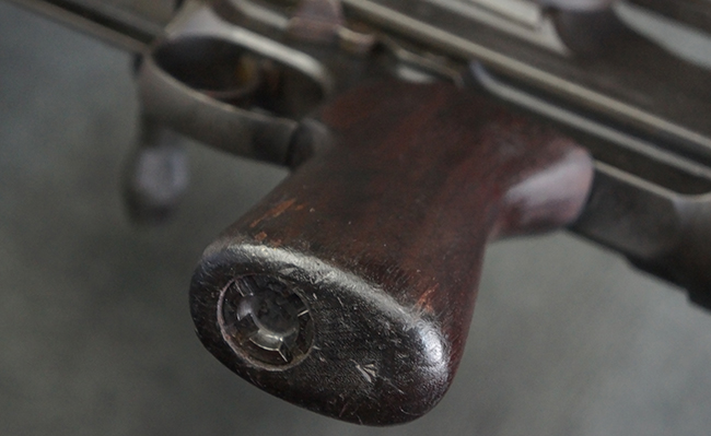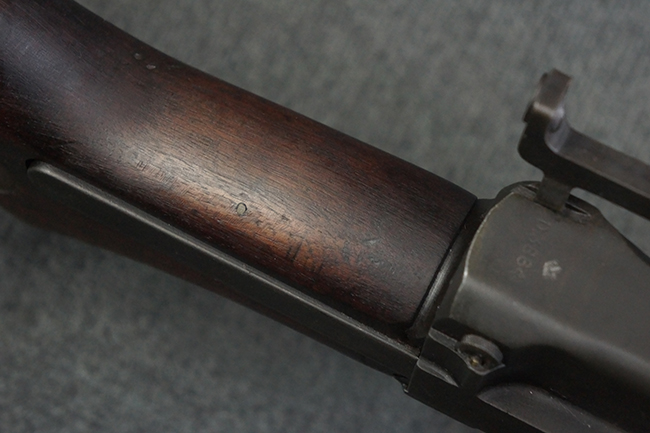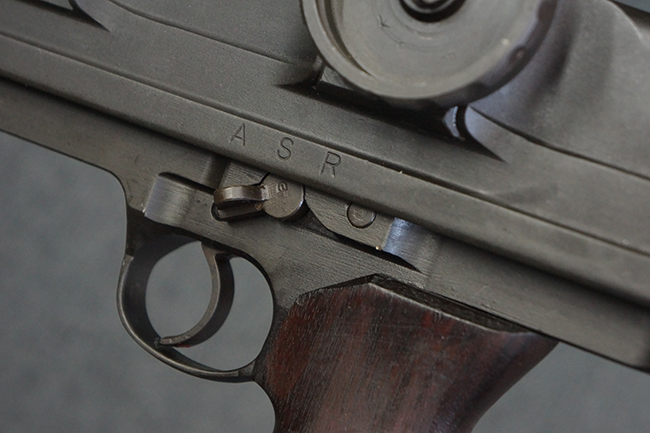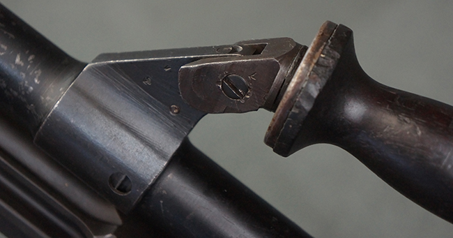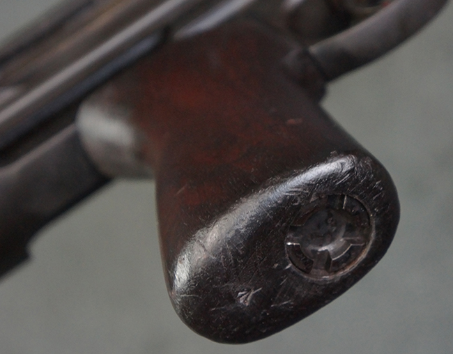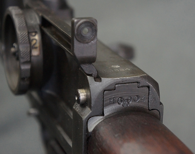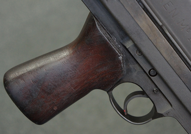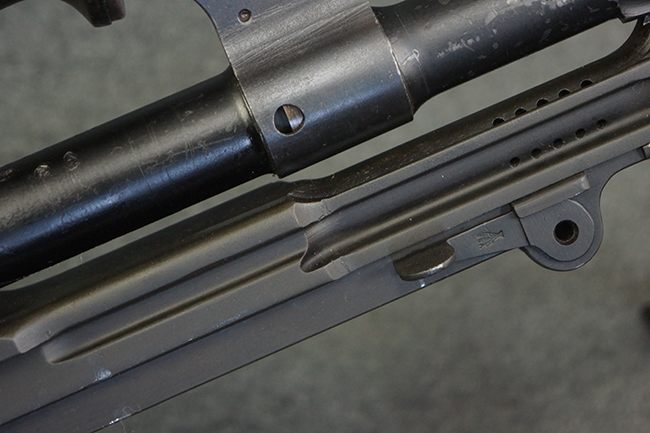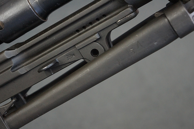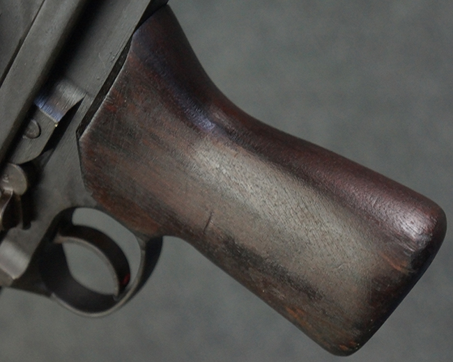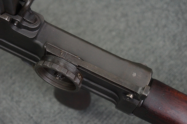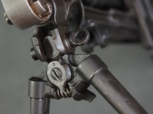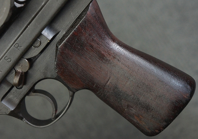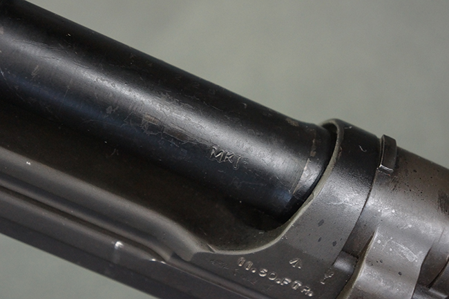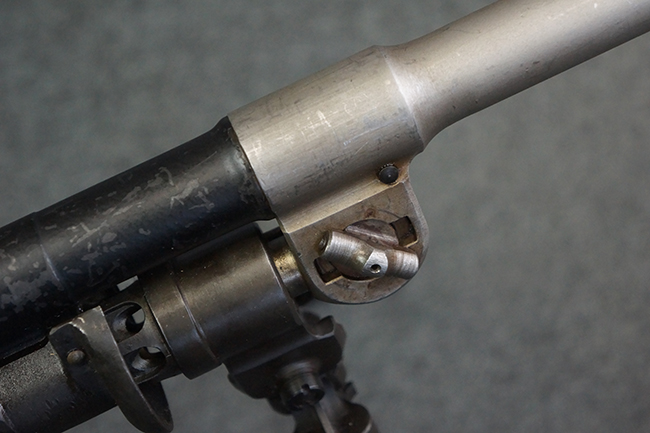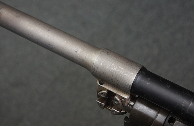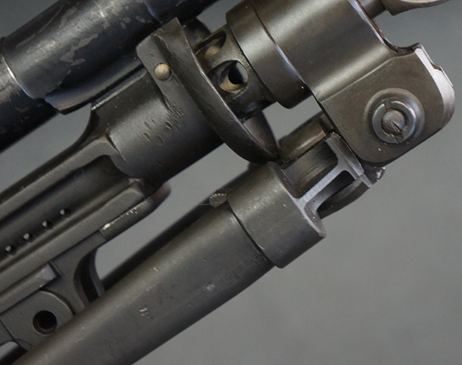 本品のアッパー・レシーバー右側面には「BREN MKI.」のモデル名の他、「ENFIELD 1940」及び王冠の刻印が打たれており、英国のエンフィールド造兵廠で1940年に製造された事が判ります。 レシーバーはブレン Mk I 初期型のもので、戦時生産型のMk Iとは異なり、マガジン・ハウジング左側面に光学照準器用のブラケットを備える他、ガス・シリンダー側面の溝が前方まで伸びた形状となっています。 また、ガス・ディフレクション・シールドが皿型の一体削り出し製で、マガジン・ハウジングの側面に補強リブが加工されているなど、レシーバー各部が凝った作りとなっています。 本品のバット・ストックはサポート・ハンドルが取付け可能ですが、ショルダー・レストがない戦時型Mk Iタイプで、銃身についても先端形状が簡略化された戦時型Mk Iタイプとなっています。 その他、レシーバー左側面前部にブロード・アロー刻印の他、「11.50.FTR」の刻印が確認出来る事から、本品は1950年11月に各部品の強度検査や摩耗した部品等の正規の交換修理であるFTR (Factory Through Repair) を受けた事が窺えます。 また、銃身には「Mk I」の刻印が入っており、銃身交換用ハンドルには、オーストラリアのLITHGOW造兵廠を示す「MA」の刻印及び1945年を示す「45」の刻印、バット・ストックにBSA製を示す刻印が確認出来ます。 アッパー・レシーバー及び銃身交換用レバーにはシリアルNo.D3884が入っており、ロア・レシーバーのシリアルNo.はH6904、銃身はFB228となっています。