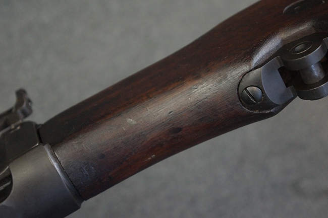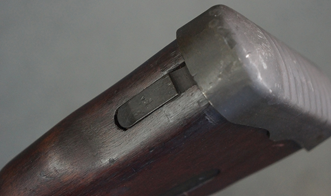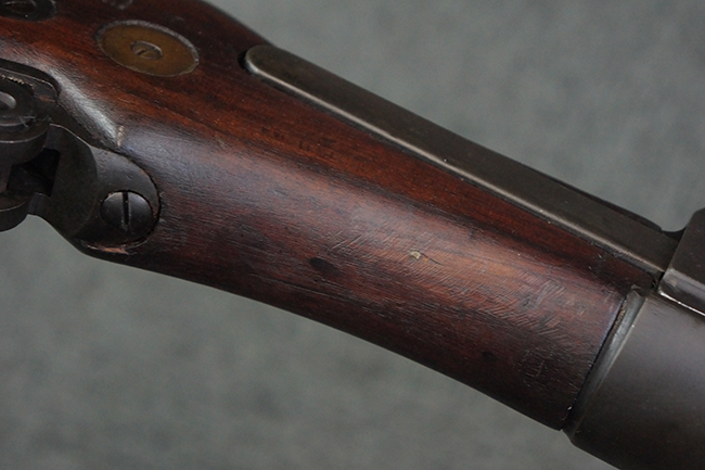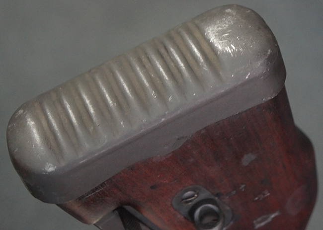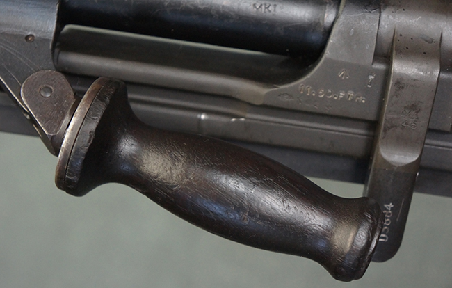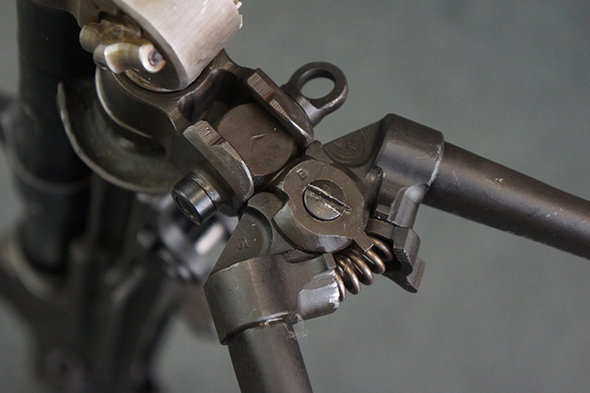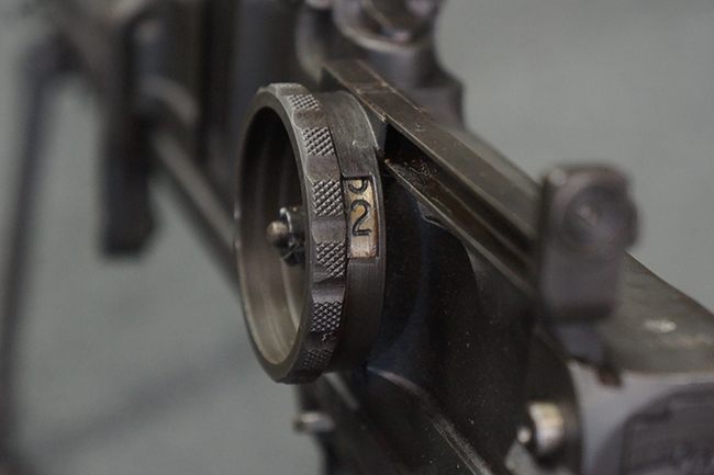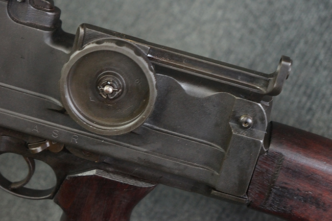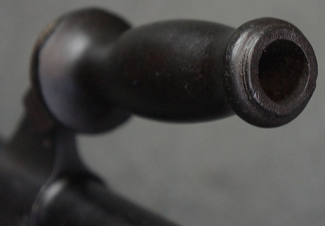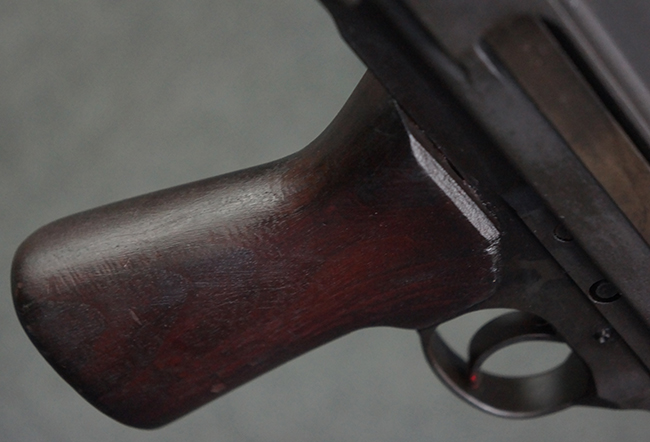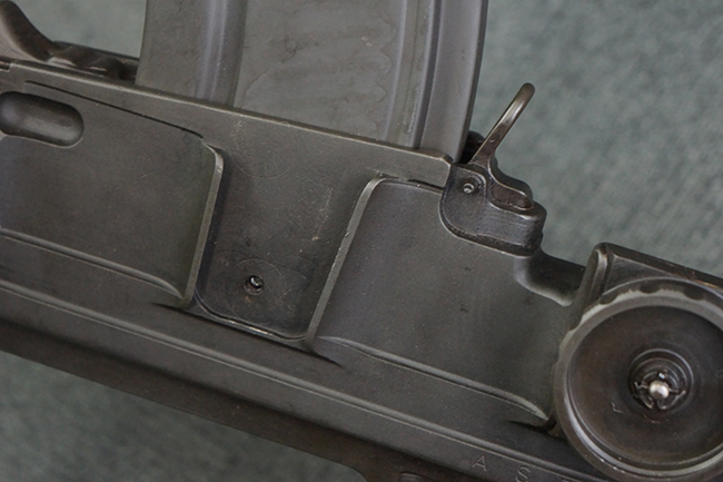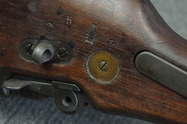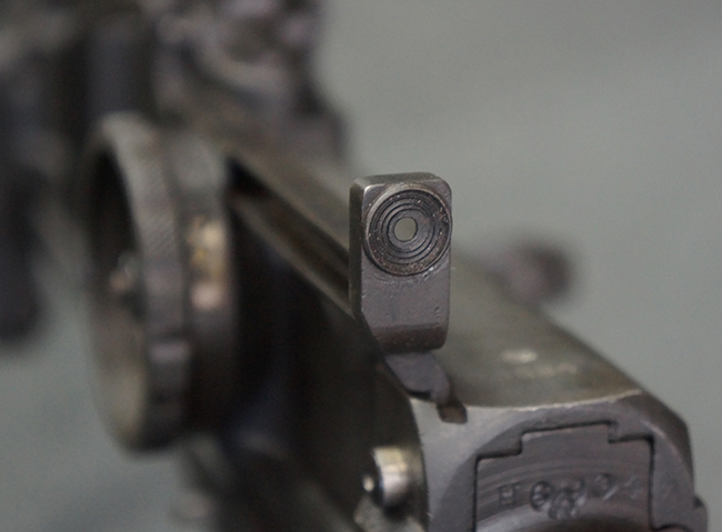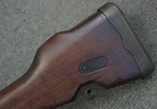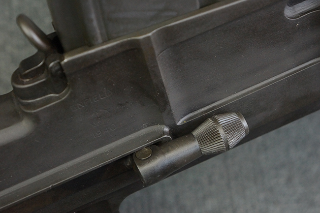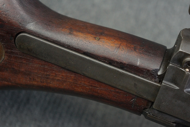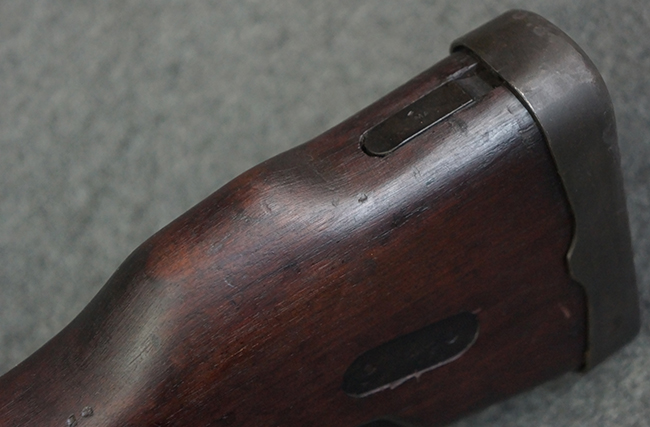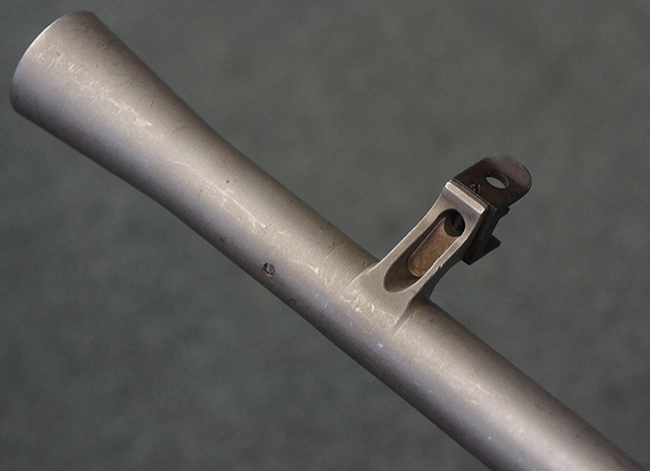 本品のアッパー・レシーバー右側面には「BREN MKI.」のモデル名の他、「ENFIELD 1940」及び王冠の刻印が打たれており、英国のエンフィールド造兵廠で1940年に製造された事が判ります。 レシーバーはブレン Mk I 初期型のもので、戦時生産型のMk Iとは異なり、マガジン・ハウジング左側面に光学照準器用のブラケットを備える他、ガス・シリンダー側面の溝が前方まで伸びた形状となっています。 また、ガス・ディフレクション・シールドが皿型の一体削り出し製で、マガジン・ハウジングの側面に補強リブが加工されているなど、レシーバー各部が凝った作りとなっています。 本品のバット・ストックはサポート・ハンドルが取付け可能ですが、ショルダー・レストがない戦時型Mk Iタイプで、銃身についても先端形状が簡略化された戦時型Mk Iタイプとなっています。 その他、レシーバー左側面前部にブロード・アロー刻印の他、「11.50.FTR」の刻印が確認出来る事から、本品は1950年11月に各部品の強度検査や摩耗した部品等の正規の交換修理であるFTR (Factory Through Repair) を受けた事が窺えます。 また、銃身には「Mk I」の刻印が入っており、銃身交換用ハンドルには、オーストラリアのLITHGOW造兵廠を示す「MA」の刻印及び1945年を示す「45」の刻印、バット・ストックにBSA製を示す刻印が確認出来ます。 アッパー・レシーバー及び銃身交換用レバーにはシリアルNo.D3884が入っており、ロア・レシーバーのシリアルNo.はH6904、銃身はFB228となっています。