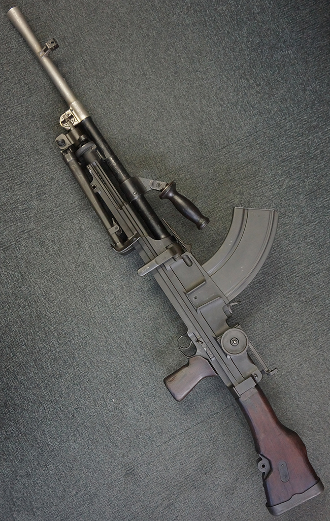 第二次世界大戦で使用された英軍の主要軽機関銃です。 第一次世界大戦後の1920年代、英軍はそれまでの主力軽機関銃であったルイス軽機関銃に代わる新たな軽機関銃のトライアルを開始しました。 1930年代に入るとチェコ製のZB Vz.26の改良型であるZB Vz.27軽機関銃 (後に更なる改良型のZB Vz.30軽機関銃) を新たに候補に加えてトライアルが続けられ、最終的にはこのZB系軽機関銃に改良を加えた物がブレン軽機関銃 (ブレンガン) として英軍に制式採用されました。 ブレン (BREN) の名称は、チェコのブルーノ (Brno) 造兵廠と英国のエンフィールド (Enfield) 造兵廠の名称を組み合わせた物です。 ブレン軽機関銃では.303ブリティッシュ弾を使用する事から、マガジンはバナナ型の形状に変更されています。