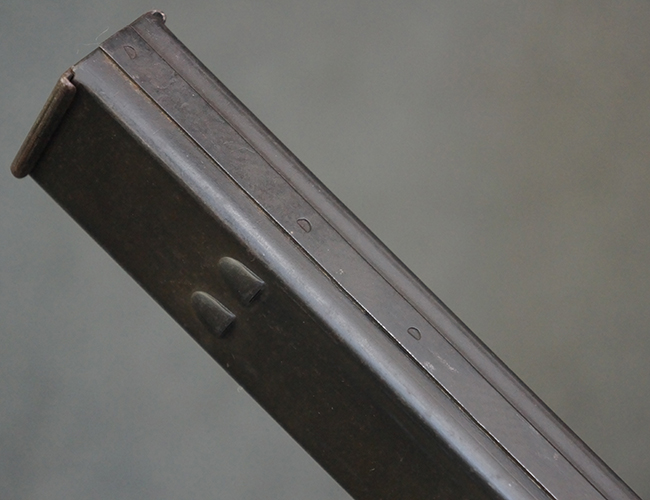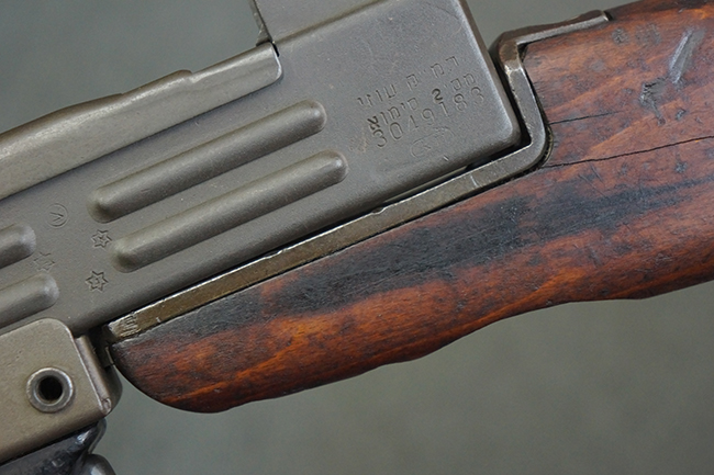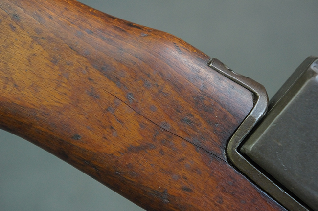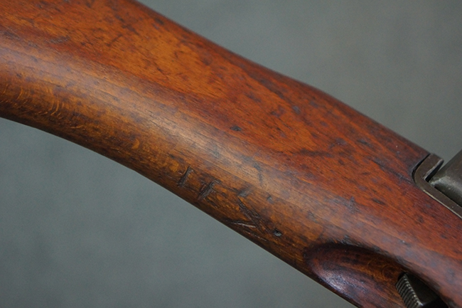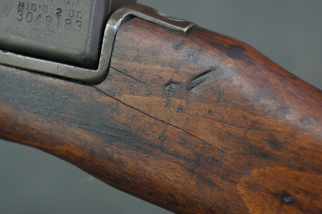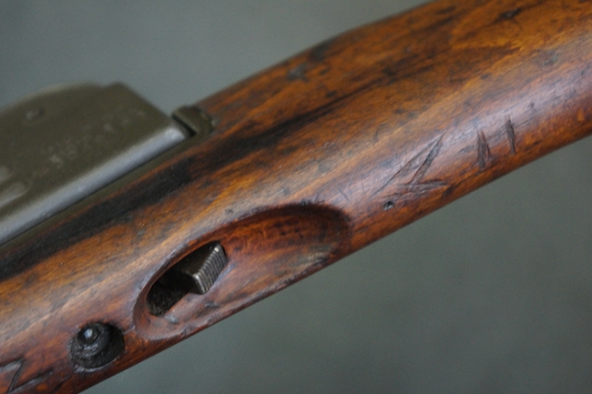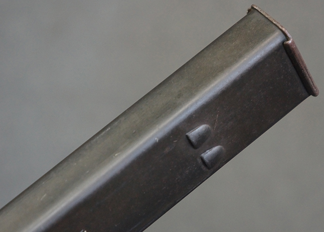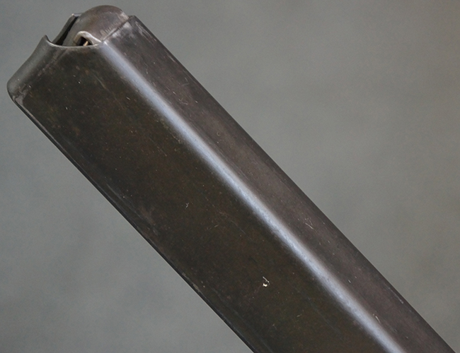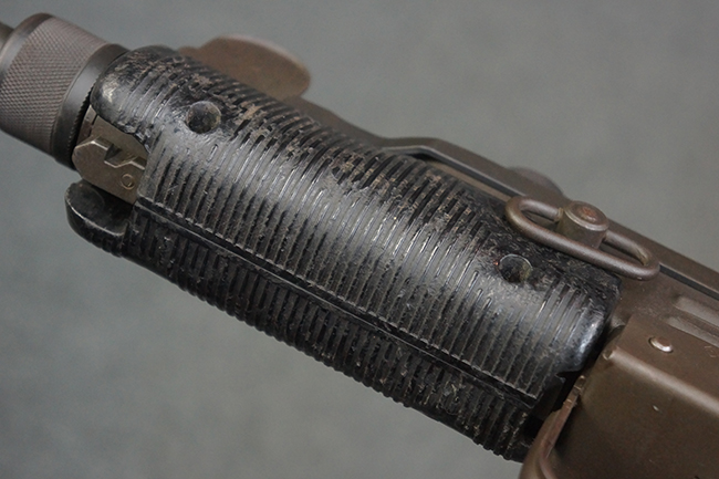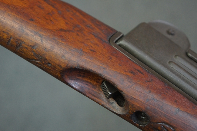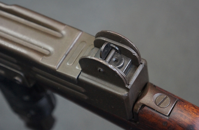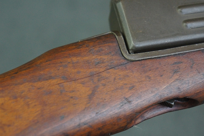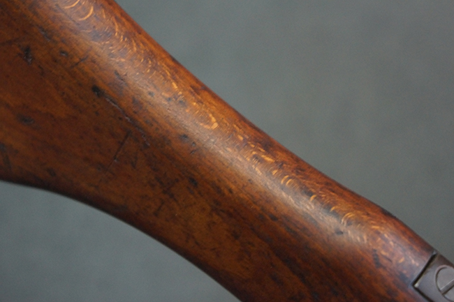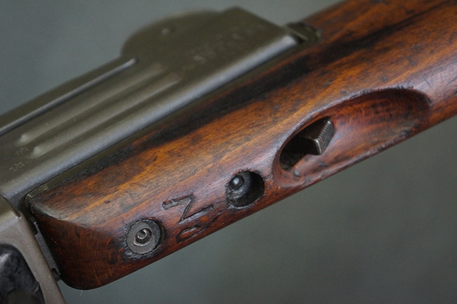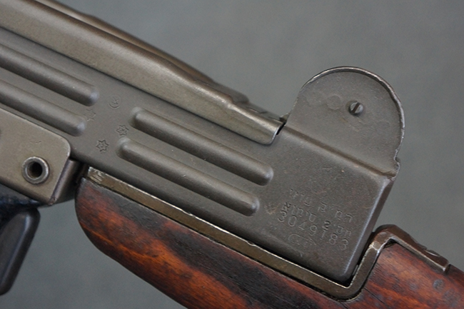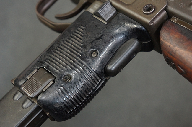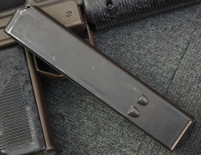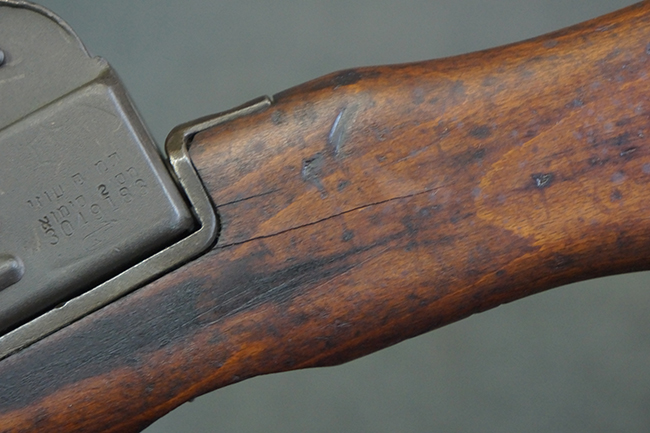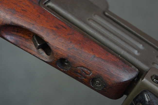 本品の金属部はやや打ち傷や経年による褪色が見られるものの、大きな破損や欠損、変形等は見受けられず、レシーバーのパーカー仕上げも比較的良好に残っています。 レシーバー・カバーの色合いはレシーバーと概ねマッチしていますが、コッキング・ハンドルのみやや黒みがかった色合いとなっています。 樹脂製のハンドガード及びグリップは、全体に打ち傷や摩耗が目立ちますが、現状大きな破損等は見受けられません。 グリップの取り付けには僅かに遊びが見られます。 アッパー・レシーバーとロア・レシーバーの取り付けについては、現状目立ったがたつきなどは見られません。 木製銃床についても、やや打ち傷や線傷の他、取付基部の両側面にひびが見られますが、強度的には比較的しっかりとした状態が保たれています。 尚、バット・ストック下部に手彫りによる文字が入っています。 マガジンの着脱やリア・サイトの切り替えについては問題なく行う事が可能です。 セレクターの切り替えについても問題なく、安全位置でトリガーがロックされます。 尚、グリップ・セーフティについては加工により機能しなくなっています。 付属のマガジンは25連タイプで、やや小傷や擦れ、若干の表面錆は見られるものの、目立った凹みや変形等は見られず、表面仕上げも比較的良好に残っています。 尚、マガジン・スプリングは入っています。