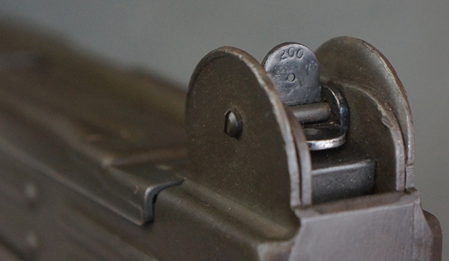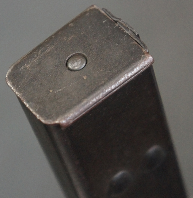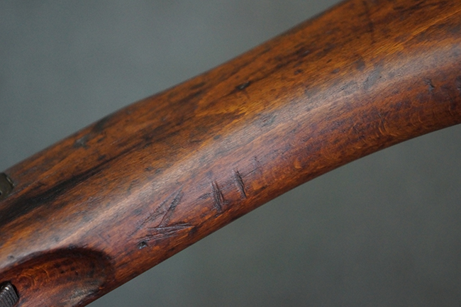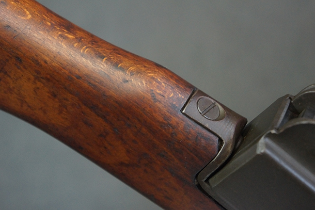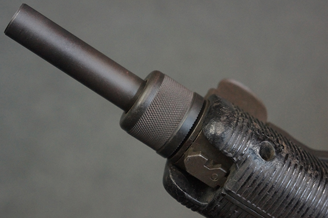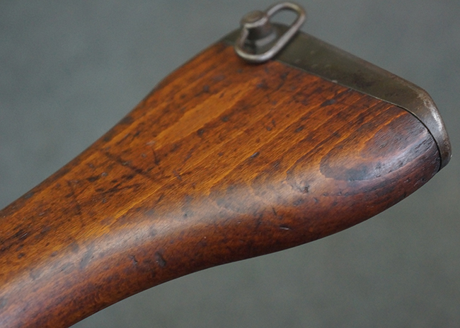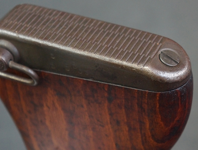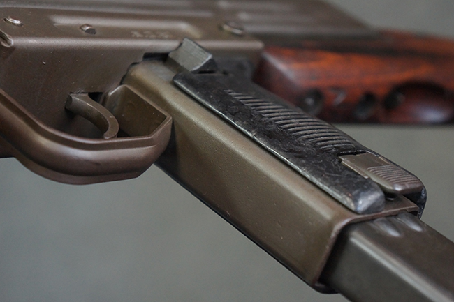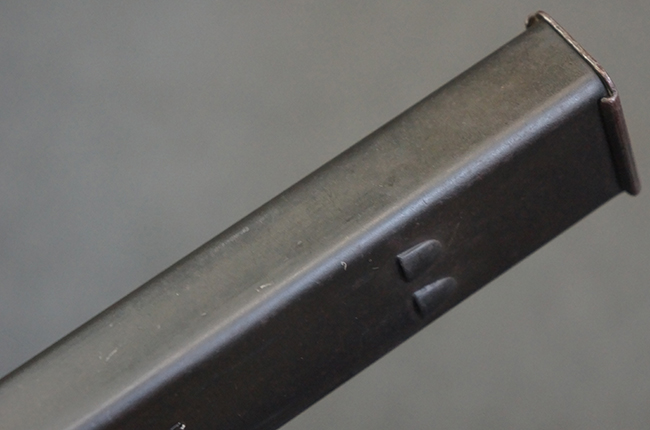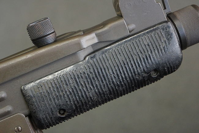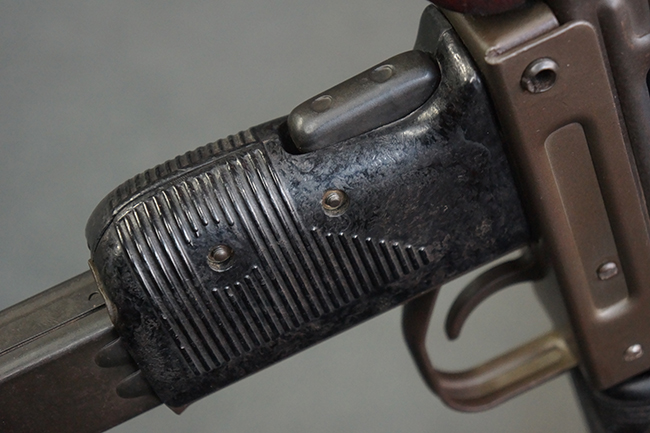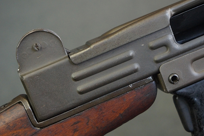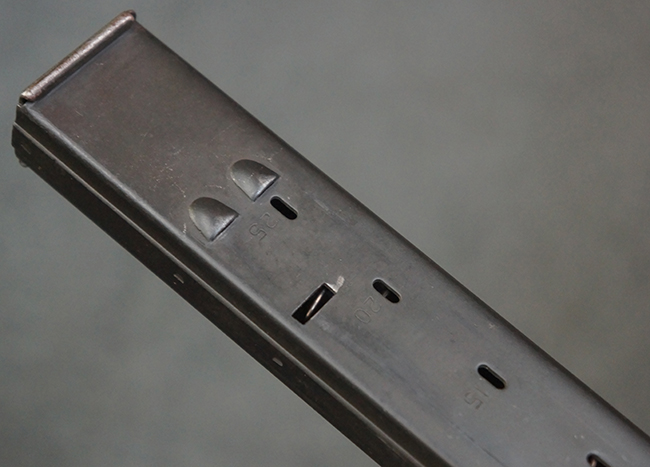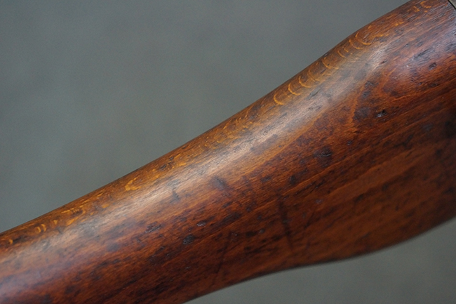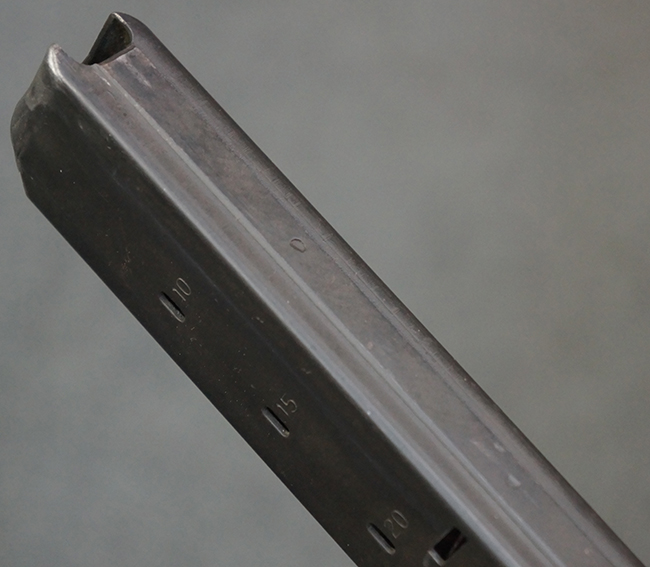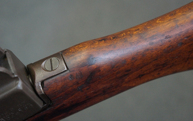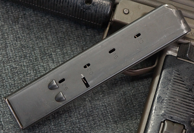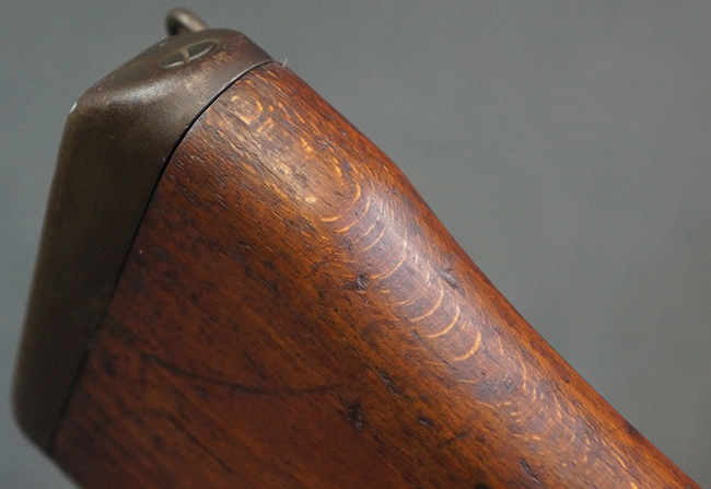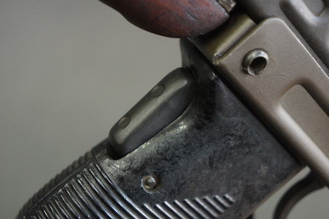 本品の金属部はやや打ち傷や経年による褪色が見られるものの、大きな破損や欠損、変形等は見受けられず、レシーバーのパーカー仕上げも比較的良好に残っています。 レシーバー・カバーの色合いはレシーバーと概ねマッチしていますが、コッキング・ハンドルのみやや黒みがかった色合いとなっています。 樹脂製のハンドガード及びグリップは、全体に打ち傷や摩耗が目立ちますが、現状大きな破損等は見受けられません。 グリップの取り付けには僅かに遊びが見られます。 アッパー・レシーバーとロア・レシーバーの取り付けについては、現状目立ったがたつきなどは見られません。 木製銃床についても、やや打ち傷や線傷の他、取付基部の両側面にひびが見られますが、強度的には比較的しっかりとした状態が保たれています。 尚、バット・ストック下部に手彫りによる文字が入っています。 マガジンの着脱やリア・サイトの切り替えについては問題なく行う事が可能です。 セレクターの切り替えについても問題なく、安全位置でトリガーがロックされます。 尚、グリップ・セーフティについては加工により機能しなくなっています。 付属のマガジンは25連タイプで、やや小傷や擦れ、若干の表面錆は見られるものの、目立った凹みや変形等は見られず、表面仕上げも比較的良好に残っています。 尚、マガジン・スプリングは入っています。