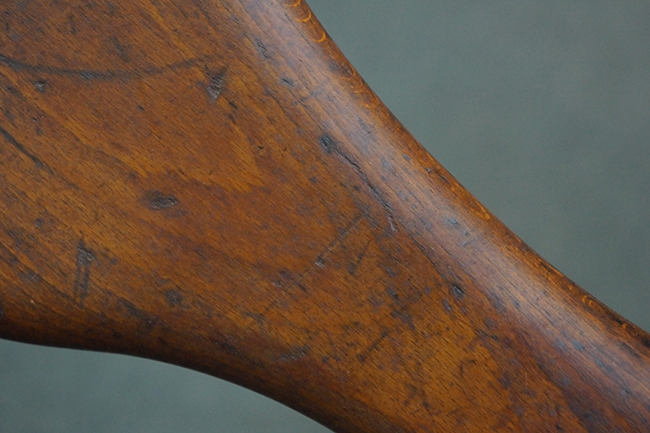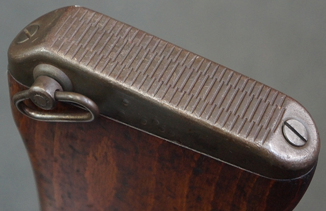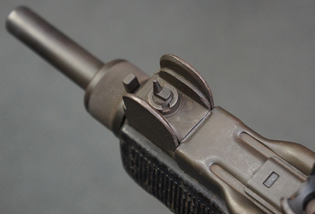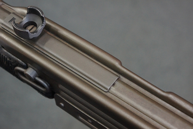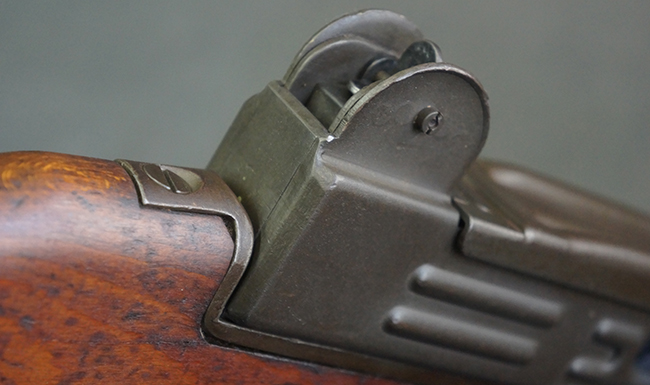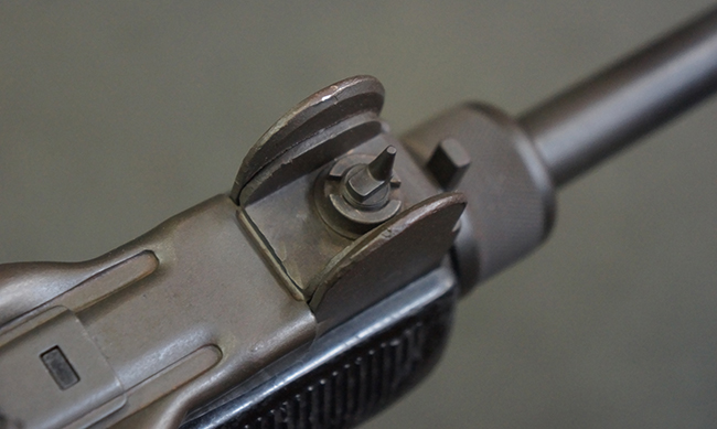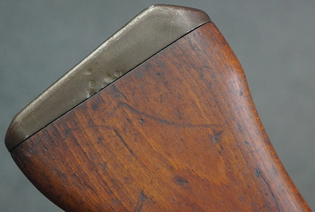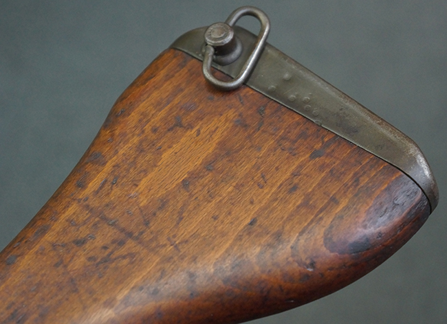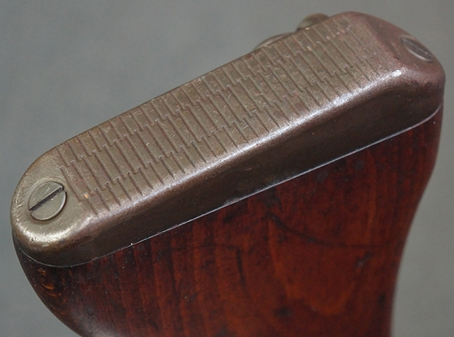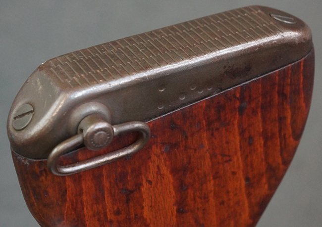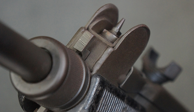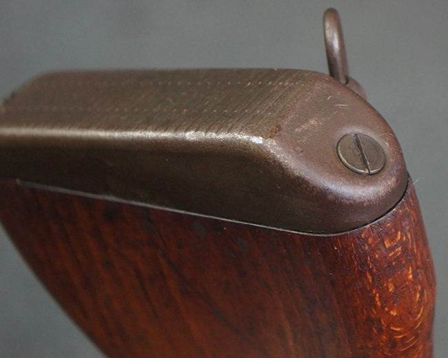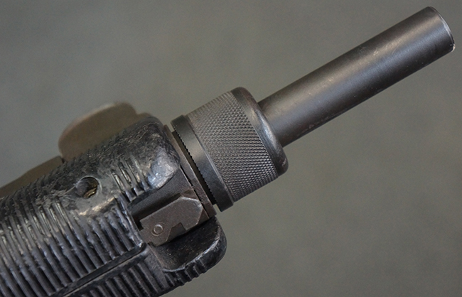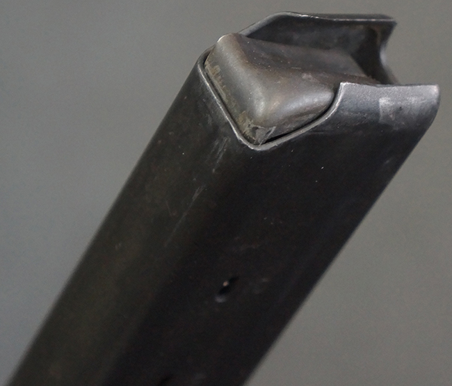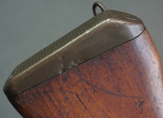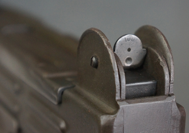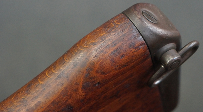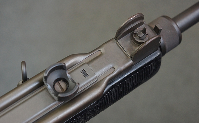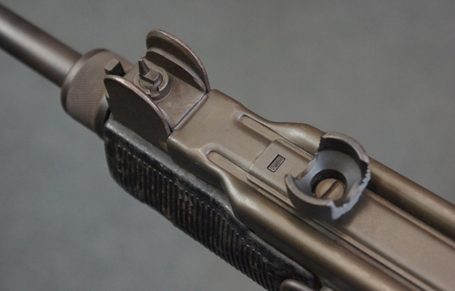 本品の金属部はやや打ち傷や経年による褪色が見られるものの、大きな破損や欠損、変形等は見受けられず、レシーバーのパーカー仕上げも比較的良好に残っています。 レシーバー・カバーの色合いはレシーバーと概ねマッチしていますが、コッキング・ハンドルのみやや黒みがかった色合いとなっています。 樹脂製のハンドガード及びグリップは、全体に打ち傷や摩耗が目立ちますが、現状大きな破損等は見受けられません。 グリップの取り付けには僅かに遊びが見られます。 アッパー・レシーバーとロア・レシーバーの取り付けについては、現状目立ったがたつきなどは見られません。 木製銃床についても、やや打ち傷や線傷の他、取付基部の両側面にひびが見られますが、強度的には比較的しっかりとした状態が保たれています。 尚、バット・ストック下部に手彫りによる文字が入っています。 マガジンの着脱やリア・サイトの切り替えについては問題なく行う事が可能です。 セレクターの切り替えについても問題なく、安全位置でトリガーがロックされます。 尚、グリップ・セーフティについては加工により機能しなくなっています。 付属のマガジンは25連タイプで、やや小傷や擦れ、若干の表面錆は見られるものの、目立った凹みや変形等は見られず、表面仕上げも比較的良好に残っています。 尚、マガジン・スプリングは入っています。