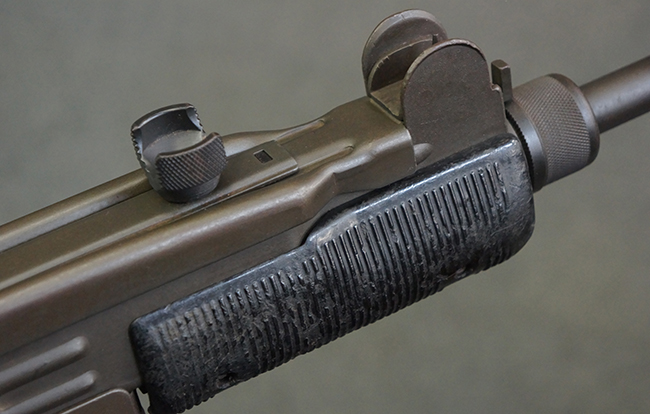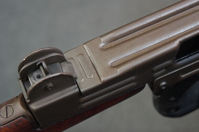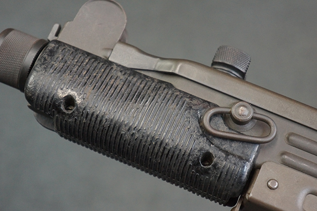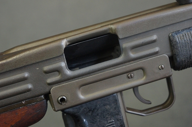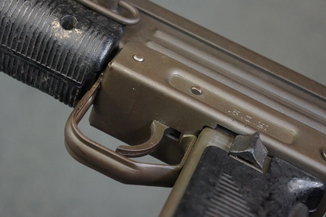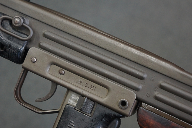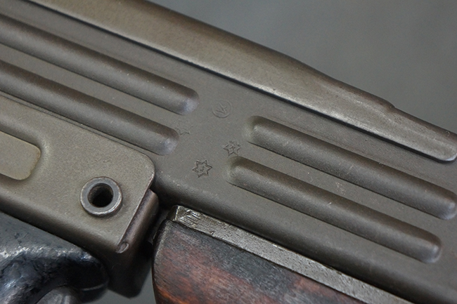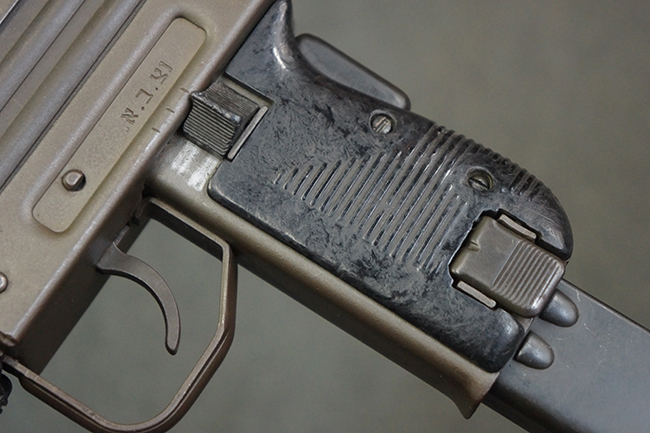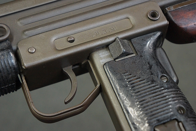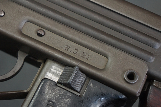 本品は木製ストックが付いたタイプのUZI短機関銃です。 セレクター表記はヘブライ語で、レシーバー左側面後部にはシリアルNo.や検査刻印が確認出来ますが、イスラエル国防軍(IDF)のロゴは非常に薄くなっています。