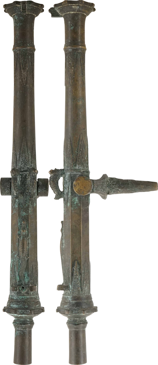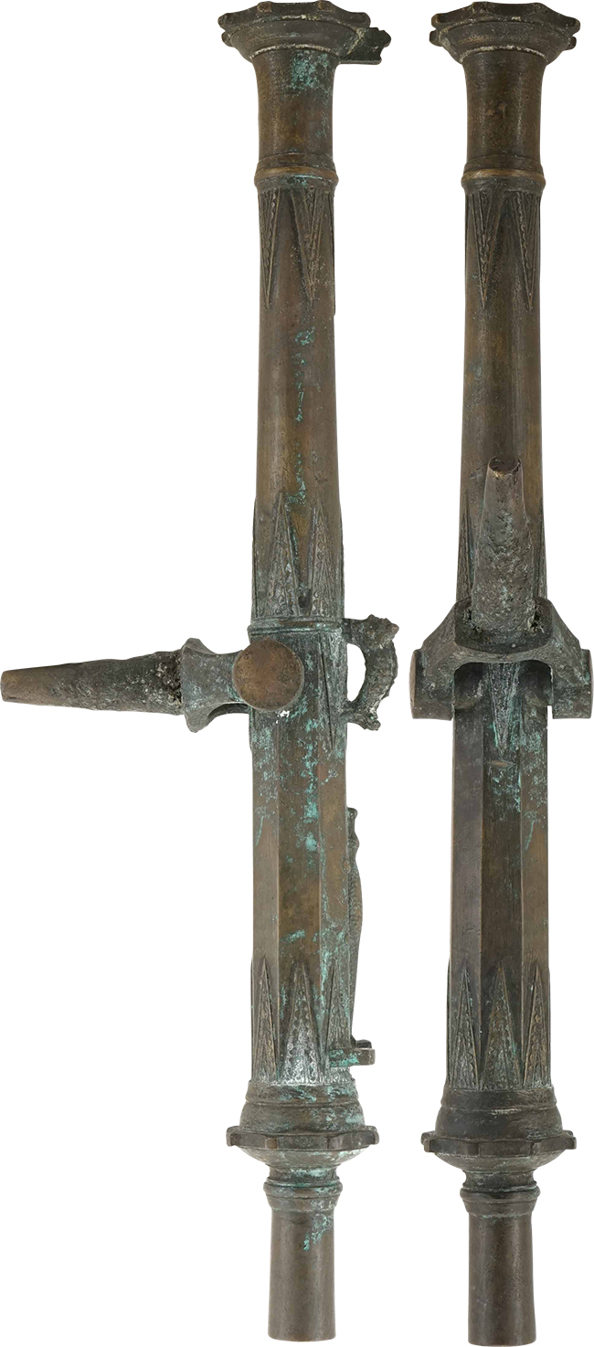 本品は全長810mm、口径26mm、重量約15.1kgと立派で見栄えのする品です。 外観は典型的なランタカ砲の作りとなっており、砲口部分は「隅切反り八角形/八ツ日足形」と呼ばれる放射状に8箇所の突起が設けられており、砲身の前後には鋸歯文 (きょしもん) を組み合わせた文様が施されています。 砲身中心部分上部にドルフィンのような形をした装飾を兼ねたと取っ手が二ヶ所付いており、その前後にも鋸歯文が施されています。 また、砲身後部上面にはワニを象った装飾が入っているのも東南アジアらしい雰囲気を醸し出しています。 砲身後端には砲身に比べて一回り小さい径の円筒状の部分が設けられていますが、これは砲身の射角を操作する際の取手として機能したと思われます。 砲口上部に照星が設けられており、指火式の点火孔の左右には照門として機能すると思われる突起が設けられています。