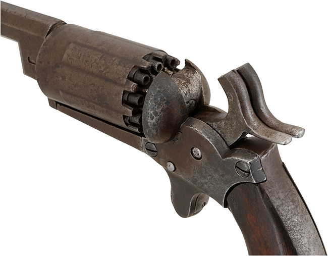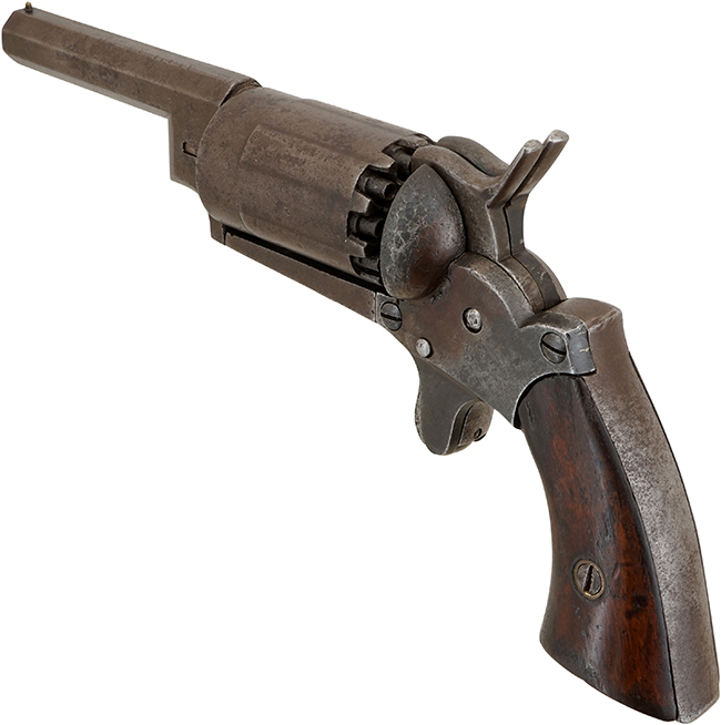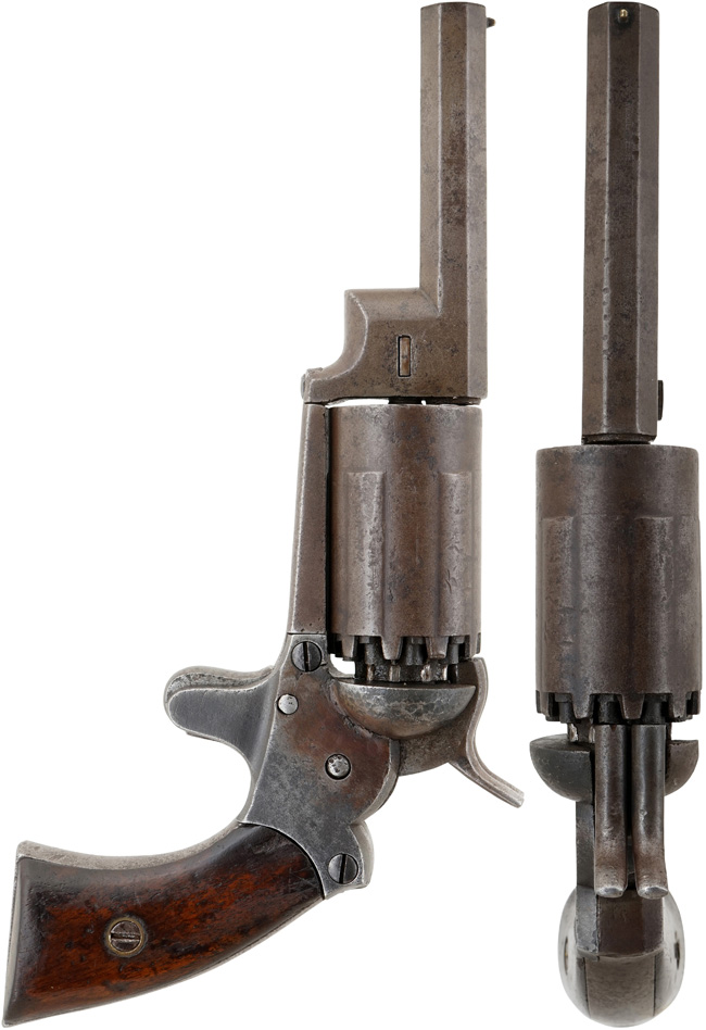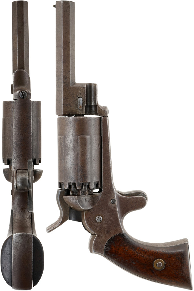 その後、金属薬莢を使用するリム・ファイア式の弾薬が普及し、スミス & ウェッソン社などが貫通式シリンダーを備えた新型リボルバーを市場に投入した事で、複雑な重ね装填機構を必要とした本銃の優位性は失われていきました。 しかしながら、本銃が提示した「装弾数の増加による火力の最大化」というコンセプトは、その後の兵器開発における重要なテーマの一つであり、その独特なメカニズムもあいまって、自動火器が登場する以前の試行錯誤の歴史を象徴するモデルといえます。 (KK)