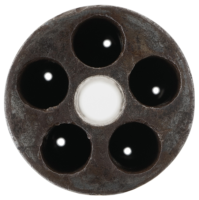 1つの薬室に2発装填可能な長いシリンダーや10個のパーカッション・ニップル、シーケンシャル・トリガーにより順番に作動する2本のハンマーなど、他に類を見ない独自の機構を備えた、見所の多いリボルバーです。 (KK)