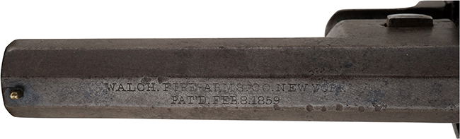 本品はウォルチ・リボルバーの中でも小型のポケット・モデルで、.31口径で5つの薬室を備え、装弾数は10発となっています。 ポケット・モデルのため、携行性を重視してローディング・レバーは当初から備えておりません。 トリガーは一本のみで、シーケンシャル・トリガー方式により作動し、2本のハンマーがトリガーを引く量に応じて右側から順番に撃発を行います。 尚、本品はフレームが鉄製のモデルとなっています。 本品の銃身上面には「WALCH. FIRE-ARMS. CO. NEW YORK」のメーカー刻印及び「PAT'D. FEB.8.1859」のパテント刻印がニ行にわたって打刻されています。 グリップを取り外したグリップ・フレーム左側面には1629のシリアルNo.が打刻されています。