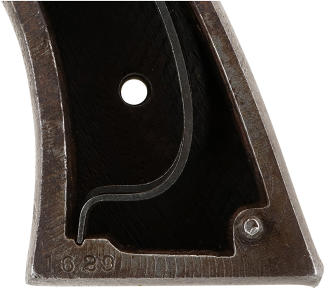 本品は全体に適度な時代が付いており、銃身やフレーム、シリンダーといった鉄部にはやや打ち傷や経年による褪色、若干の時代錆が見られます。 木製グリップについても、やや打ち傷や線傷、擦れ等が見られる他、左側グリップの取付基部付近に僅かな欠けやヘアライン・クラックが見られるものの、取り付け自体はがたつきもなくしっかりとしており、オリジナルの艶のある仕上げも比較的残っています。 ハンマー取り付け基部付近のフレームに一部クラックが見られる他、フレーム左側面のサイド・プレートについても、リコイル・シールドとの境界付近に古い補修痕が見られ、前部取り付けネジ付近に僅かにクラックが見られますが、現状強度的には比較的しっかりとした状態が保たれています。 銃身とフレームの取り付けについては、バレル・ウェッジに加えて、フレーム前端の下部からさらにネジ1本で固定される構造となっており、目立ったがたつき等は見受けられません。
