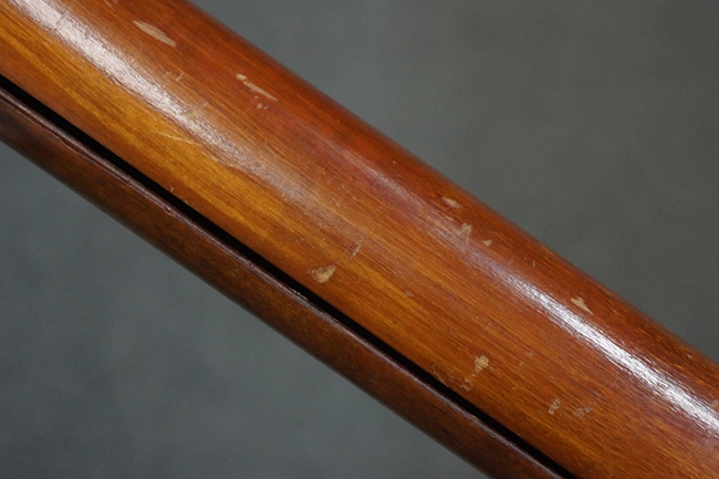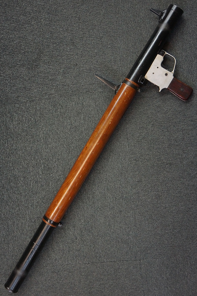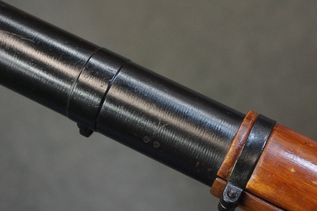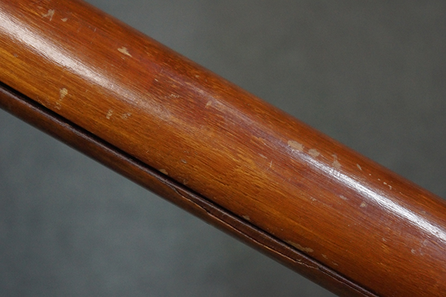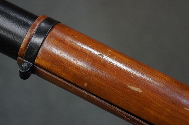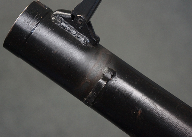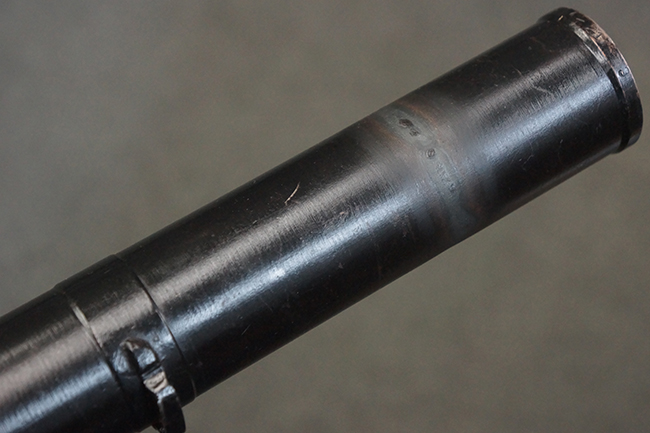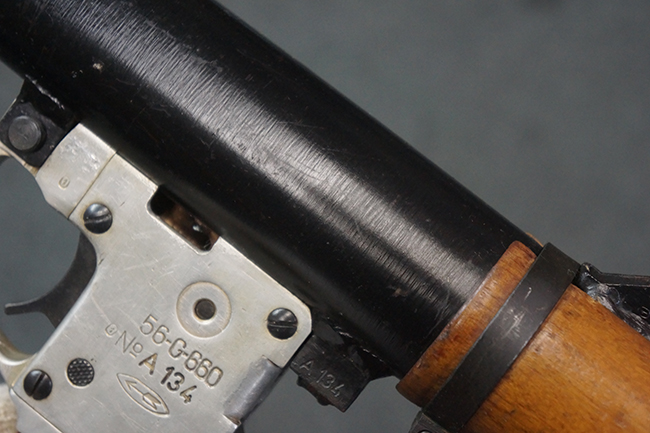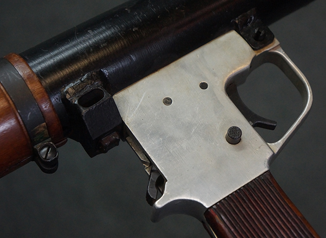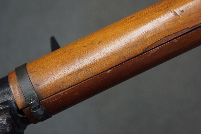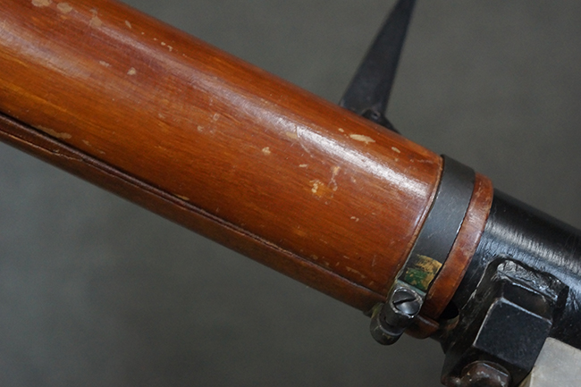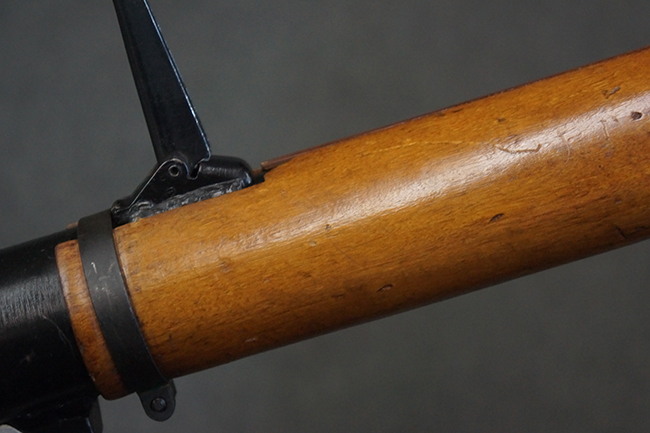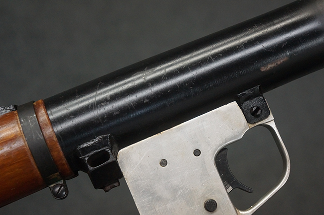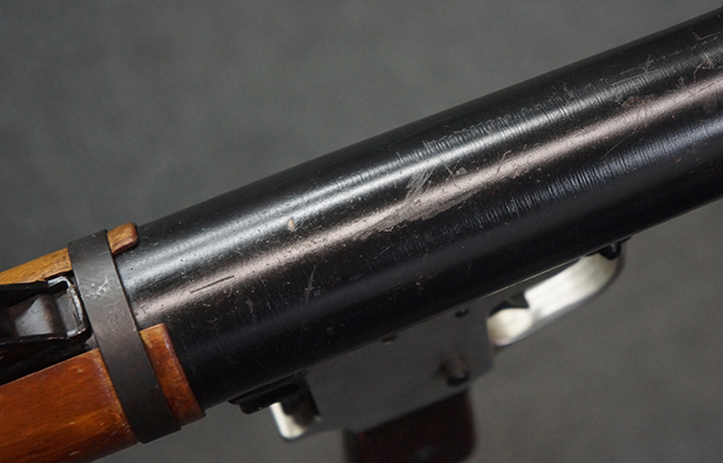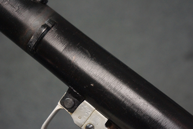本品の黒色焼付塗装仕上げの発射筒はやや小傷や擦れの他、一部に塗装の剥落が見受けられるものの、大きな破損や欠損等は見受けられず、概ね良好な状態が保たれています。 発射筒前部及び後部に無可動加工に伴う塗膜表面の荒れが一部見られます。 トリガー・ハウジングについても同様に若干の打ち傷は見受けられますが、こちらも目立った欠損等は見受けられません。 木製のヒート・シールドやグリップ・パネルは、やや打ち傷や線傷が散見される他、一部に木部表面が浮いている箇所や若干の欠けが見受けられます。