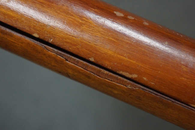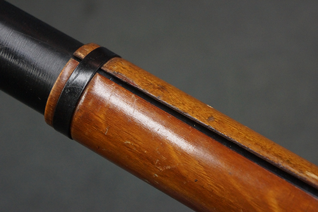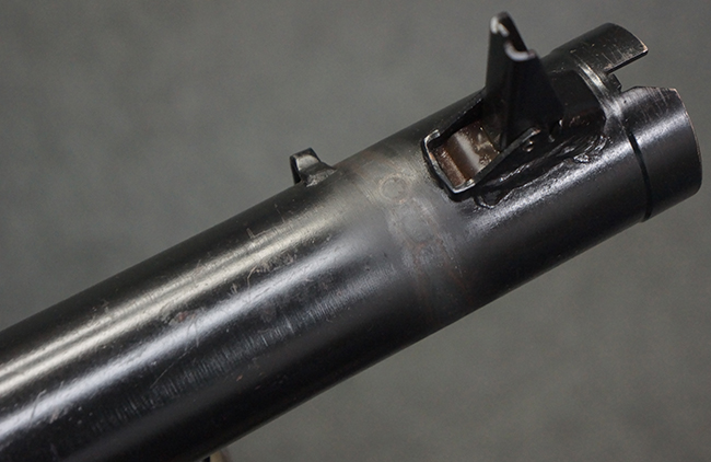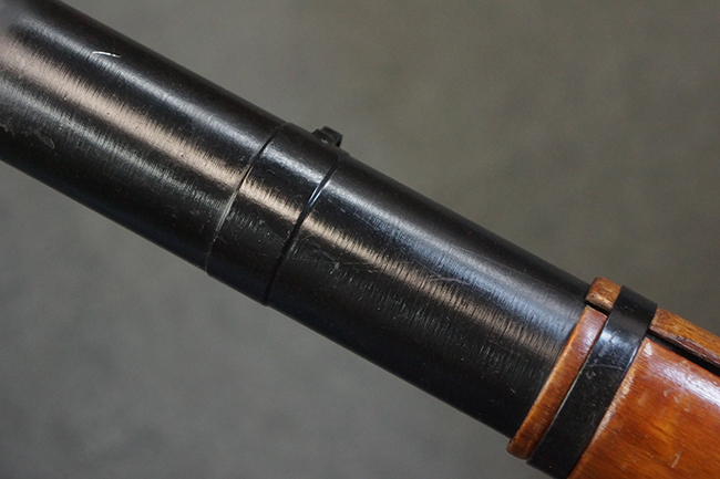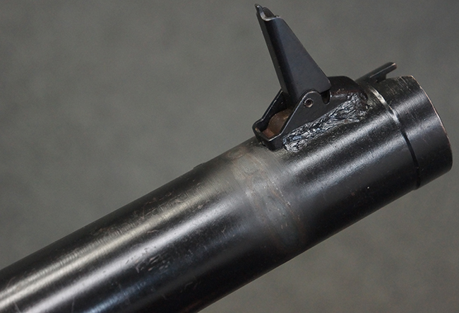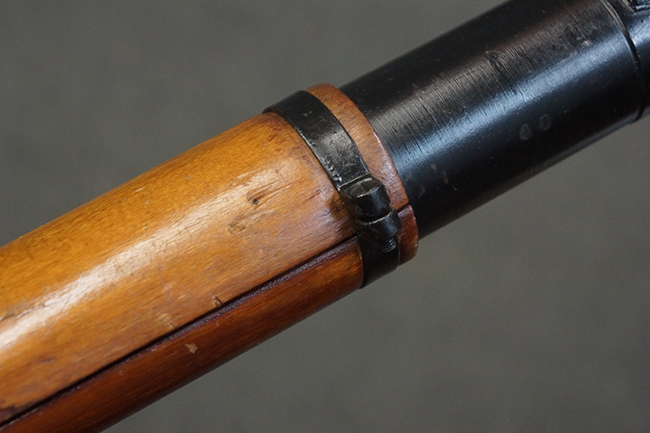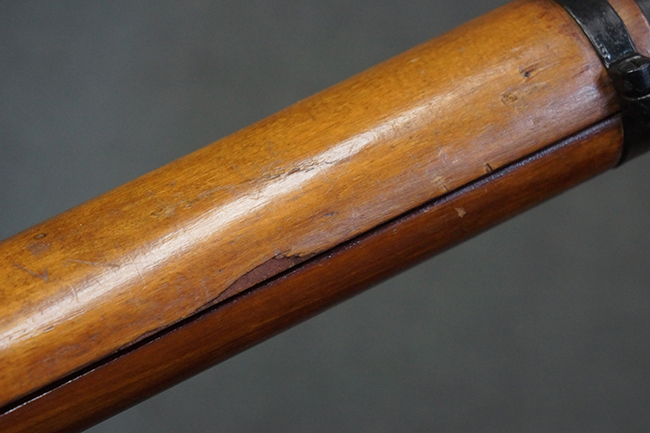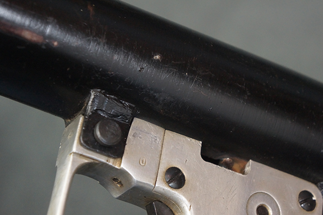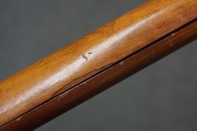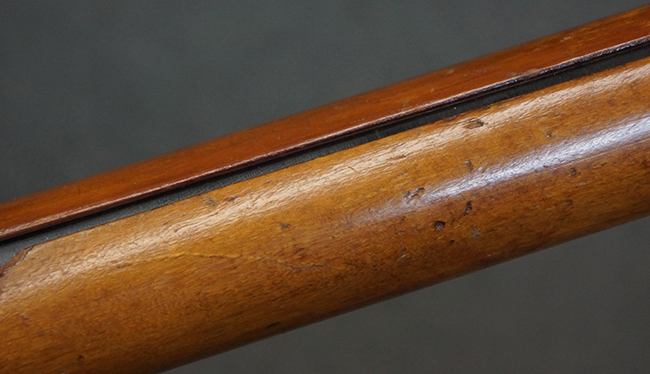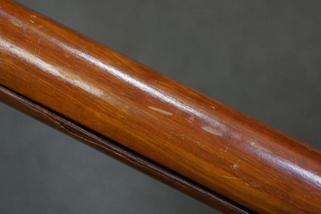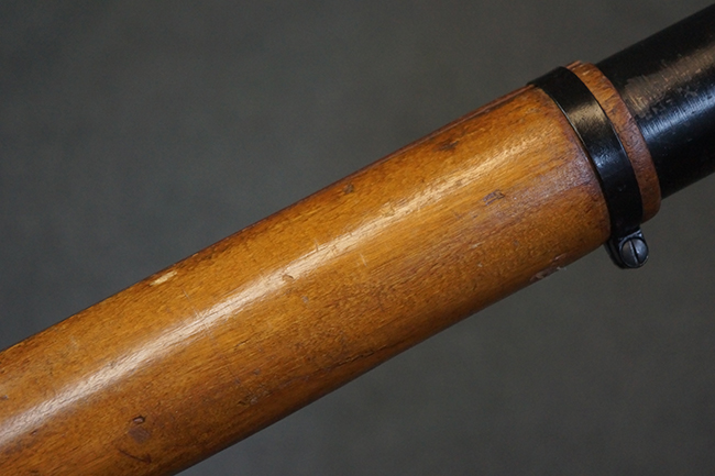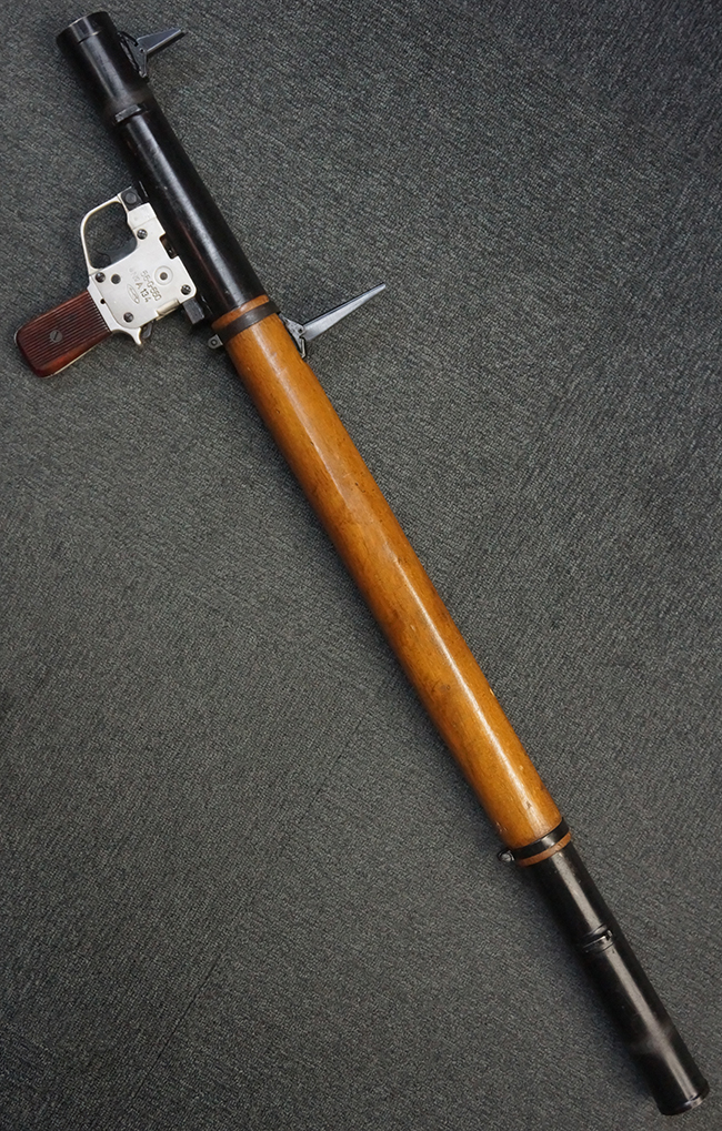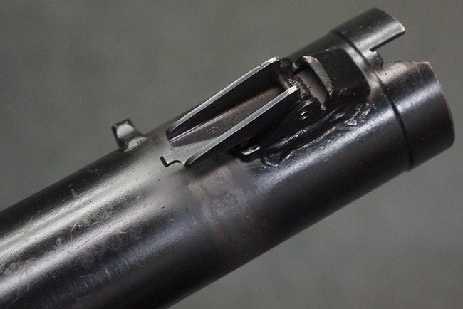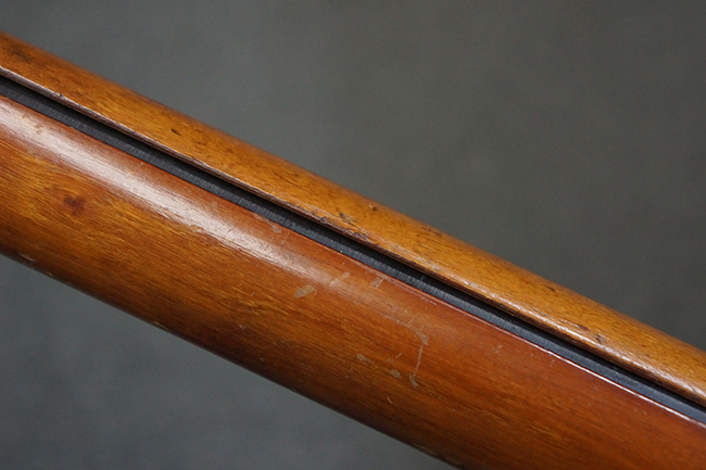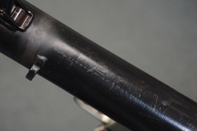 本品の黒色焼付塗装仕上げの発射筒はやや小傷や擦れの他、一部に塗装の剥落が見受けられるものの、大きな破損や欠損等は見受けられず、概ね良好な状態が保たれています。 発射筒前部及び後部に無可動加工に伴う塗膜表面の荒れが一部見られます。 トリガー・ハウジングについても同様に若干の打ち傷は見受けられますが、こちらも目立った欠損等は見受けられません。 木製のヒート・シールドやグリップ・パネルは、やや打ち傷や線傷が散見される他、一部に木部表面が浮いている箇所や若干の欠けが見受けられます。