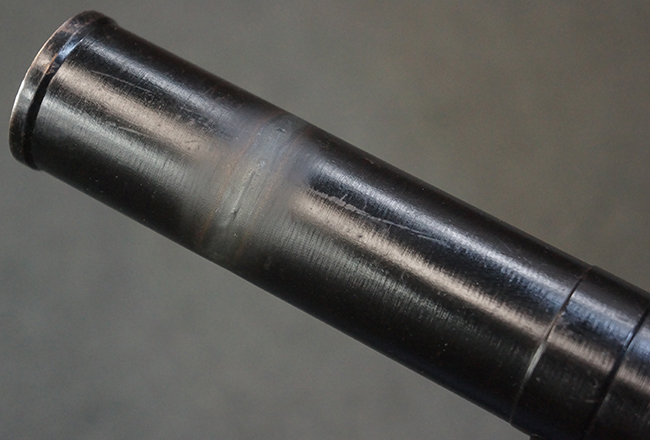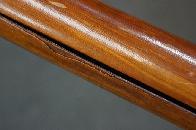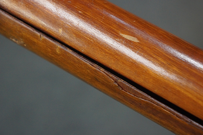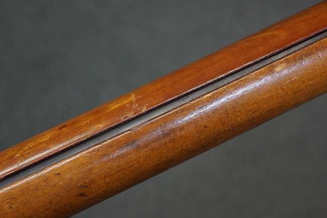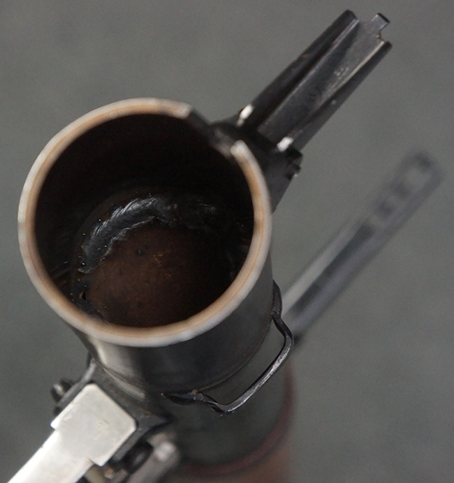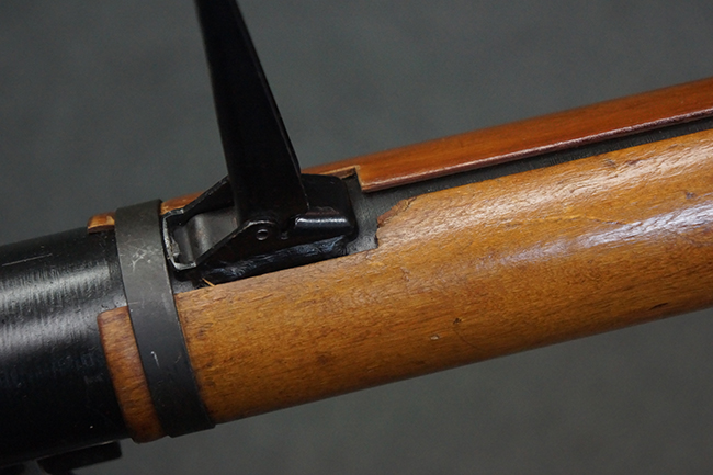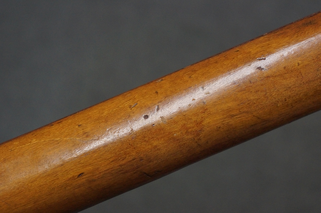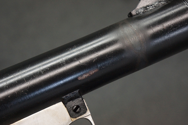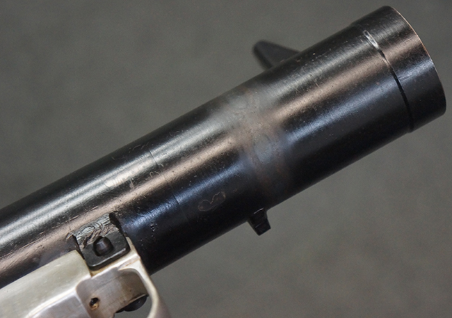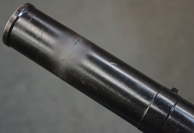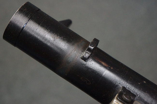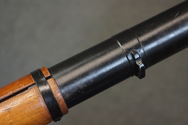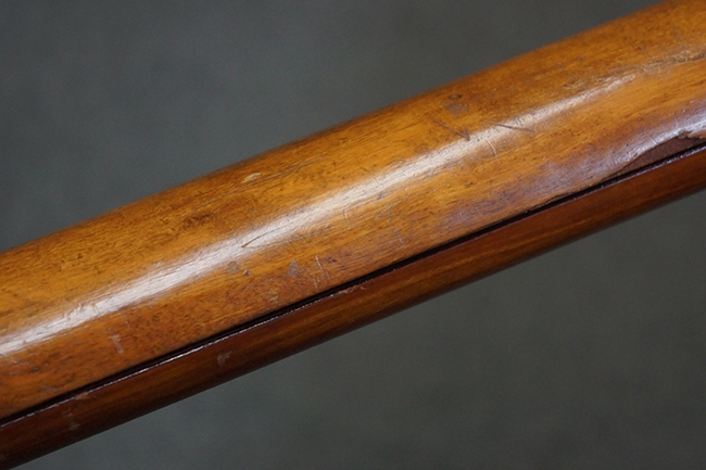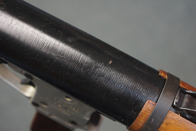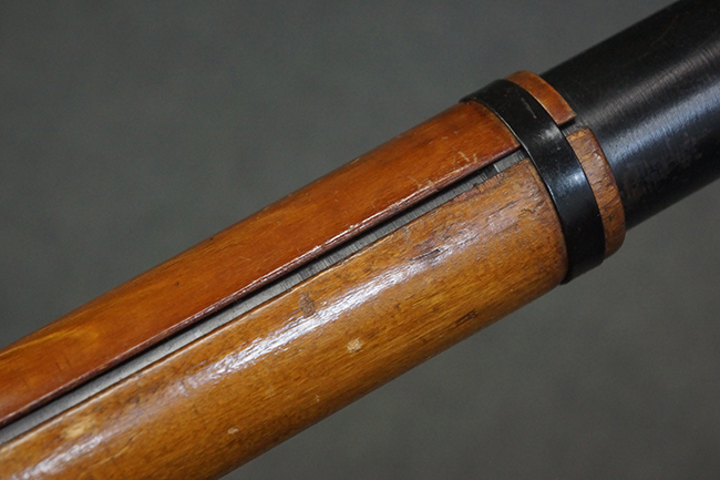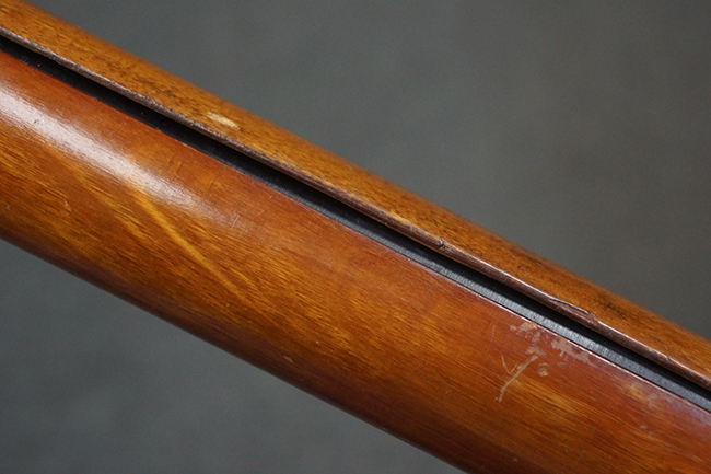 本品の黒色焼付塗装仕上げの発射筒はやや小傷や擦れの他、一部に塗装の剥落が見受けられるものの、大きな破損や欠損等は見受けられず、概ね良好な状態が保たれています。 発射筒前部及び後部に無可動加工に伴う塗膜表面の荒れが一部見られます。 トリガー・ハウジングについても同様に若干の打ち傷は見受けられますが、こちらも目立った欠損等は見受けられません。 木製のヒート・シールドやグリップ・パネルは、やや打ち傷や線傷が散見される他、一部に木部表面が浮いている箇所や若干の欠けが見受けられます。