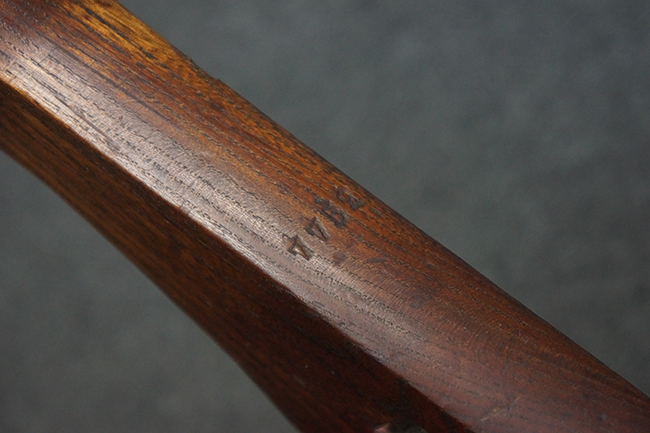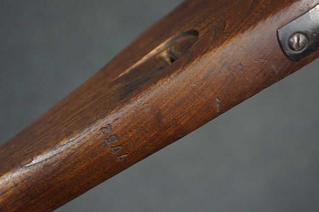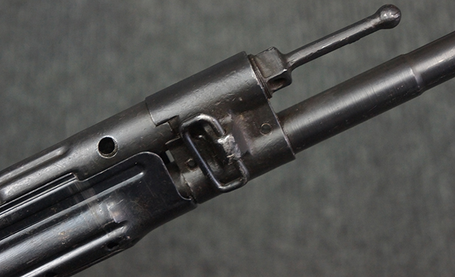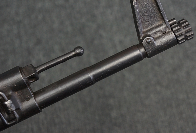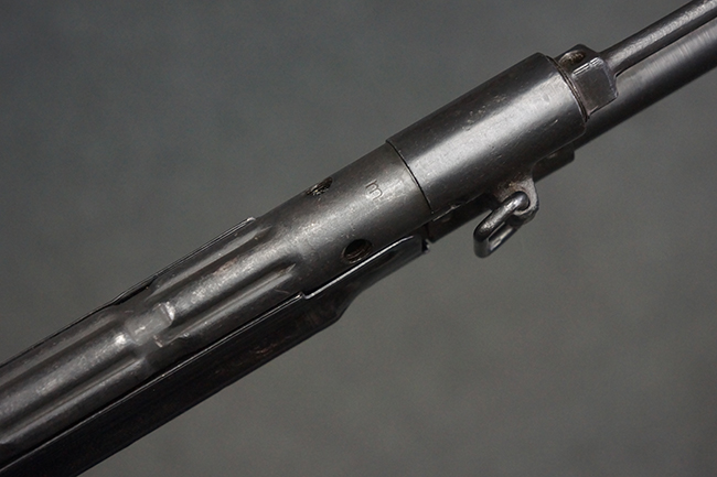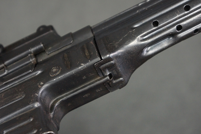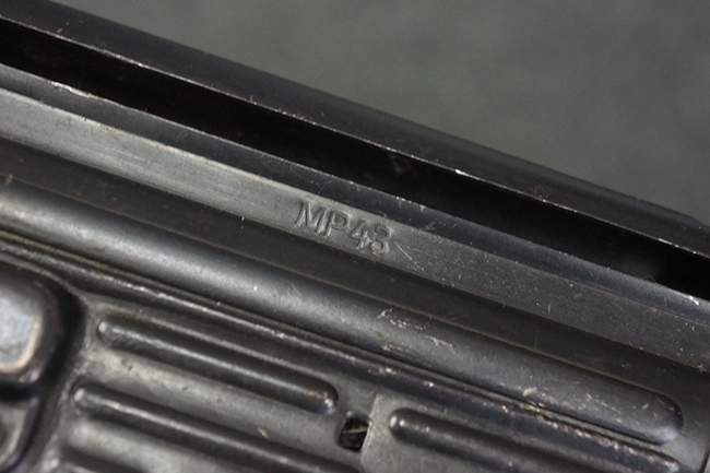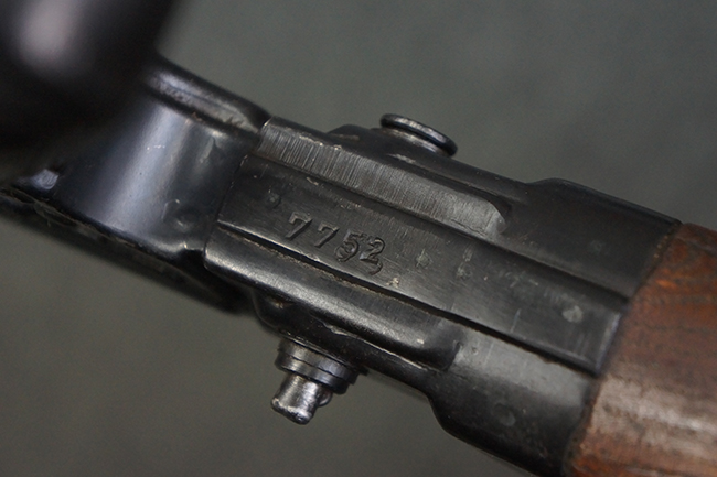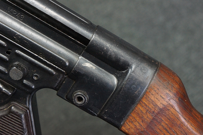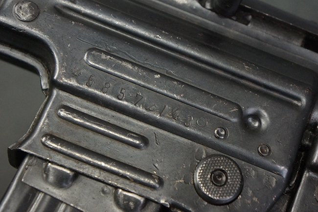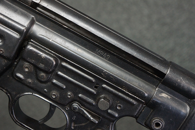 本品のレシーバー左側面には「MP43」のモデル名刻印が入っており、アッパー・レシーバー左側面にはシリアルNo.の後方に「/43」の刻印が入っている事から、本品が1943年に製造された事が判ります。 マガジン・ハウジング前方のレシーバー下面には、Merz-Werke Gebr社を示す「cos」のサブ・コントラクター刻印が入っています。 また、ハンドガードにLux, R. u. O., Metallwaren- und Maschinenfabrik社製を示す「aqr」、バット・ストック後端上部の金具にErste Nordboehmische Metallwarenfabrik社製を示す「jvd」の刻印が入っています。 各部のシリアルNo.は、レシーバーが5857c、バット・ストックが7752でストック基部も打ち直しにより7752となっています。 その他、各部にアムト刻印が確認できます。