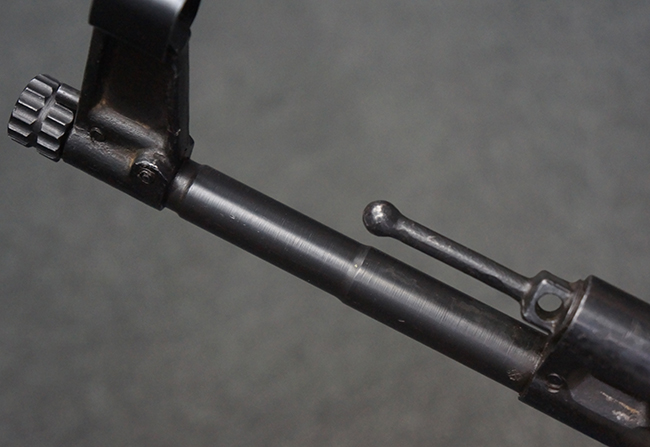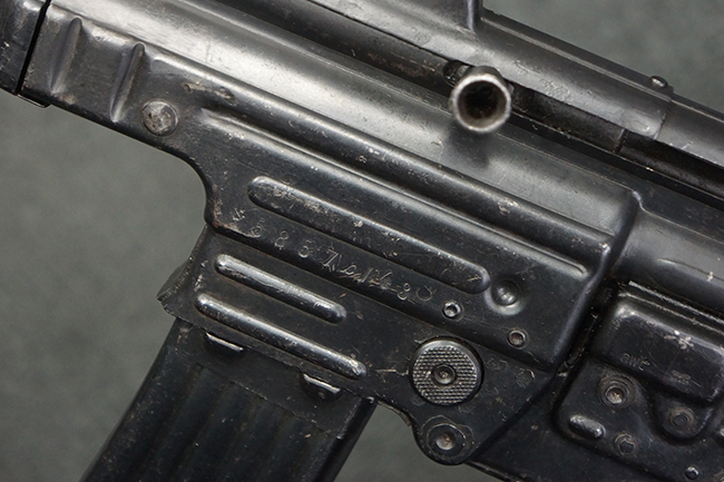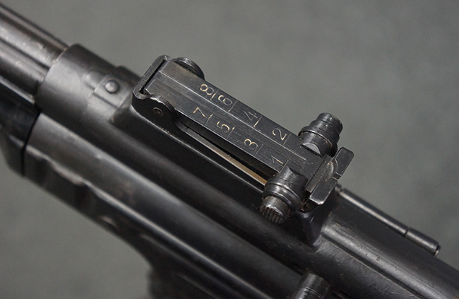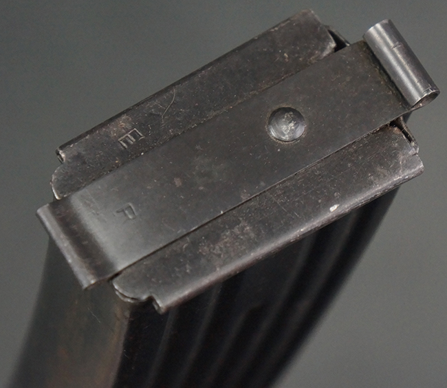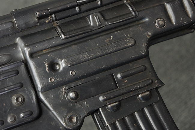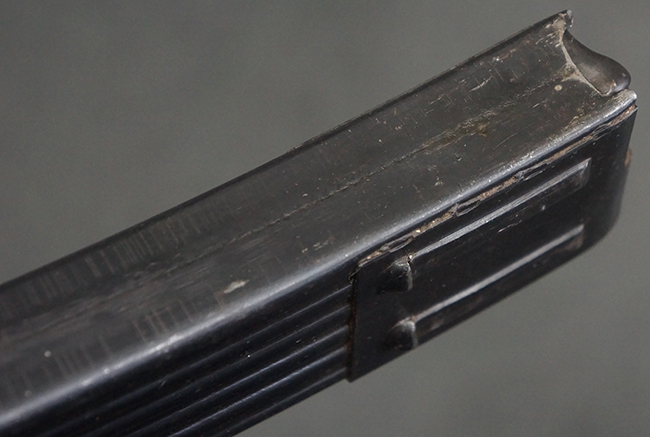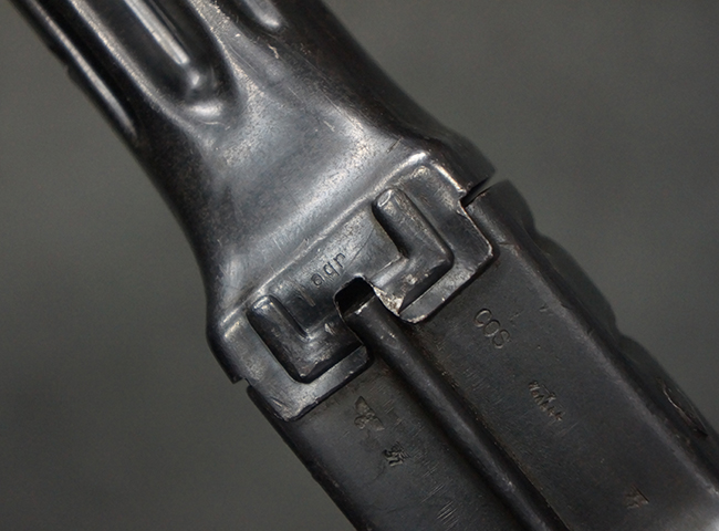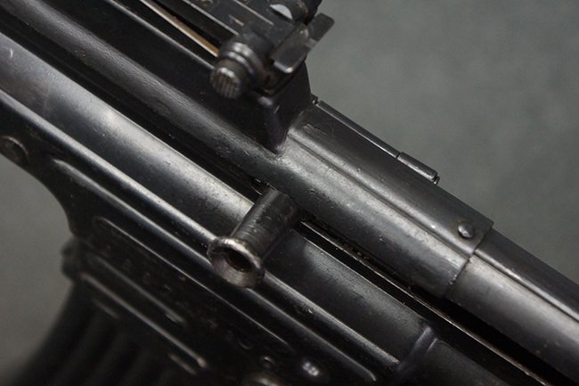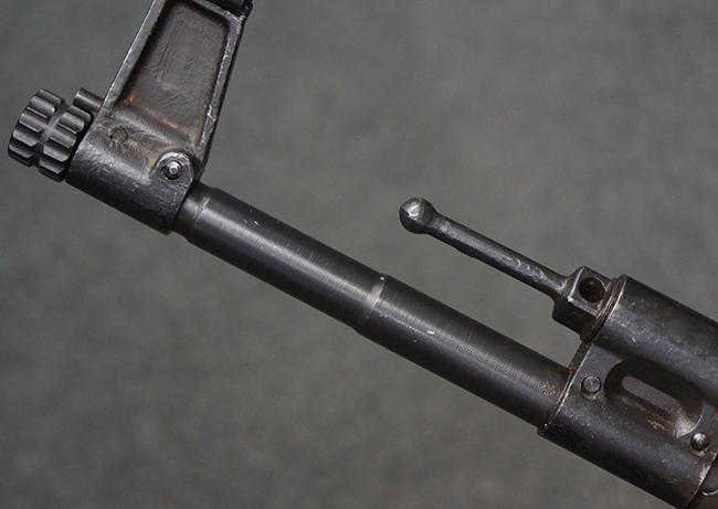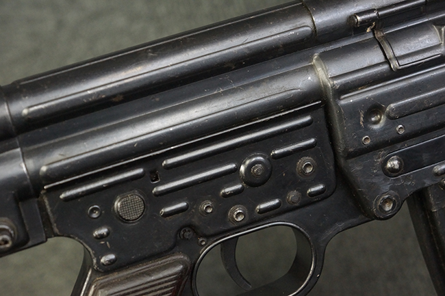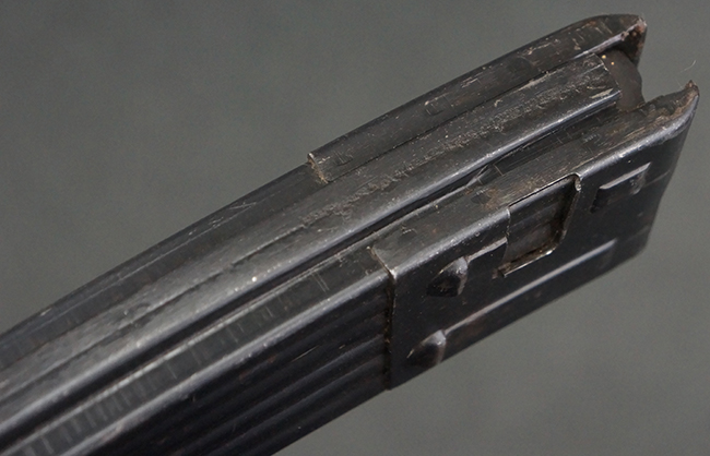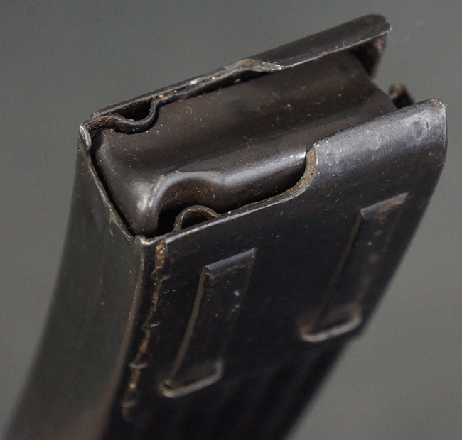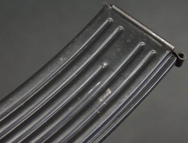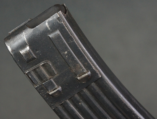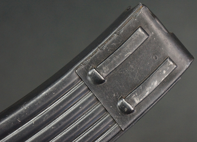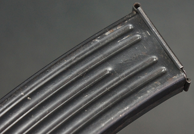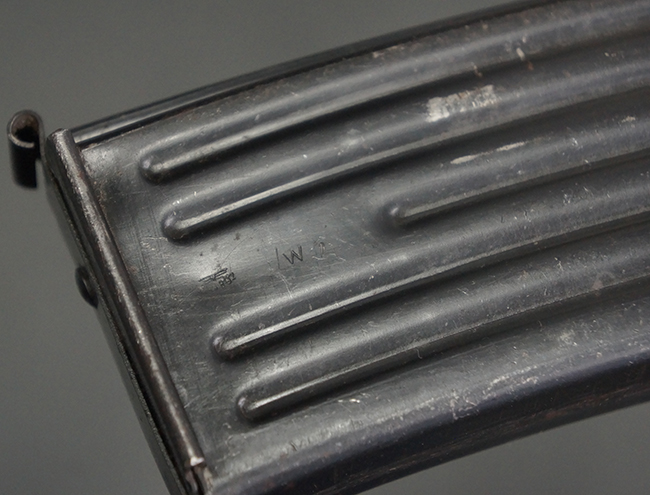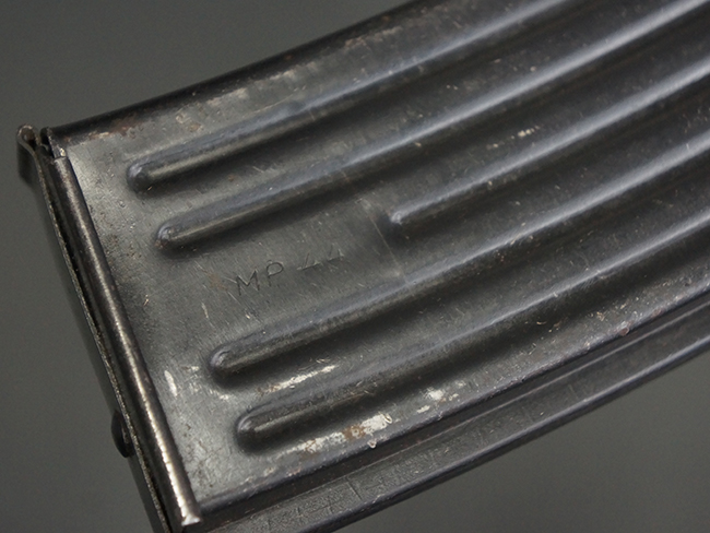 リア・サイトの調整やマガジンの着脱、ダスト・カバーの開閉については問題なく行う事が可能です。 セーフティ・レバーやセレクター・ボタンの切り替えについても問題なく行う事が可能で、セーフティは安全位置でトリガーがロックされます。 マガジンは装着時に若干の遊びが見られますが、固定自体はしっかりとしています。 付属のマガジンには「MP44」のモデル名刻印が入っている他、ヴァッフェン・アムト刻印が確認出来ます。 マガジンはやや小傷や擦れの他、一部に表面錆痕や凹みが見受けられますが、概ねしっかりとした状態が保たれており、オリジナルの表面仕上げも大部分に残っています。 尚、マガジン・スプリングは入っています。