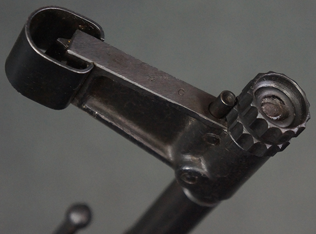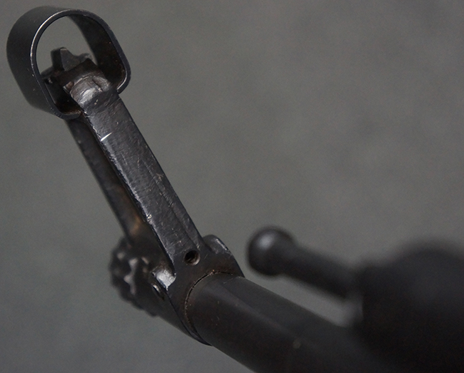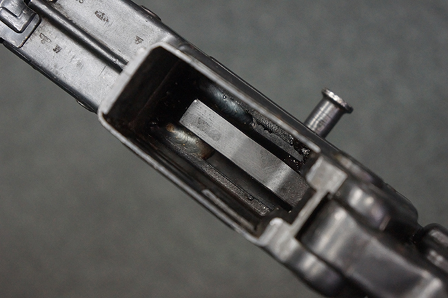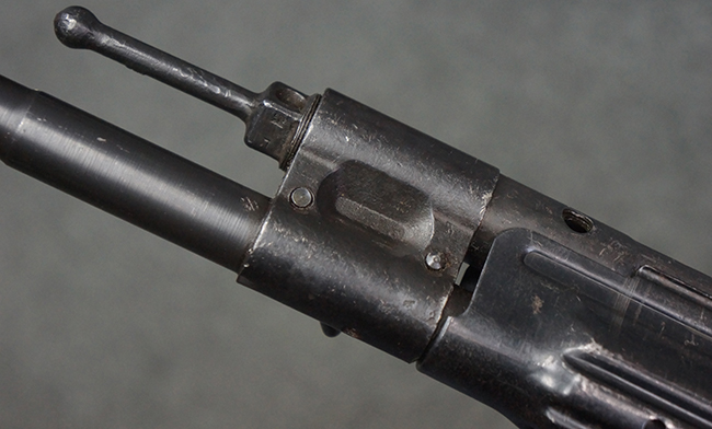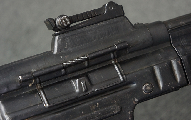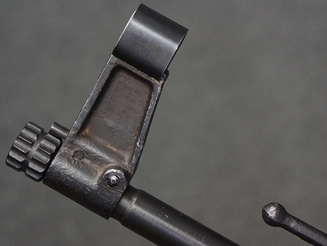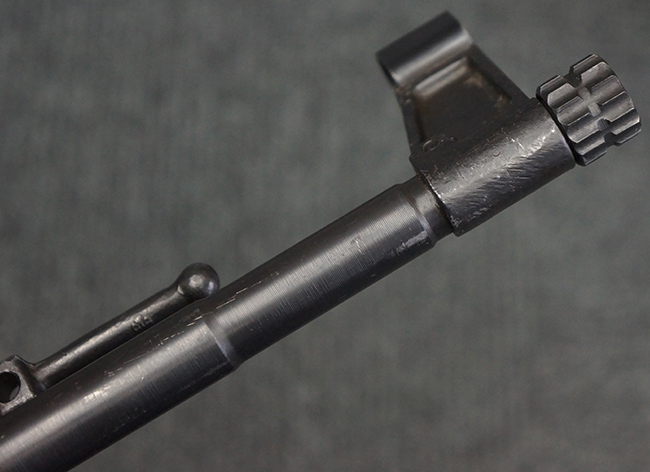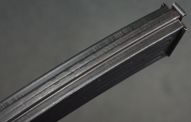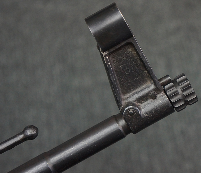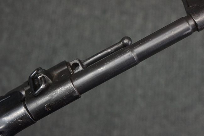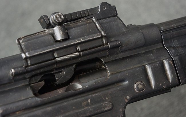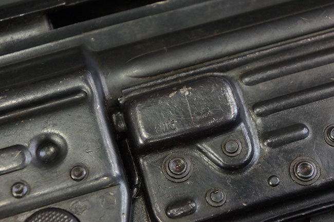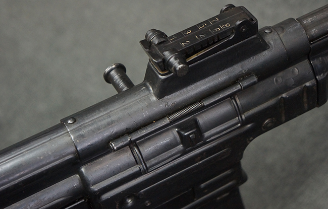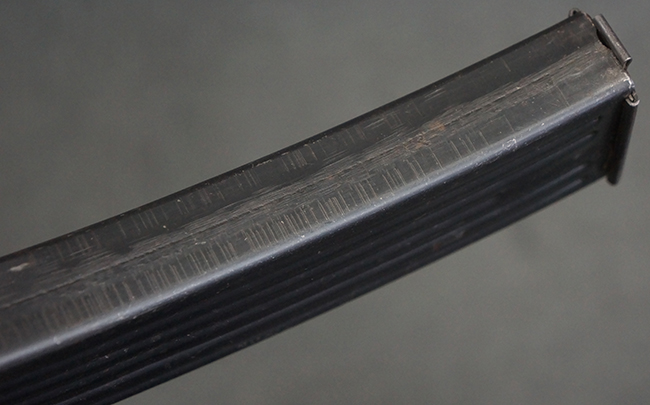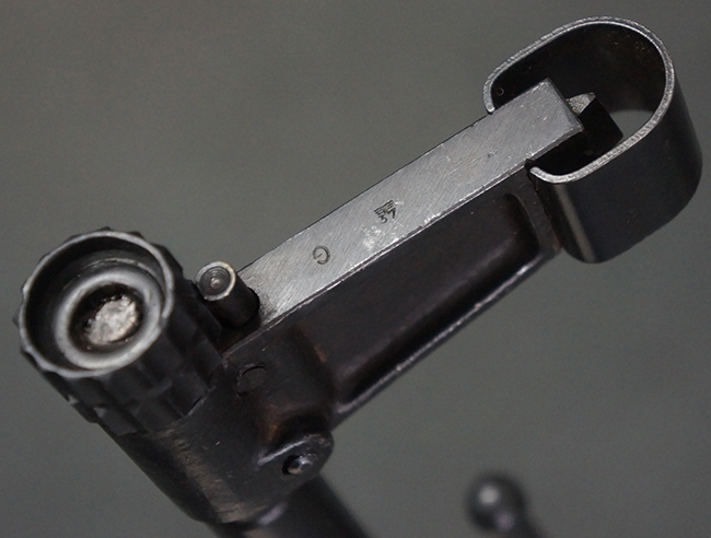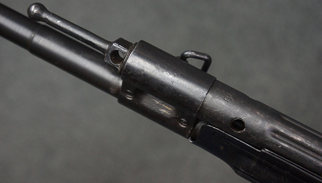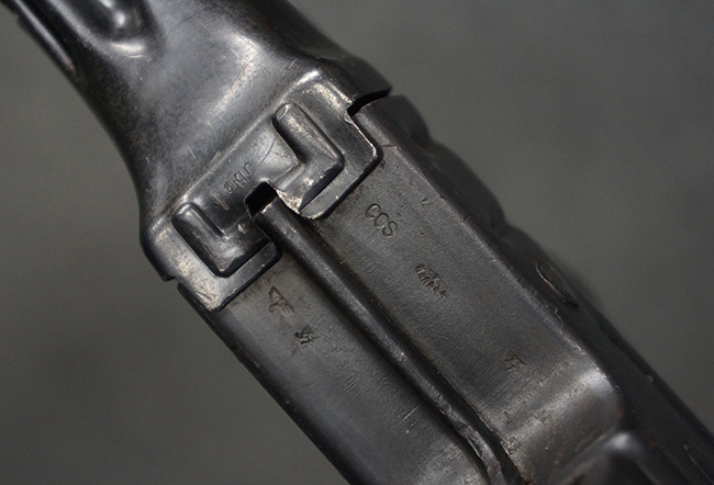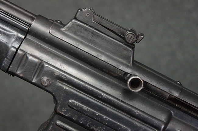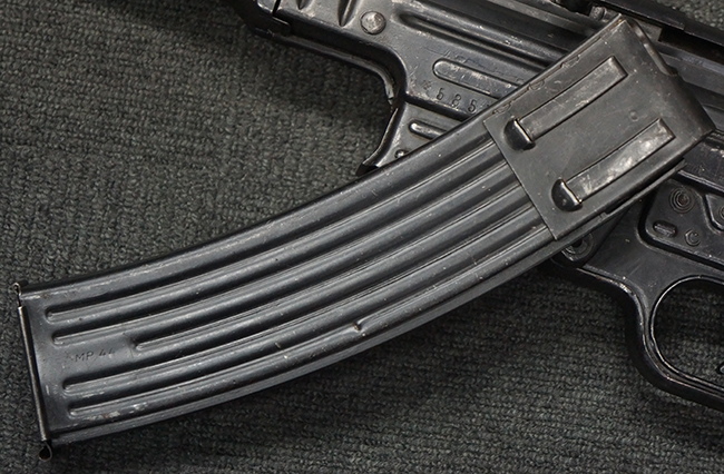 リア・サイトの調整やマガジンの着脱、ダスト・カバーの開閉については問題なく行う事が可能です。 セーフティ・レバーやセレクター・ボタンの切り替えについても問題なく行う事が可能で、セーフティは安全位置でトリガーがロックされます。 マガジンは装着時に若干の遊びが見られますが、固定自体はしっかりとしています。 付属のマガジンには「MP44」のモデル名刻印が入っている他、ヴァッフェン・アムト刻印が確認出来ます。 マガジンはやや小傷や擦れの他、一部に表面錆痕や凹みが見受けられますが、概ねしっかりとした状態が保たれており、オリジナルの表面仕上げも大部分に残っています。 尚、マガジン・スプリングは入っています。