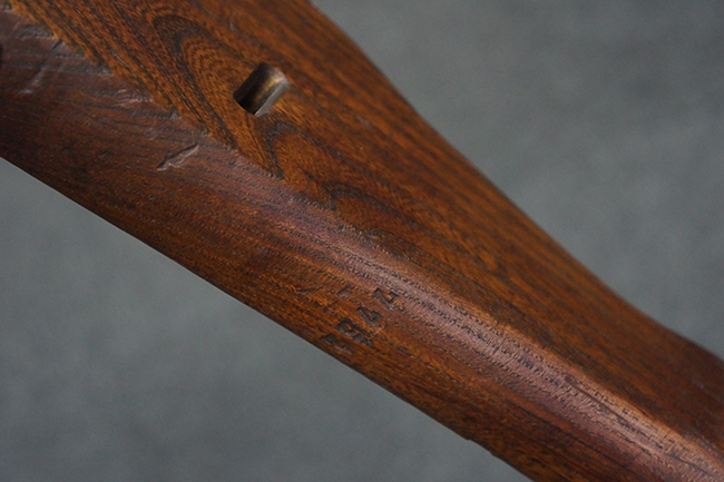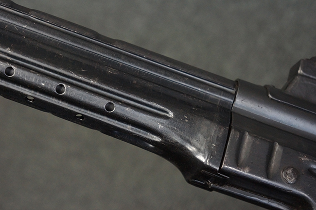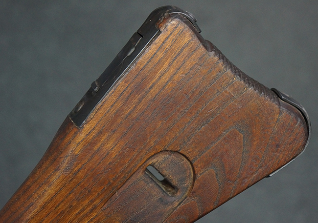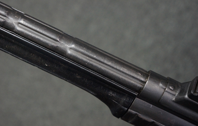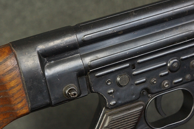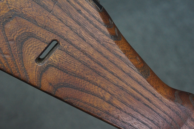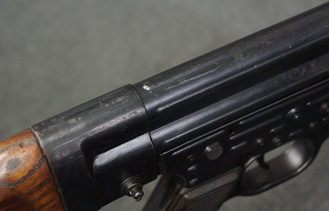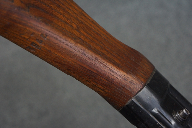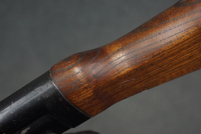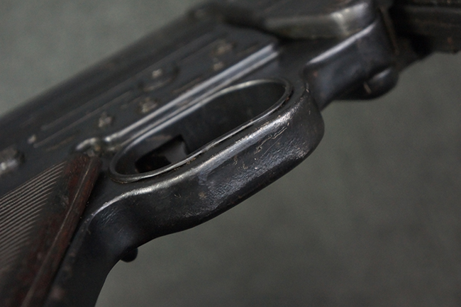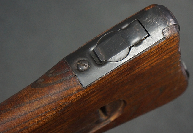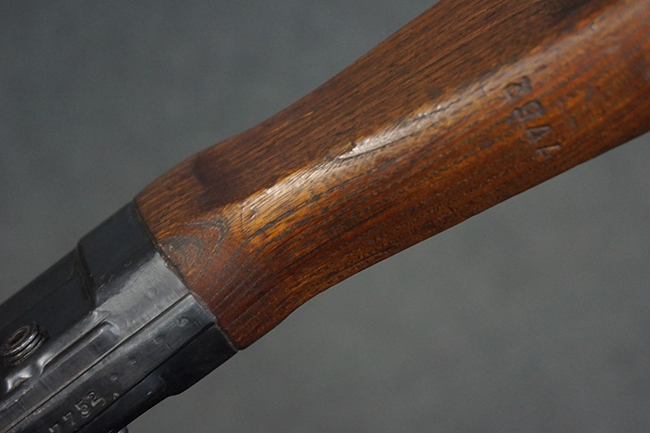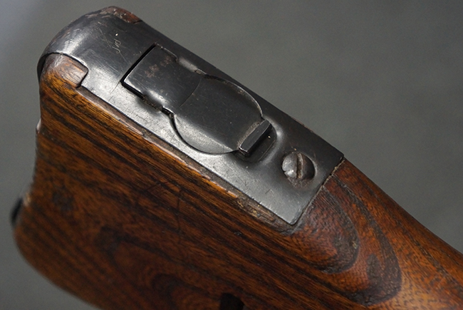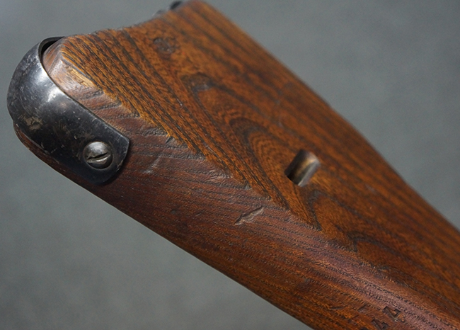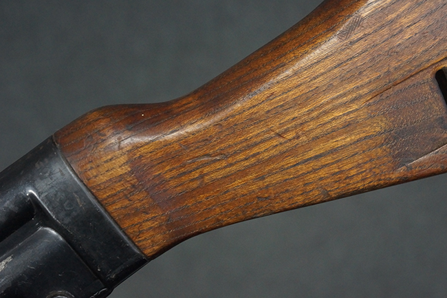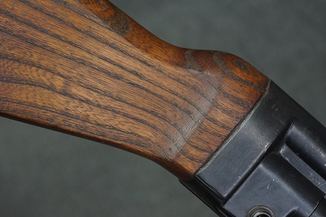 本品の金属部は全体に適度な使用感が見受けられ、やや打ち傷や経年による褪色、若干の表面錆痕等が見られるものの、大きな欠損等は見られず、オリジナルの表面仕上げも比較的良好に保たれています。 銃身は無可動加工に伴い僅かに下方に曲がりが見られますが、肉眼ではあまり気にならないレベルのものです。 木製バット・ストックについてもやや打ち傷や線傷は見られますが、大きな破損や欠損は見受けられず、比較的良好な状態が保たれています。 傷み易い肩当て部についても、滑り止めの溝は概ね良好に残っています。 また、ストック後部上面のコンパートメントの蓋の開閉についても、スプリングのテンションがしっかりと効いています。 木製バット・ストックの取り付けについては、現状目立ったがたつき等は見られません。 木製のグリップ・パネルについても、やや打ち傷や線傷、若干の摩耗の他、右側面のグリップ・パネルに部分的な古い欠けが見られるものの、取り付けについては大きながたつきもなくしっかりとしています。