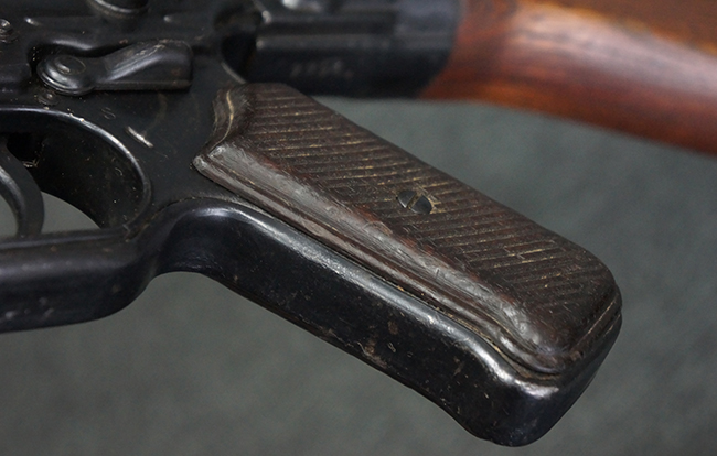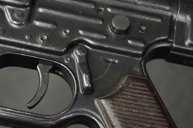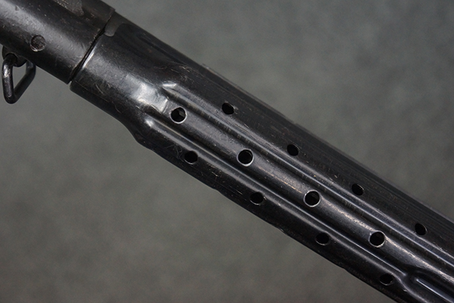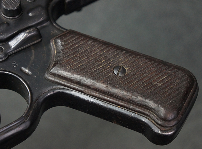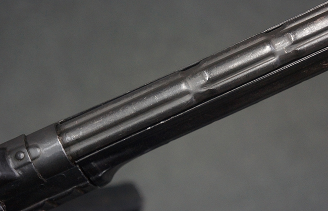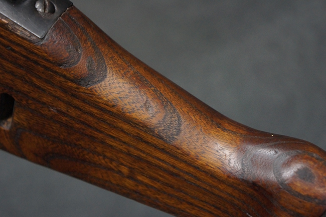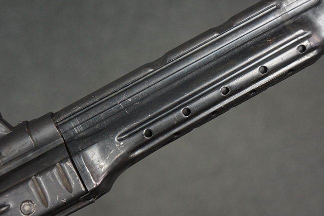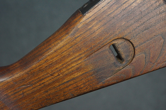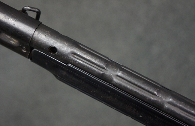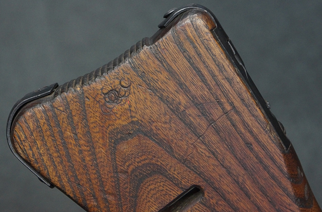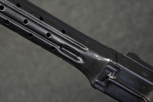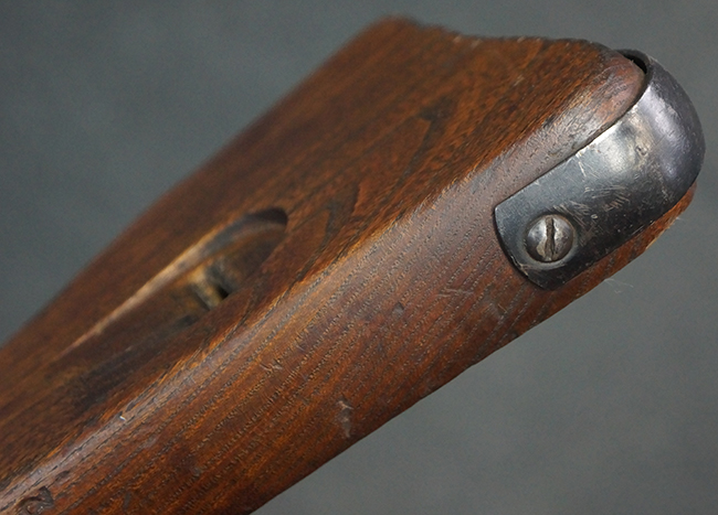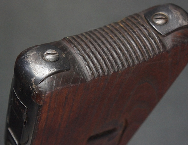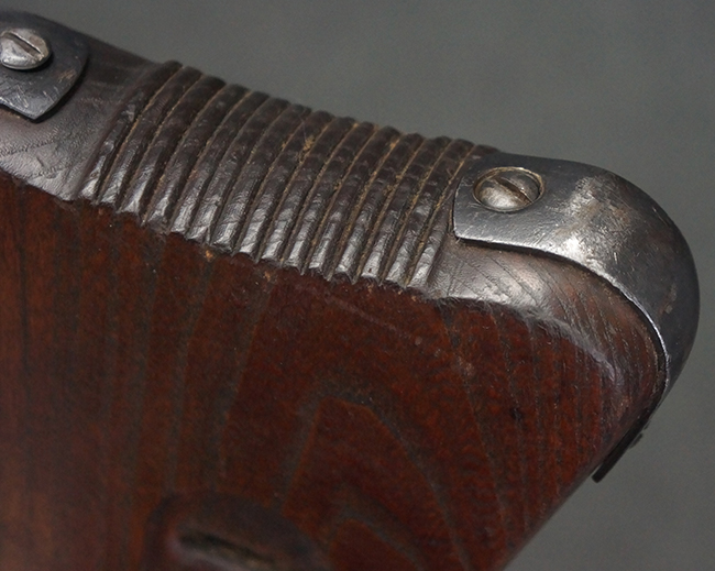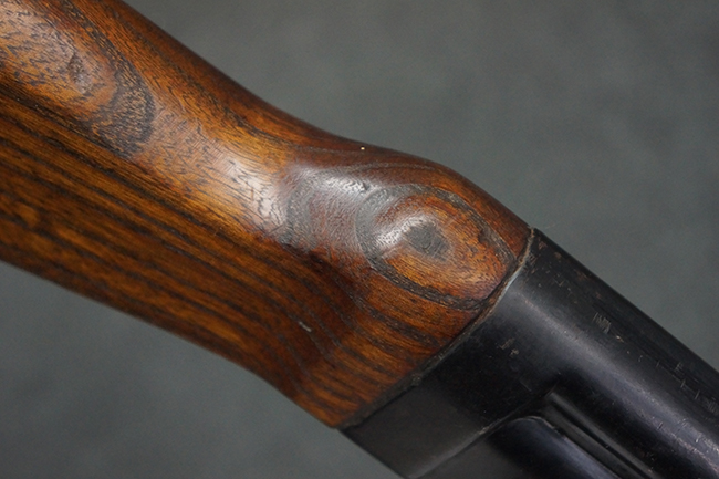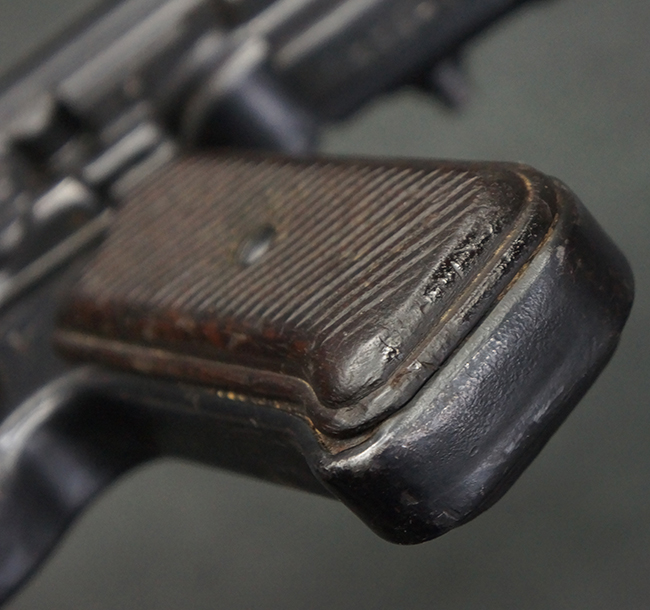 本品の金属部は全体に適度な使用感が見受けられ、やや打ち傷や経年による褪色、若干の表面錆痕等が見られるものの、大きな欠損等は見られず、オリジナルの表面仕上げも比較的良好に保たれています。 銃身は無可動加工に伴い僅かに下方に曲がりが見られますが、肉眼ではあまり気にならないレベルのものです。 木製バット・ストックについてもやや打ち傷や線傷は見られますが、大きな破損や欠損は見受けられず、比較的良好な状態が保たれています。 傷み易い肩当て部についても、滑り止めの溝は概ね良好に残っています。 また、ストック後部上面のコンパートメントの蓋の開閉についても、スプリングのテンションがしっかりと効いています。 木製バット・ストックの取り付けについては、現状目立ったがたつき等は見られません。 木製のグリップ・パネルについても、やや打ち傷や線傷、若干の摩耗の他、右側面のグリップ・パネルに部分的な古い欠けが見られるものの、取り付けについては大きながたつきもなくしっかりとしています。