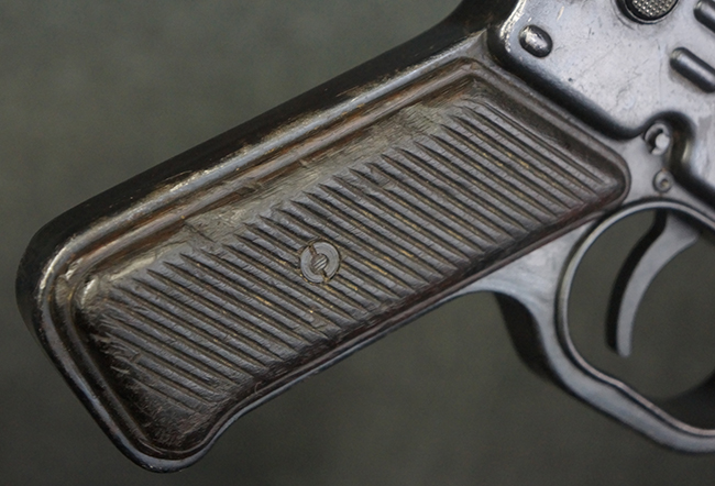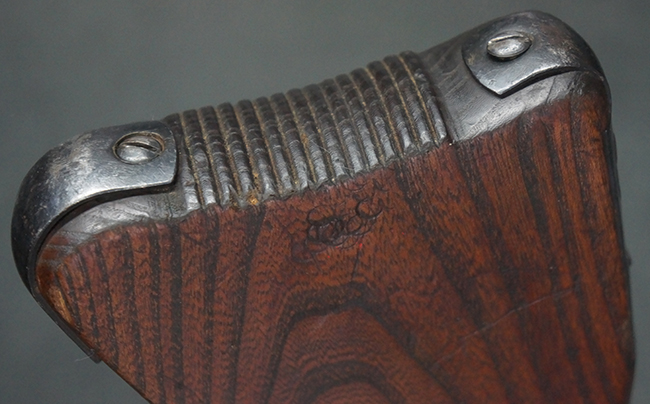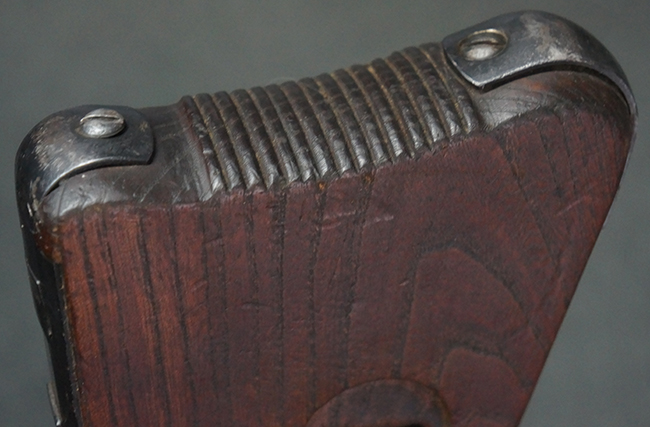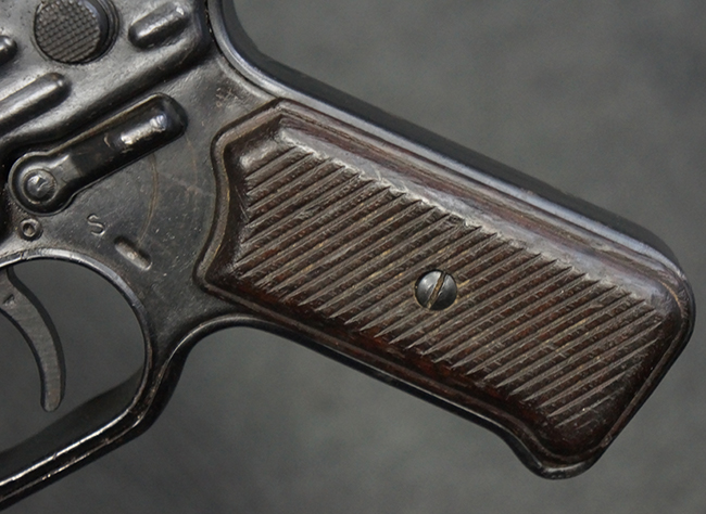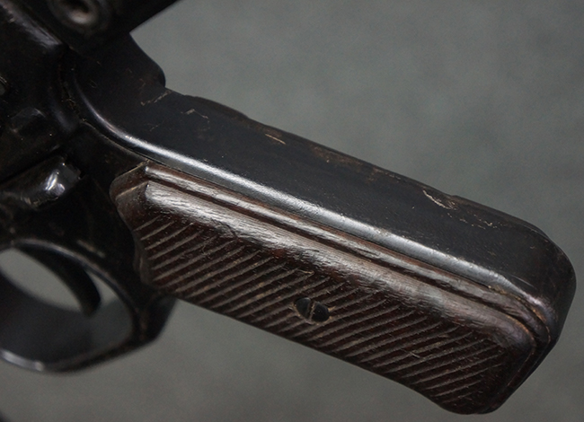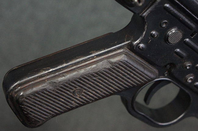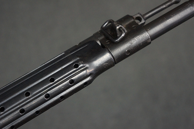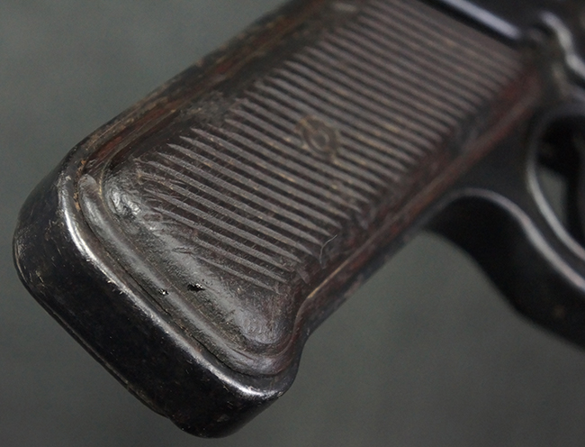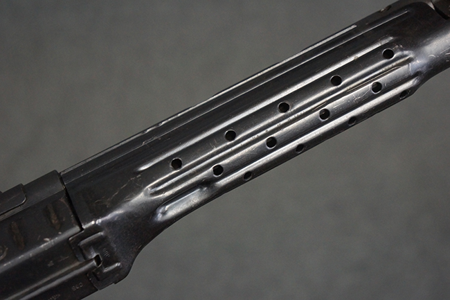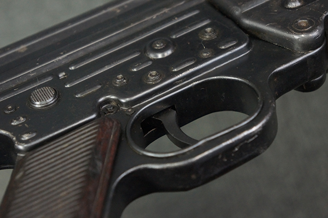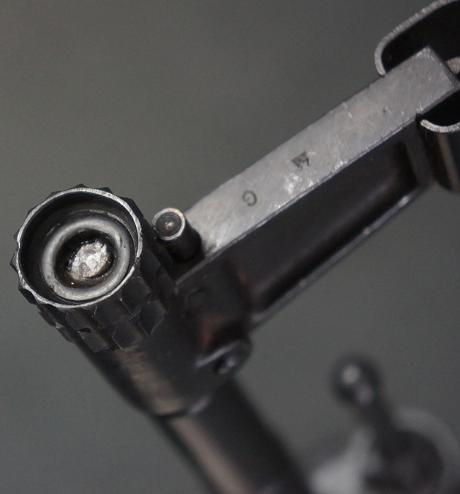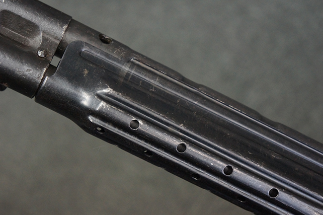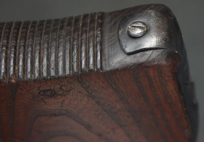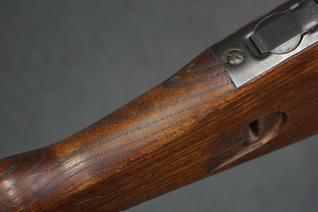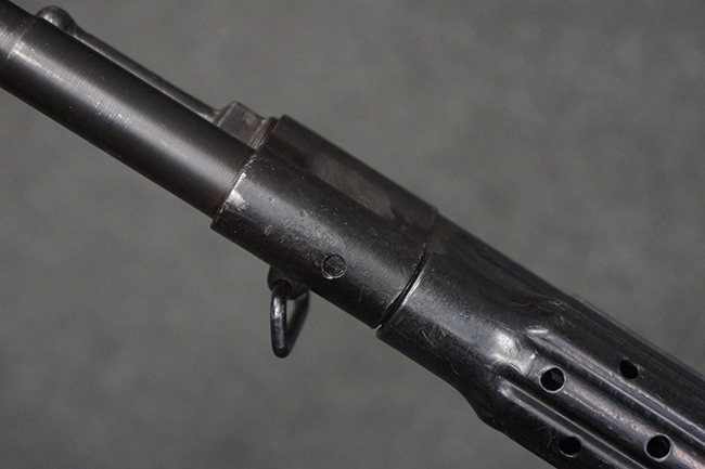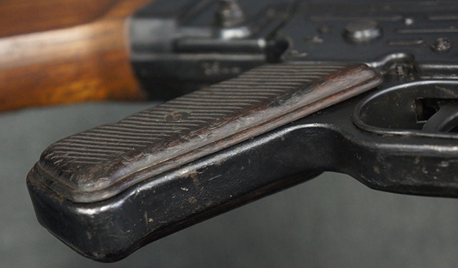 本品の金属部は全体に適度な使用感が見受けられ、やや打ち傷や経年による褪色、若干の表面錆痕等が見られるものの、大きな欠損等は見られず、オリジナルの表面仕上げも比較的良好に保たれています。 銃身は無可動加工に伴い僅かに下方に曲がりが見られますが、肉眼ではあまり気にならないレベルのものです。 木製バット・ストックについてもやや打ち傷や線傷は見られますが、大きな破損や欠損は見受けられず、比較的良好な状態が保たれています。 傷み易い肩当て部についても、滑り止めの溝は概ね良好に残っています。 また、ストック後部上面のコンパートメントの蓋の開閉についても、スプリングのテンションがしっかりと効いています。 木製バット・ストックの取り付けについては、現状目立ったがたつき等は見られません。 木製のグリップ・パネルについても、やや打ち傷や線傷、若干の摩耗の他、右側面のグリップ・パネルに部分的な古い欠けが見られるものの、取り付けについては大きながたつきもなくしっかりとしています。