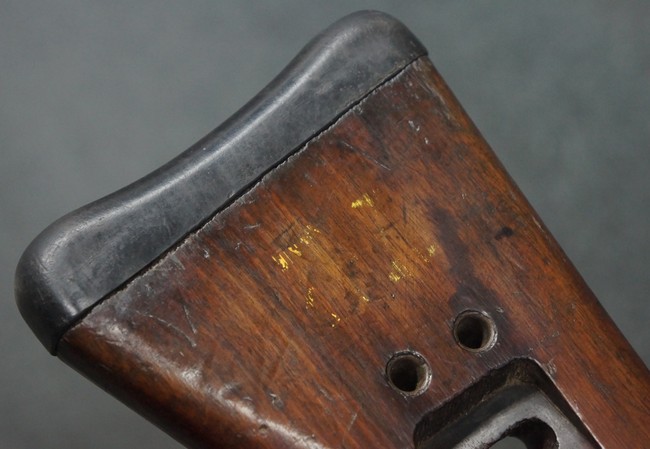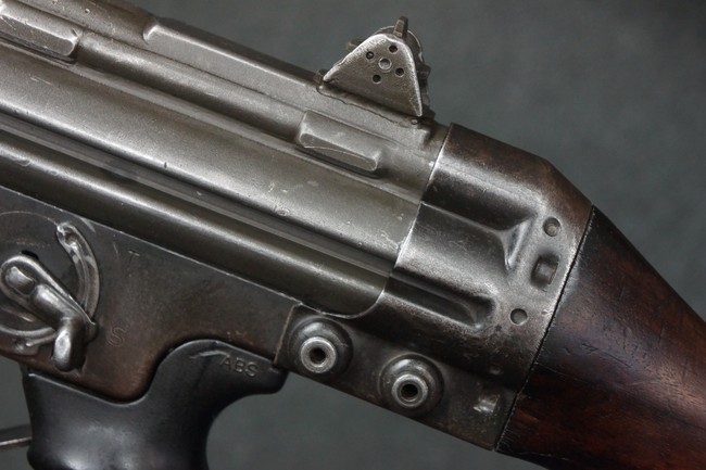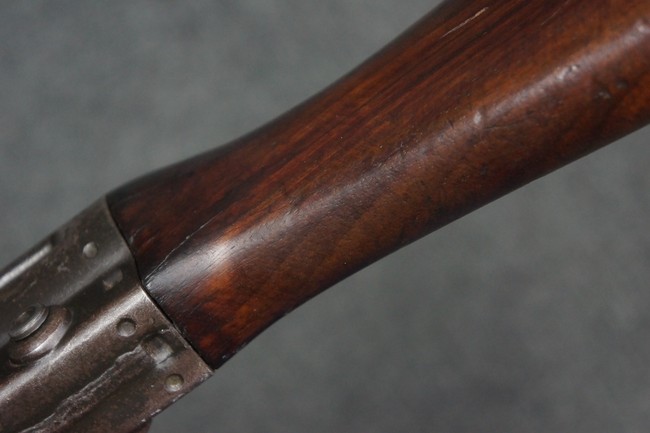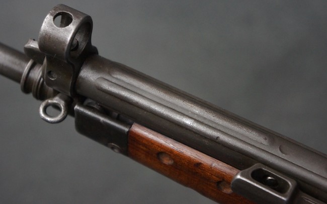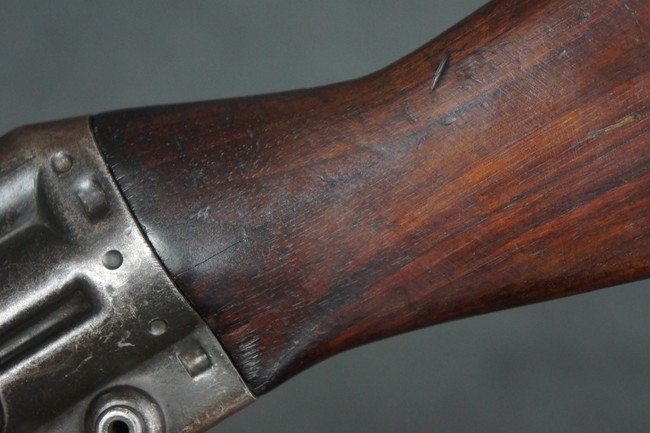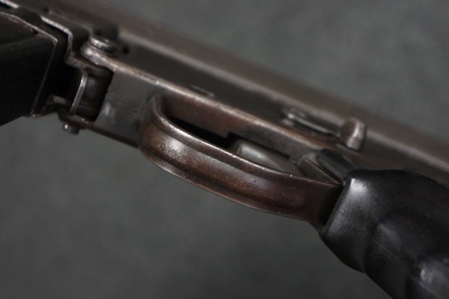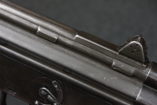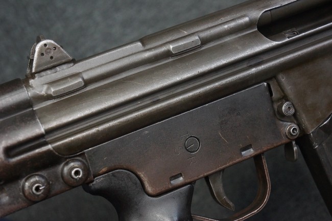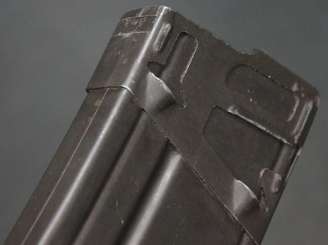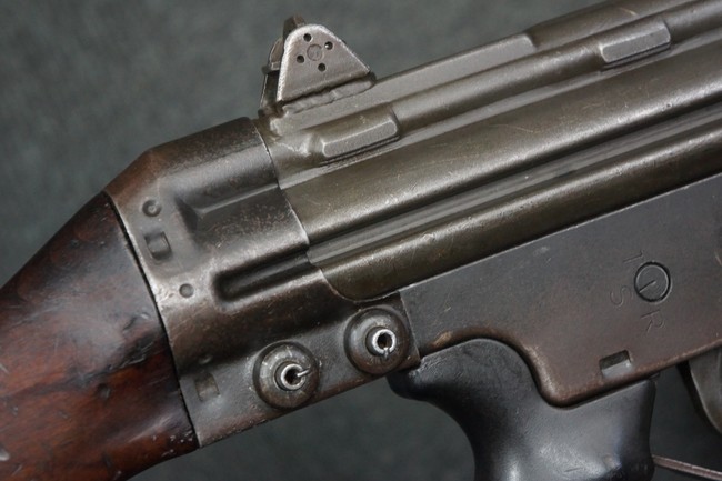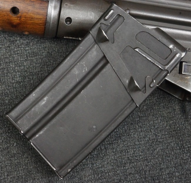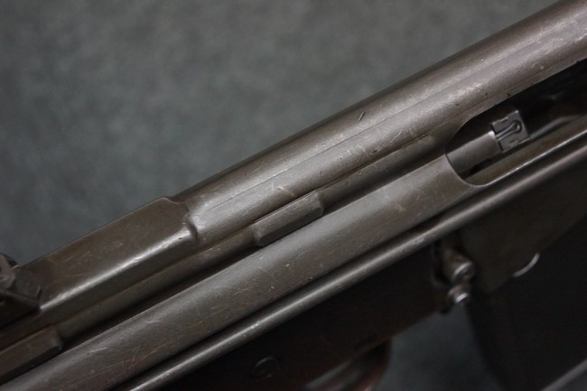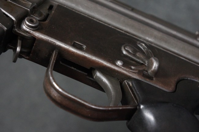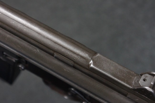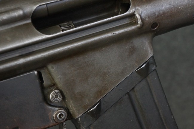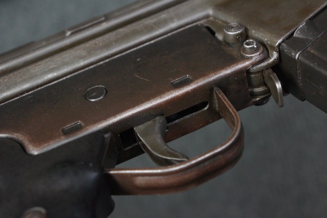 本品は全体に使い込まれたコンディションとなっており、銃身や機関部といった金属部は、全体にやや仕上げが薄くなり、打ち傷や経年による褪色の他、仕上げが落ちて金属の地肌が表れている箇所や若干の表面錆が見られますが、大きな欠損等は見られず、概ねしっかりとした状態が保たれています。 木製のハンドガードやバット・ストックについても、やや打ち傷や線傷が見られる他、バット・ストック基部周辺にヘアライン・クラックが複数見受けられますが、強度的には比較的しっかりとした状態が保たれており、各部の取り付けについても現状目立ったがたつき等は見られません。 傷み易いゴム製のバット・プレート部については、やや打ち傷や若干の摩耗等が見られますが、大きな経年劣化は見受けられません。 樹脂製のグリップについてもやや小傷や擦れは見られるものの、大きな破損や欠損は見られず、取り付けについてもがたつきもなくしっかりとしています。 リア・サイトの切り替えやマガジンの着脱については問題なく行う事が可能です。 付属のマガジンについてもやや小傷や擦れは見られるものの、目立った凹みや変形等は見られず、オリジナルの仕上げも比較的残っています。 尚、マガジン・スプリングは入っていません。 マガジンは取り付け時にやや遊びが見られるものの、ロック自体はしっかりと掛かります。 セレクターの切り替えも可能ですが、トリガーとの連動等は有りません。