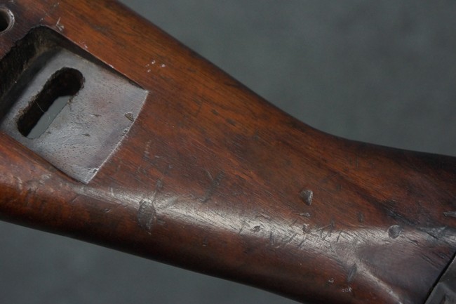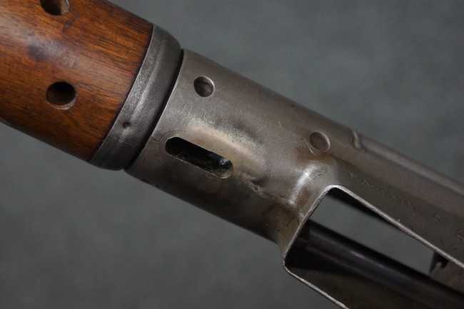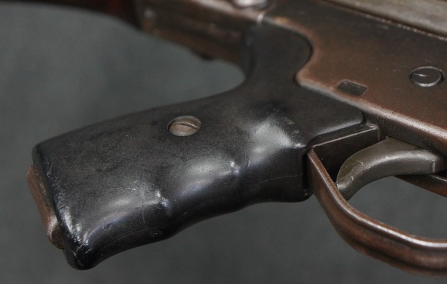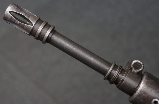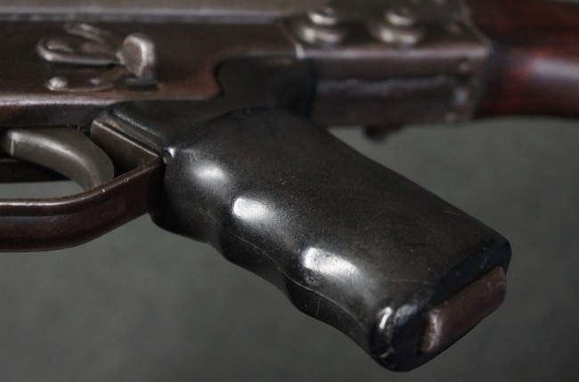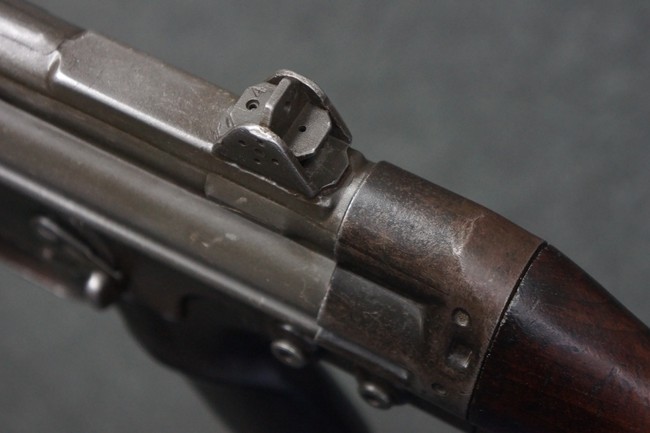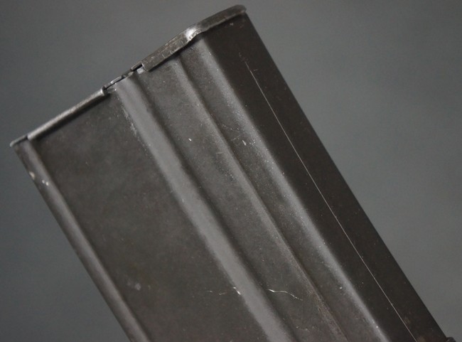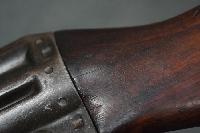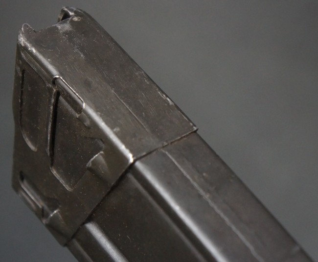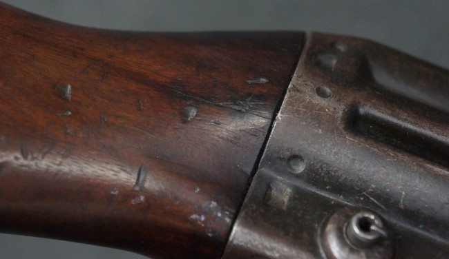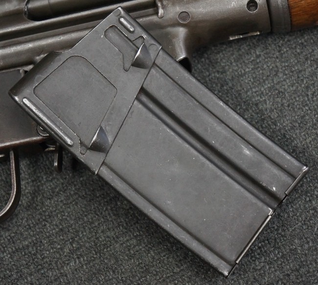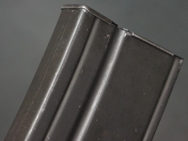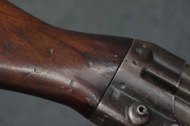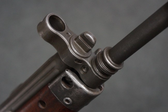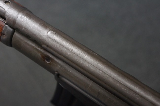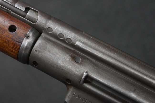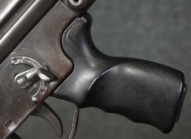 本品は全体に使い込まれたコンディションとなっており、銃身や機関部といった金属部は、全体にやや仕上げが薄くなり、打ち傷や経年による褪色の他、仕上げが落ちて金属の地肌が表れている箇所や若干の表面錆が見られますが、大きな欠損等は見られず、概ねしっかりとした状態が保たれています。 木製のハンドガードやバット・ストックについても、やや打ち傷や線傷が見られる他、バット・ストック基部周辺にヘアライン・クラックが複数見受けられますが、強度的には比較的しっかりとした状態が保たれており、各部の取り付けについても現状目立ったがたつき等は見られません。 傷み易いゴム製のバット・プレート部については、やや打ち傷や若干の摩耗等が見られますが、大きな経年劣化は見受けられません。 樹脂製のグリップについてもやや小傷や擦れは見られるものの、大きな破損や欠損は見られず、取り付けについてもがたつきもなくしっかりとしています。 リア・サイトの切り替えやマガジンの着脱については問題なく行う事が可能です。 付属のマガジンについてもやや小傷や擦れは見られるものの、目立った凹みや変形等は見られず、オリジナルの仕上げも比較的残っています。 尚、マガジン・スプリングは入っていません。 マガジンは取り付け時にやや遊びが見られるものの、ロック自体はしっかりと掛かります。 セレクターの切り替えも可能ですが、トリガーとの連動等は有りません。