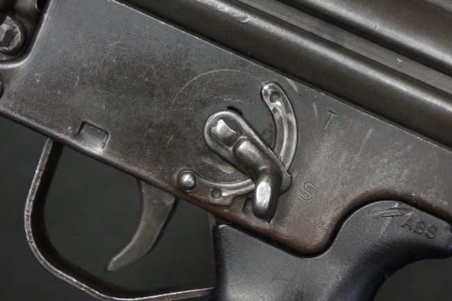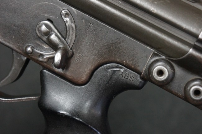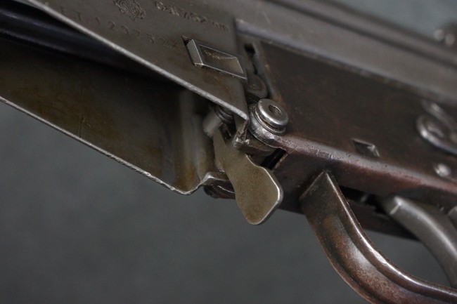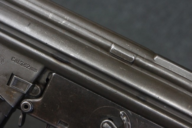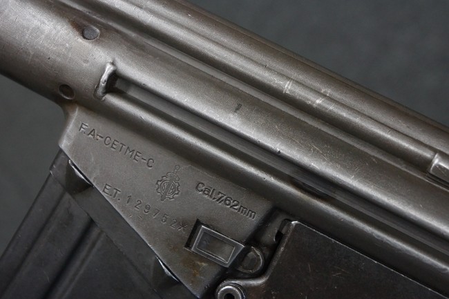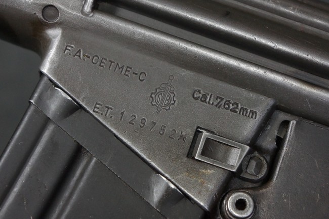 本品のマガジン・ハウジング左側面にはシリアルNo.やサンタ・バーバラ造兵廠の剣のロゴに加えて、「F.A.-CETME-C」のモデル名及び「Cal.7,62mm」の口径表示刻印が入っています。 セレクターは「T-S-R」の表記となっています。