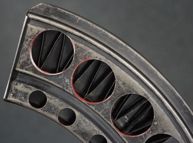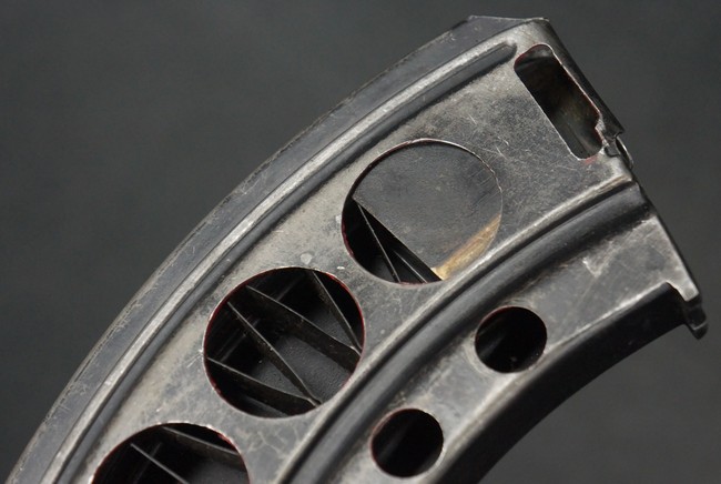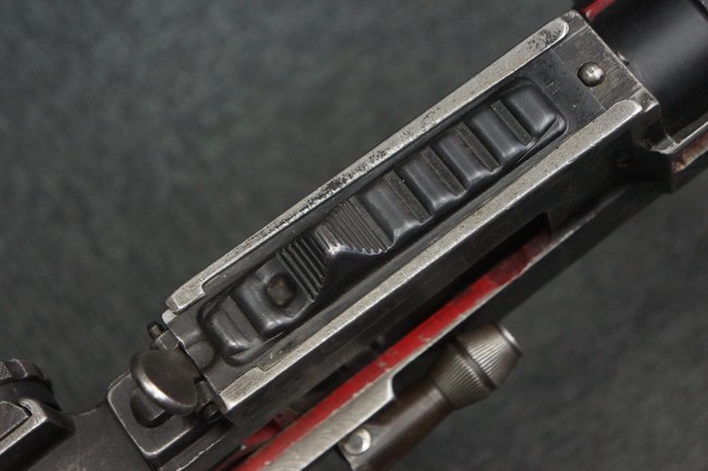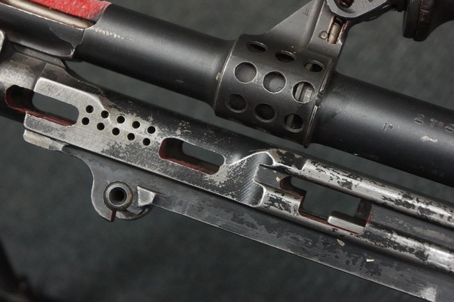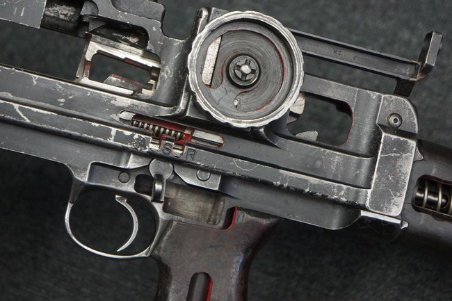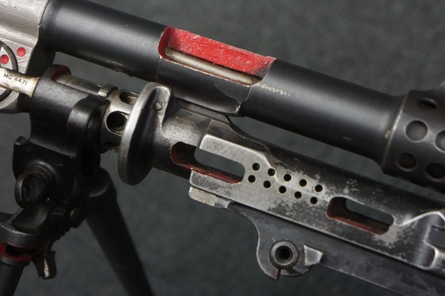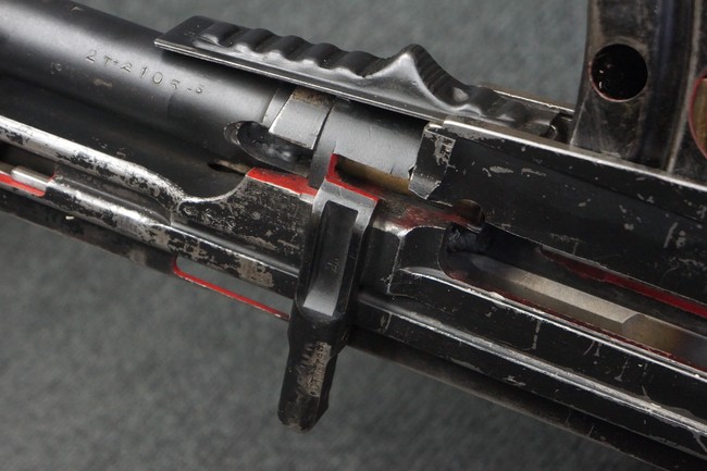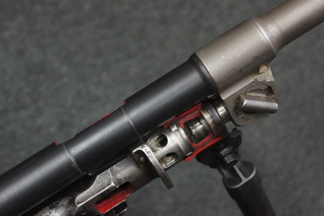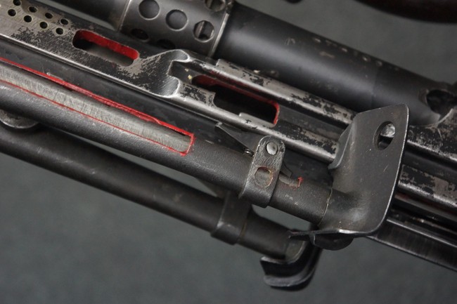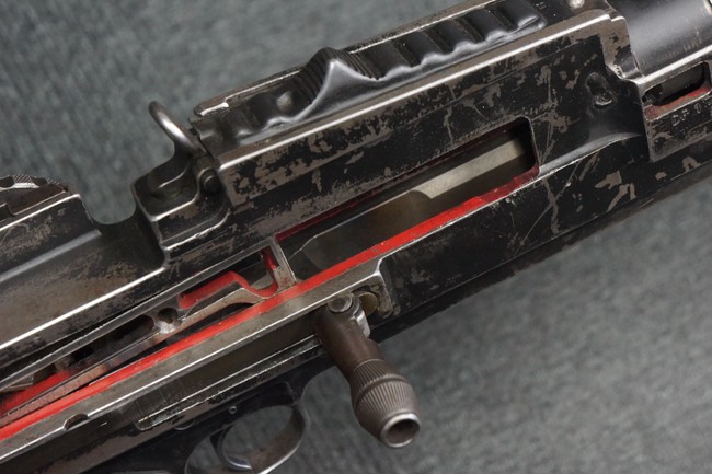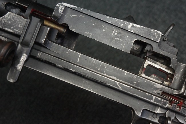 二脚の展開/伸縮やダイヤル・サイトの調整、マガジン取り付け部のダスト・カバーの開閉、キャリング・ハンドルの角度変更、マガジンの着脱については問題なく行う事が可能です。 また、トリガーとの連動はありませんが、セレクター・レバーの切り替えは可能です。 尚、排莢孔のダスト・カバーについては固定されています。 付属のマガジンについても、内部が見えるように穴が開けられており、フォロワーはやや下がった位置で固定されています。 マガジンについても全体にやや使用感が見られます。