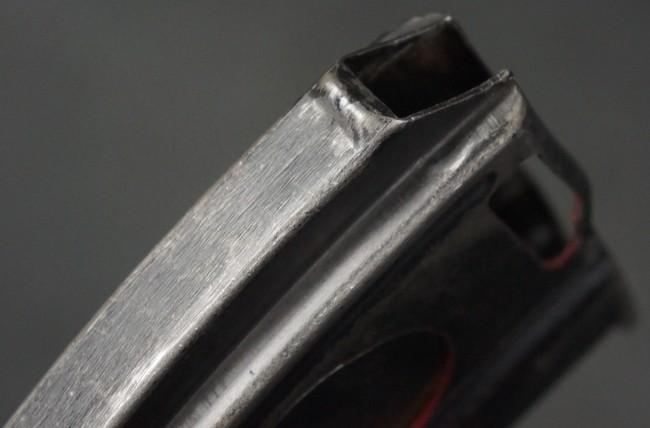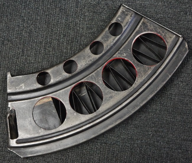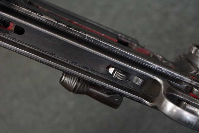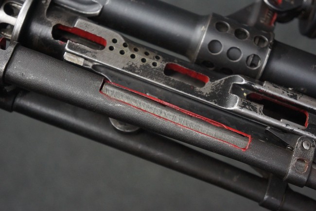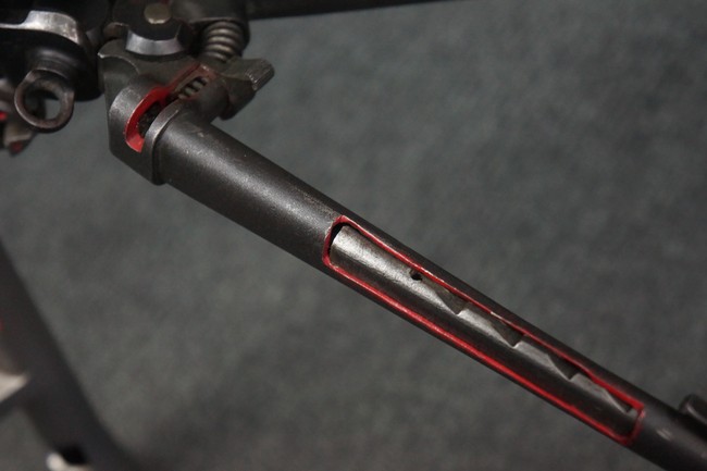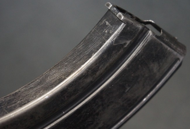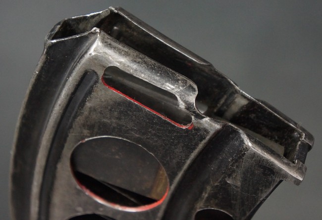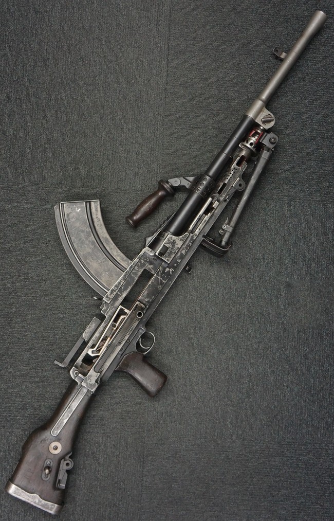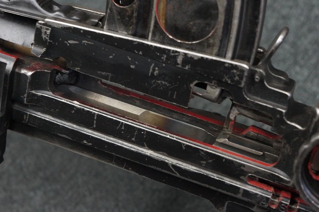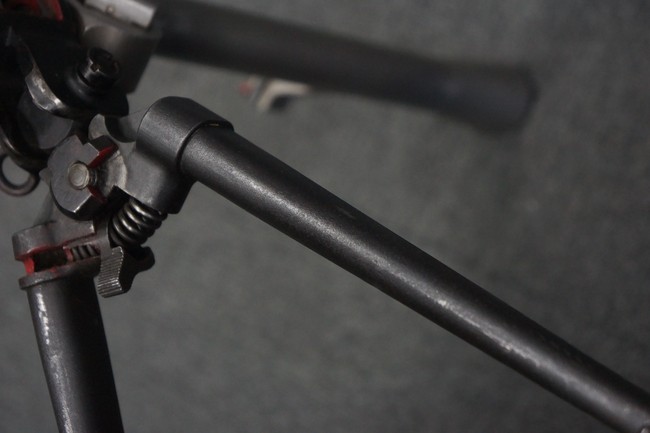 二脚の展開/伸縮やダイヤル・サイトの調整、マガジン取り付け部のダスト・カバーの開閉、キャリング・ハンドルの角度変更、マガジンの着脱については問題なく行う事が可能です。 また、トリガーとの連動はありませんが、セレクター・レバーの切り替えは可能です。 尚、排莢孔のダスト・カバーについては固定されています。 付属のマガジンについても、内部が見えるように穴が開けられており、フォロワーはやや下がった位置で固定されています。 マガジンについても全体にやや使用感が見られます。
