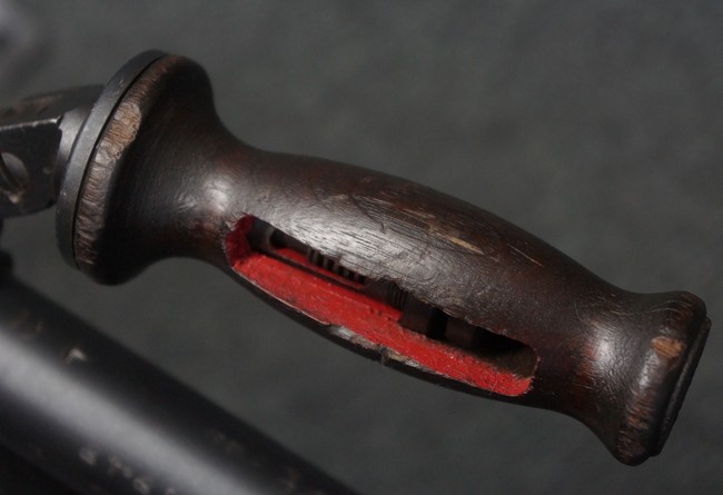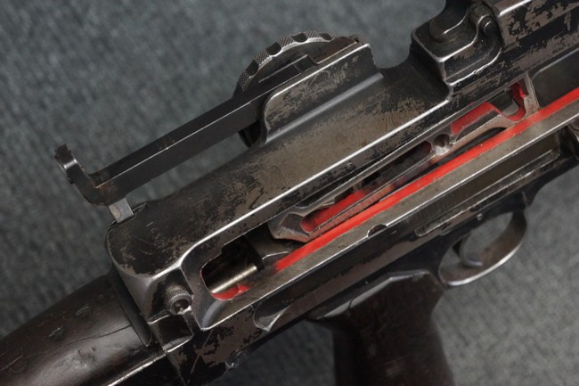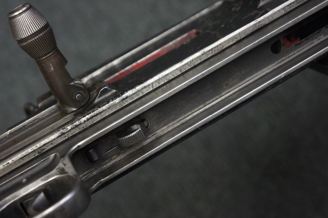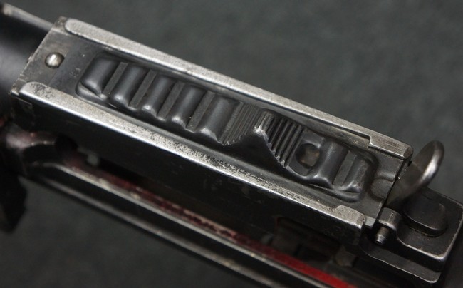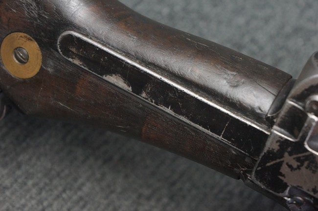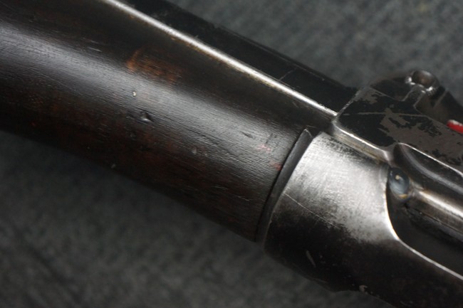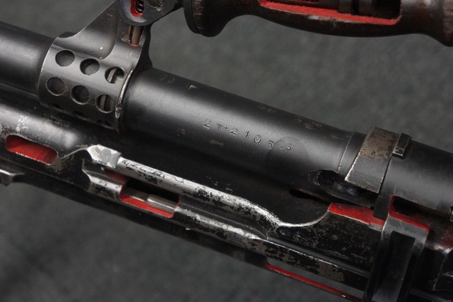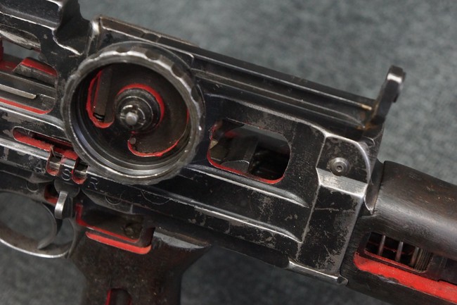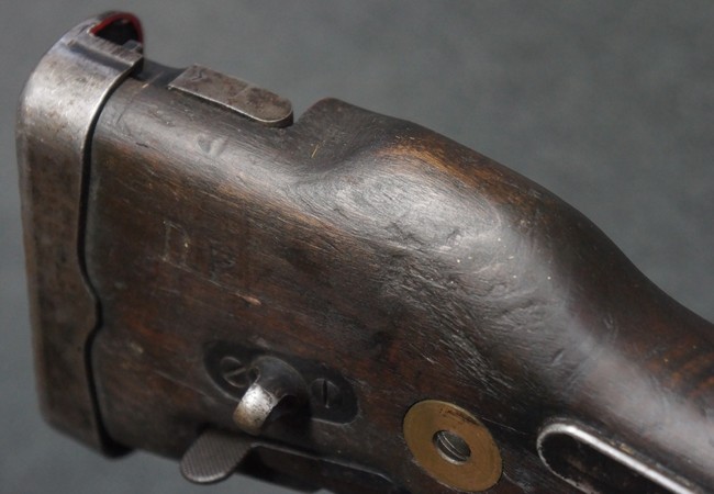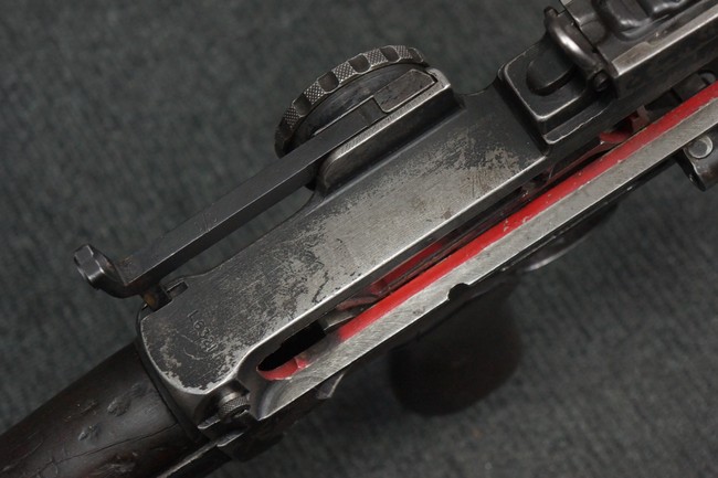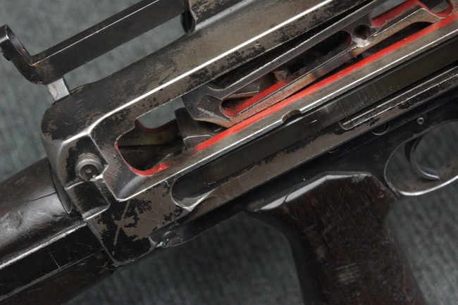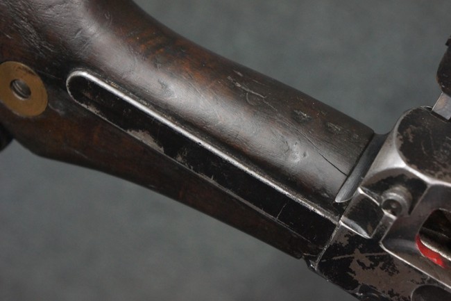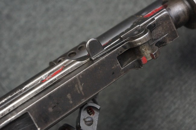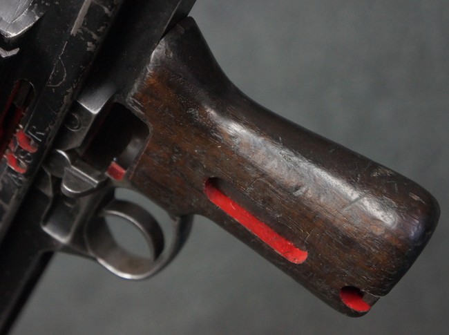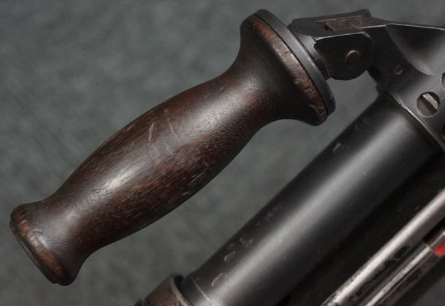 本品は全体に使い込まれたコンディションとなっており、銃身や機関部といった金属部は、やや打ち傷や仕上げの剥落が目立ち、金属の地肌が表れている箇所等も見受けられますが、目立った欠損等は見られず、概ねしっかりとした状態が保たれています。 木製のグリップやキャリング・ハンドル、バット・ストックについても、やや打ち傷や線傷、若干の欠けの他、グリップ基部やバット・ストック基部に一部ひびが見られるものの、こちらも比較的しっかりとした状態が保たれています。 バット・プレートに一部凹みが見られます。