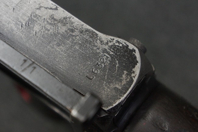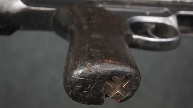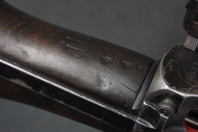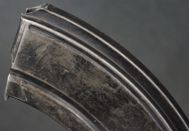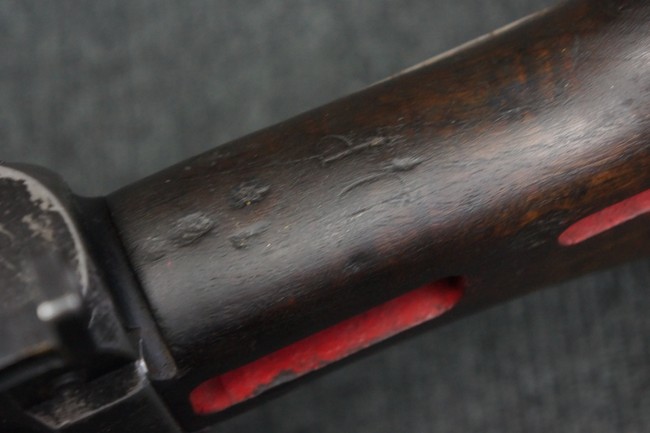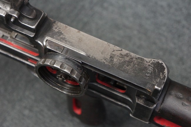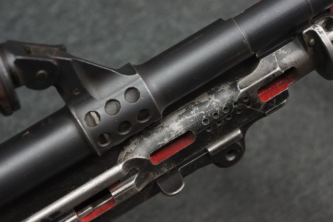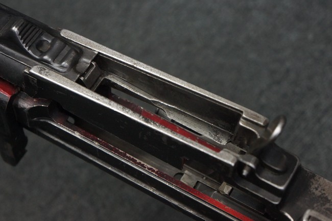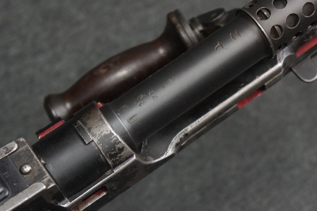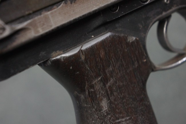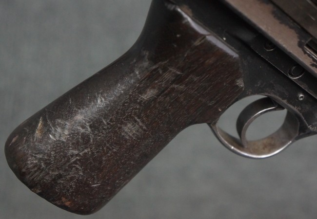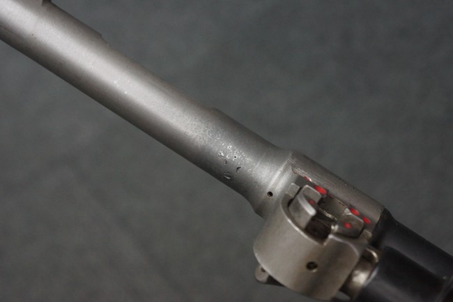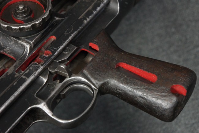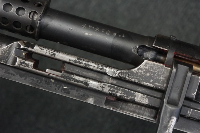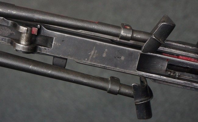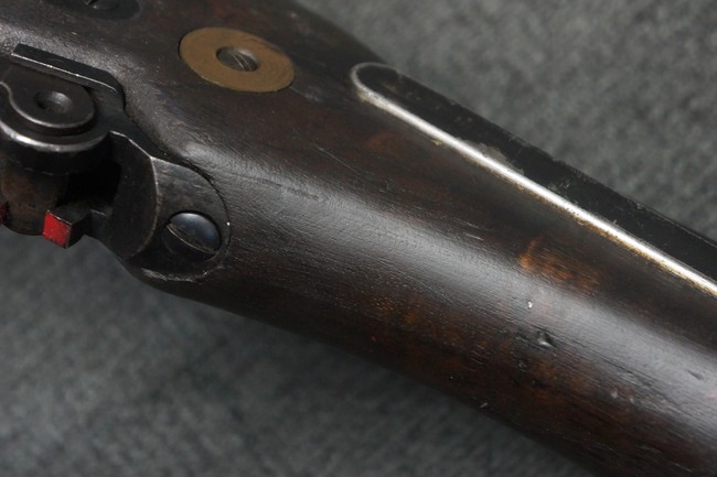 本品は全体に使い込まれたコンディションとなっており、銃身や機関部といった金属部は、やや打ち傷や仕上げの剥落が目立ち、金属の地肌が表れている箇所等も見受けられますが、目立った欠損等は見られず、概ねしっかりとした状態が保たれています。 木製のグリップやキャリング・ハンドル、バット・ストックについても、やや打ち傷や線傷、若干の欠けの他、グリップ基部やバット・ストック基部に一部ひびが見られるものの、こちらも比較的しっかりとした状態が保たれています。 バット・プレートに一部凹みが見られます。