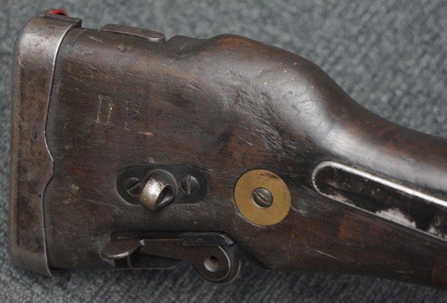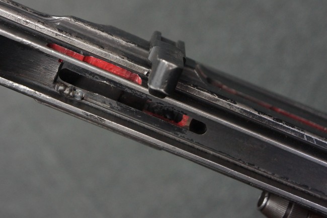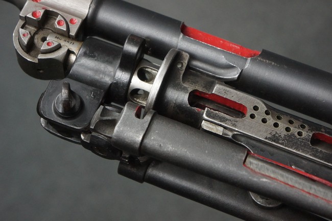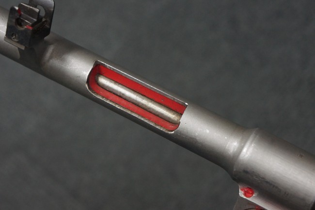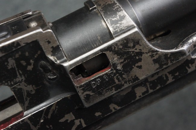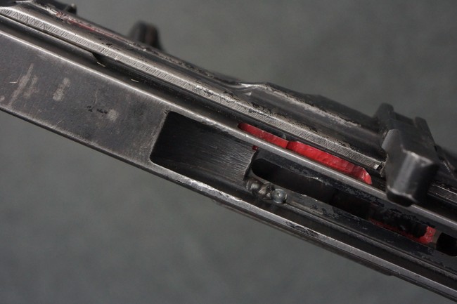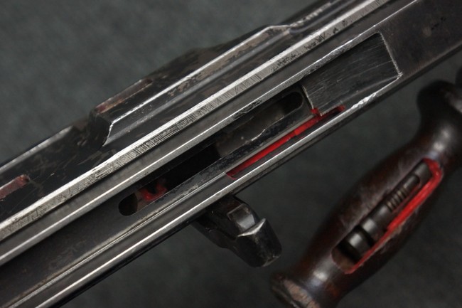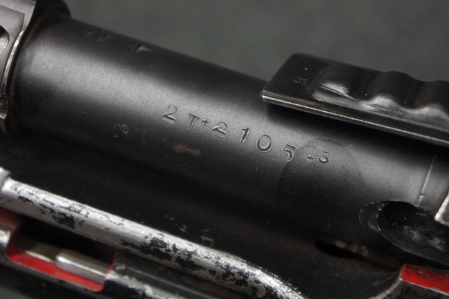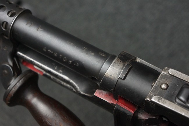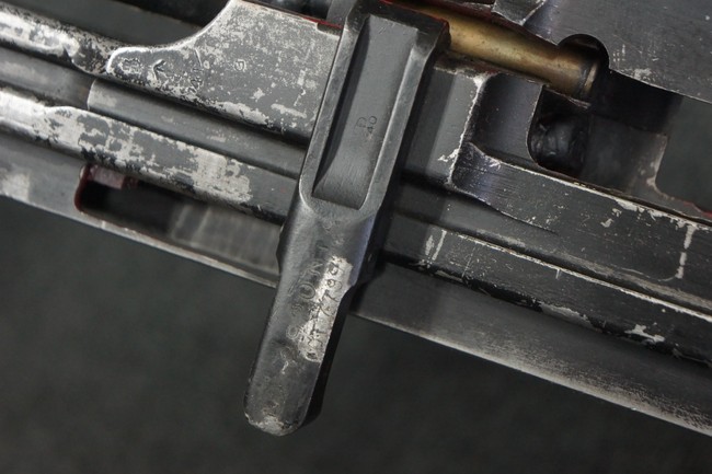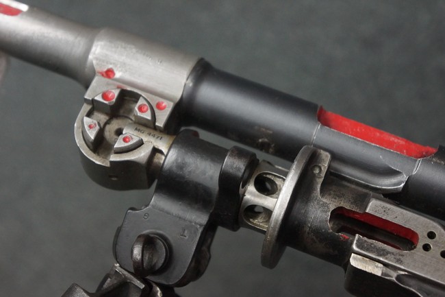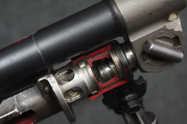 本品のバット・ストックはサポート・ハンドルが取付け可能ですが、ショルダー・レストがない戦時型Mk Iタイプで、銃身についても先端形状が簡略化された戦時型Mk Iタイプとなっています。 本品の銃身交換用レバー前方のレシーバー左側面にはブロード・アロー刻印の他、王冠と「41」を組み合わせた刻印やエンフィールド造兵廠を示すEDの刻印が確認出来ます。 また、コッキング・ハンドル基部には、オーストラリアのLITHGOW造兵廠を示す「MA」の刻印が確認出来ます。 その他、レシーバー右側面やバット・ストック両側面にはDrill Purposeを意味する「DP」の刻印が打刻されています。 各部のシリアルNo.は、レシーバーがL6321、銃身交換用レバーが2920N(0T7799)、銃身が2T2105となっています。 内部が見えるよう本体に開けられた窓からは、無可動となった今でも十分に内部構造が楽しめ、資料性が高い一品となっております。 (無可動加工方法は他の無可動実銃と同様ですので、ボルトなどの機関部は作動いたしません)。