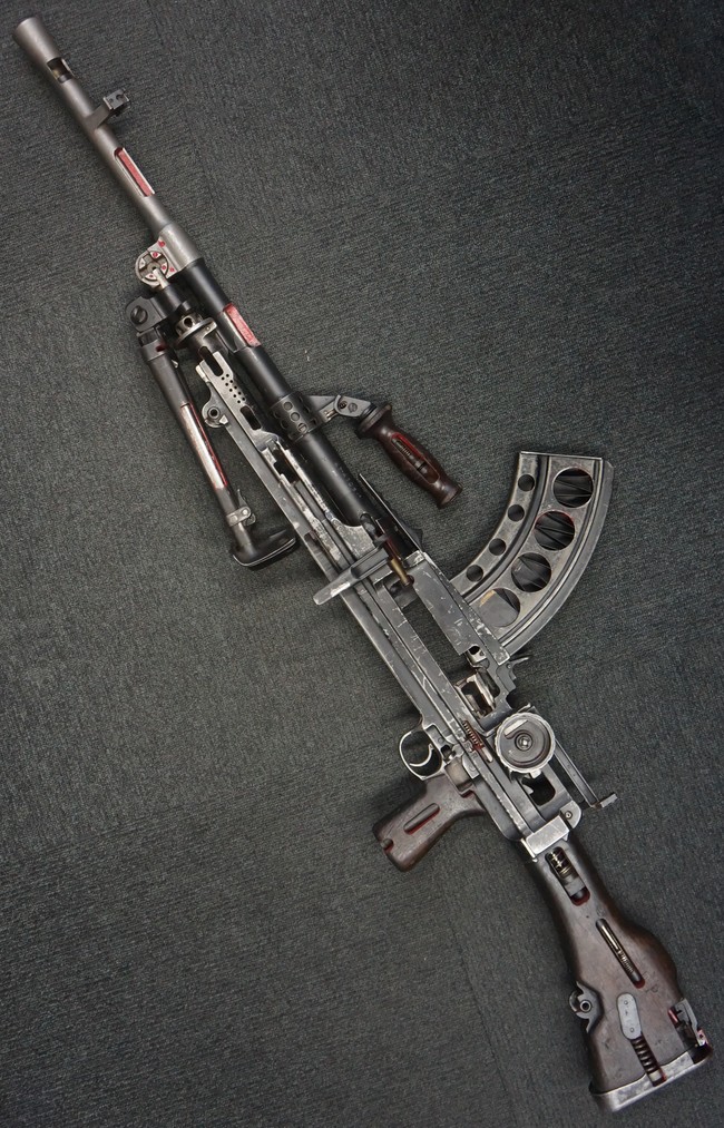 第二次世界大戦で使用された英軍の主要軽機関銃です。 第一次世界大戦後の1920年代、英軍はそれまでの主力軽機関銃であったルイス軽機関銃に代わる新たな軽機関銃のトライアルを開始しました。 1930年代に入るとチェコ製のZB Vz.26の改良型であるZB Vz.27軽機関銃 (後に更なる改良型のZB Vz.30軽機関銃) を新たに候補に加えてトライアルが続けられ、最終的にはこのZB系軽機関銃に改良を加えた物がブレン軽機関銃 (ブレンガン) として英軍に制式採用されました。 ブレン (BREN) の名称は、チェコのブルーノ (Brno) 造兵廠と英国のエンフィールド (Enfield) 造兵廠の名称を組み合わせた物です。 ブレン軽機関銃では.303ブリティッシュ弾を使用する事から、マガジンはバナナ型の形状に変更されています。