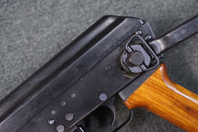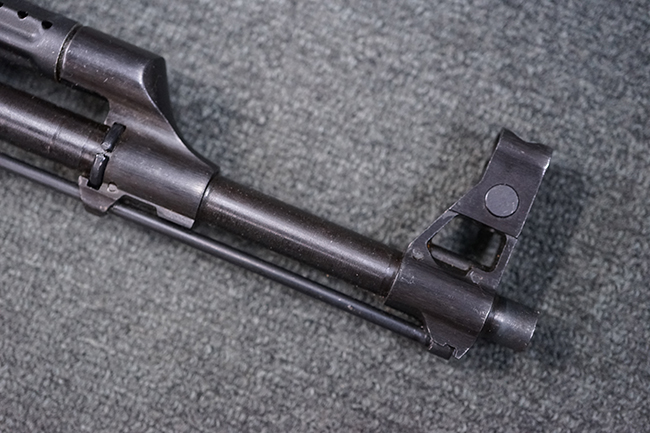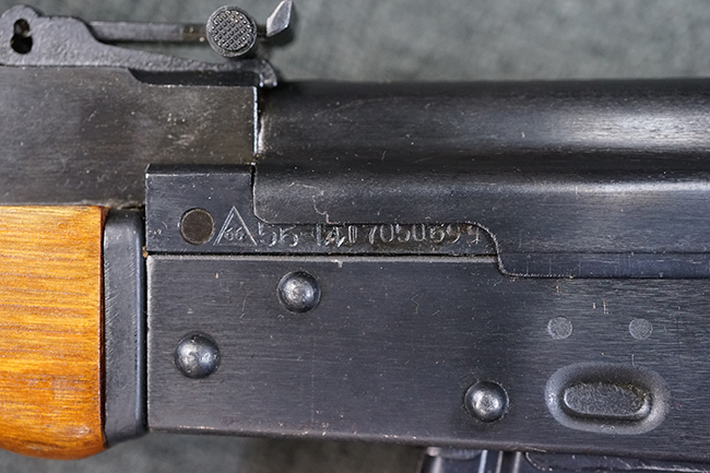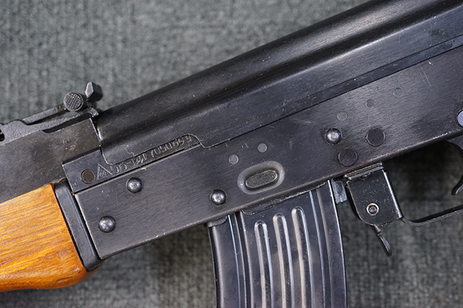 本品はレシーバーがプレス加工により製作されたモデルで、基本的にはソ連製のAKMSに相応する品です。 レシーバー左側面には「三角の中に66」の造兵廠刻印及び、「56-1式」のモデル名が刻印されています。 セレクター・レバーの刻印は「連 (=フル・オートマチック)」及び「単 (=セミ・オートマチック)」の漢字表記となっています。 シリアルNo.はレシーバー、レシーバー・カバー、ボルト・キャリア、リコイル・スプリング・ガイドが(170)47058でマッチしています。
