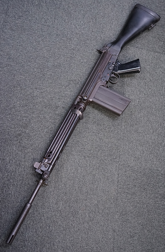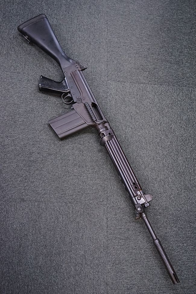 ベルギー FN社のFAL自動小銃を元に、オーストリアで改良・開発された自動小銃で、1958年に行われたトライアルでスペインのセトメ自動小銃及び米国のAR10自動小銃を破ってオーストリア陸軍に制式採用となりました。 FAL自動小銃からの主な変更点として、プレス製のメタル・ハンドガード及び折り畳み式の二脚が装備されているのが特徴です。 このため外観が西ドイツのGew.1自動小銃に酷似していますが、銃口部にチューブ径22mmのグレネード・ランチャーとして機能するサプレッサーが装備されている点が異なります。 このサプレッサーにはSTRIMやMECARといったライフル・グレネードを装着する事が可能でした。 また、このサプレッサーの先端には4本の溝が設けられており、内部にはワイヤーを捉えるためのネジが切られています。 このサプレッサー先端部分でワイヤーを捉えて銃を発射する事により、ワイヤー・カッターとして使用する事も可能となっています。 StG.58自動小銃の内、最初に納入された2万挺はベルギーのFN社で生産された品を輸入した物でしたが、その後オーストリアのステアー・ダイムラー・プフ社でライセンス生産が行われました。 初期生産品の銃床は木製の物が装備されていましたが、後に黒色の樹脂製銃床へと変更されています。 また、オーストリアで生産された品のガス・プラグには、取り外しボタンにL字型の板が取り付けられている物も見られます。 尚、StG.58自動小銃にはGew.1自動小銃と同様に銃剣は用意されていませんでした。 StG.58自動小銃は、1977年に後継のステアーAUG自動小銃が制式採用された後も、1980年代半ば頃まで多くの部隊で使用された他、現在でもオーストリア軍の訓練用小銃として使用されています。 (KK)