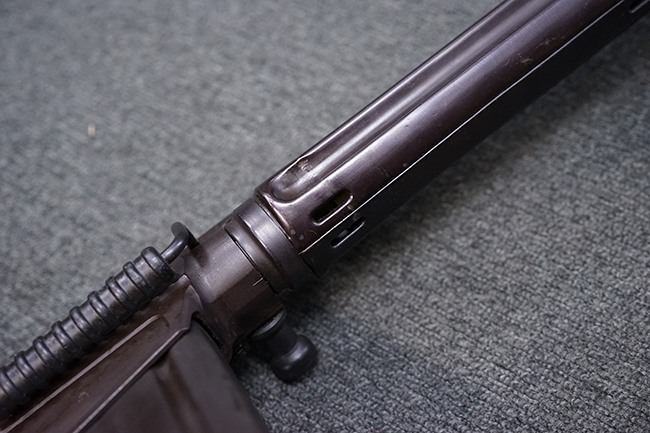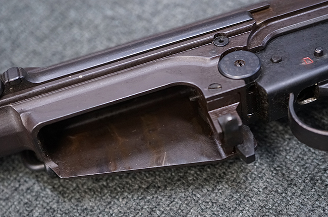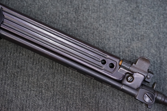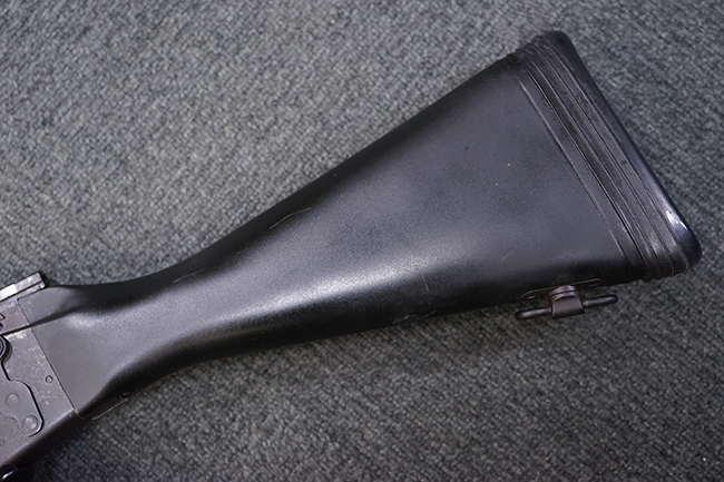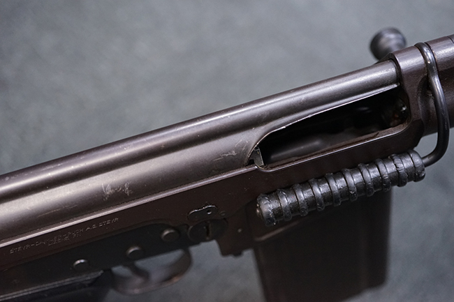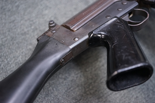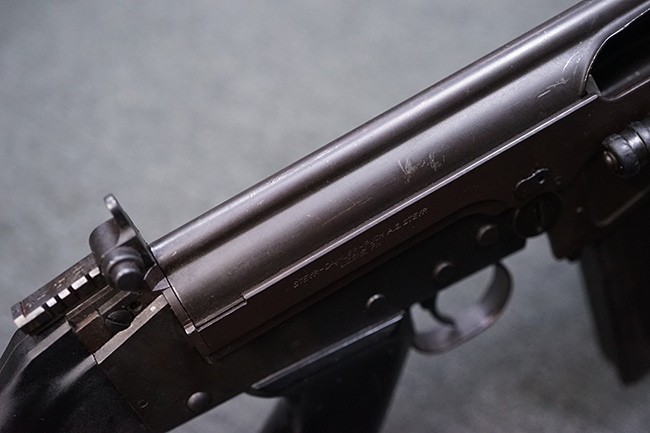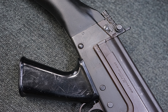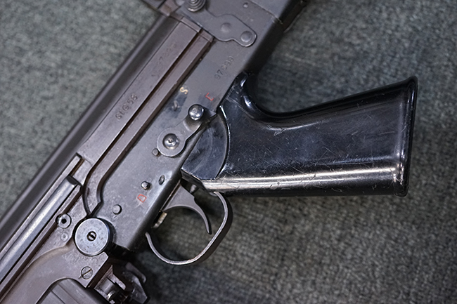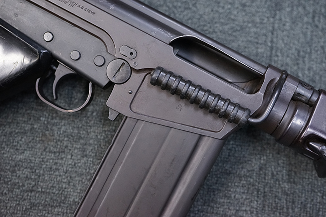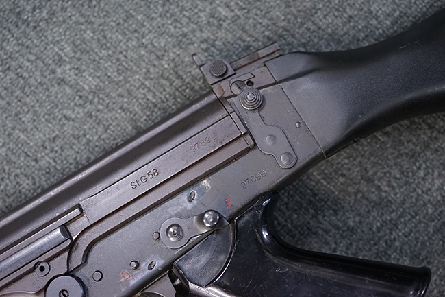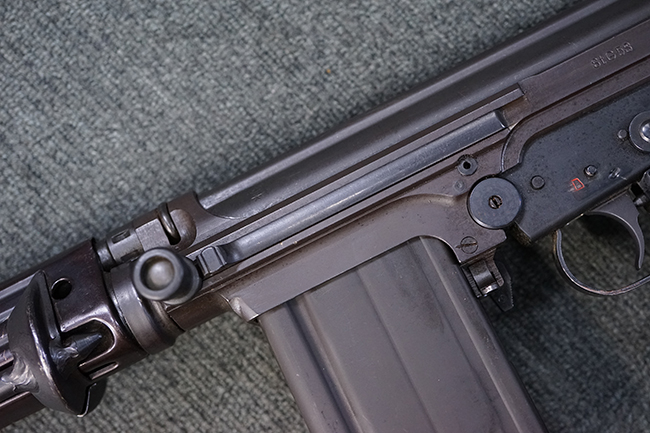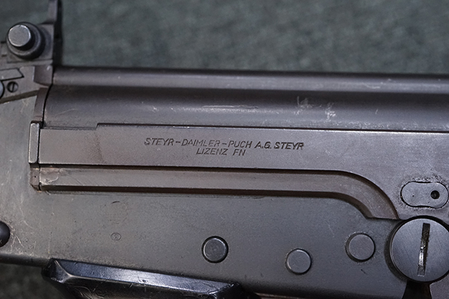 本品はアッパー・レシーバー右側面にはステアー社のライセンス生産を示す「STYER-DAIMLER-PUCH A.G. STEYR LIZENZ FN」の刻印が見られます。 本品のバット・ストックは樹脂製で、セレクターは「S-E-D」のドイツ語表記となっています。 シリアルNo.は、アッパー/ロア・レシーバーでマッチしています。