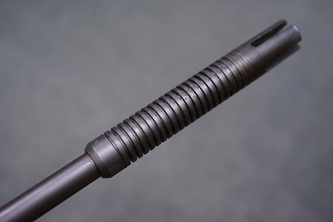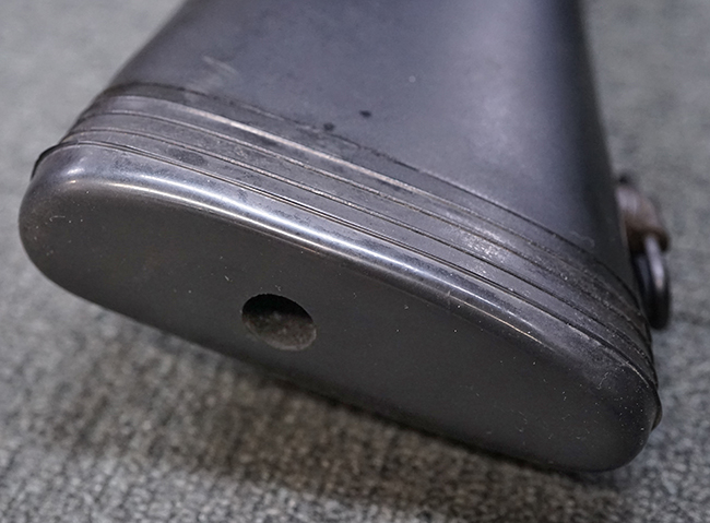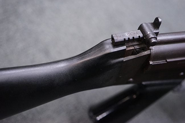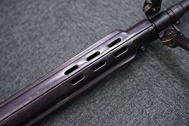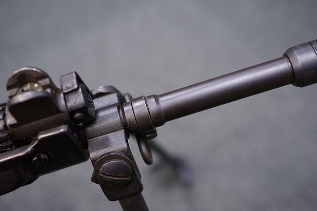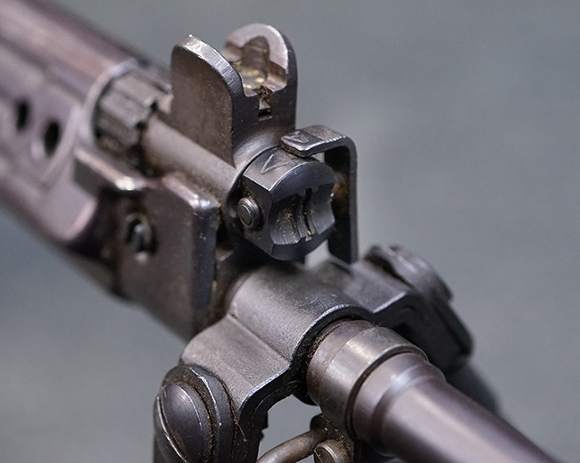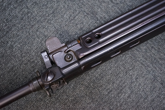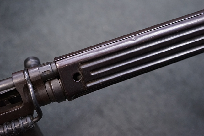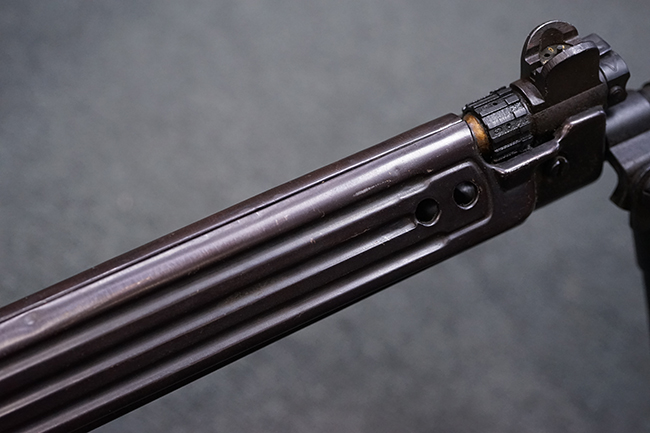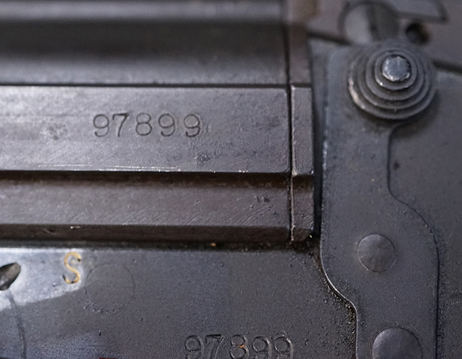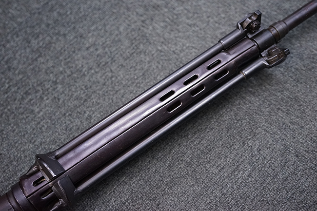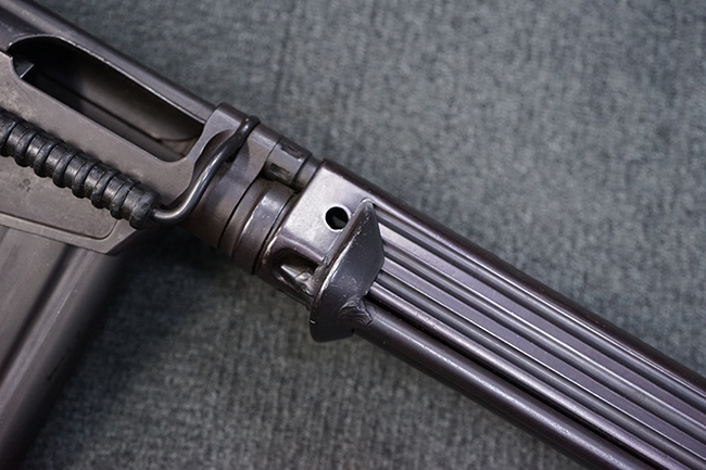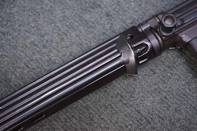 本品はアッパー・レシーバー右側面にはステアー社のライセンス生産を示す「STYER-DAIMLER-PUCH A.G. STEYR LIZENZ FN」の刻印が見られます。 本品のバット・ストックは樹脂製で、セレクターは「S-E-D」のドイツ語表記となっています。 シリアルNo.は、アッパー/ロア・レシーバーでマッチしています。