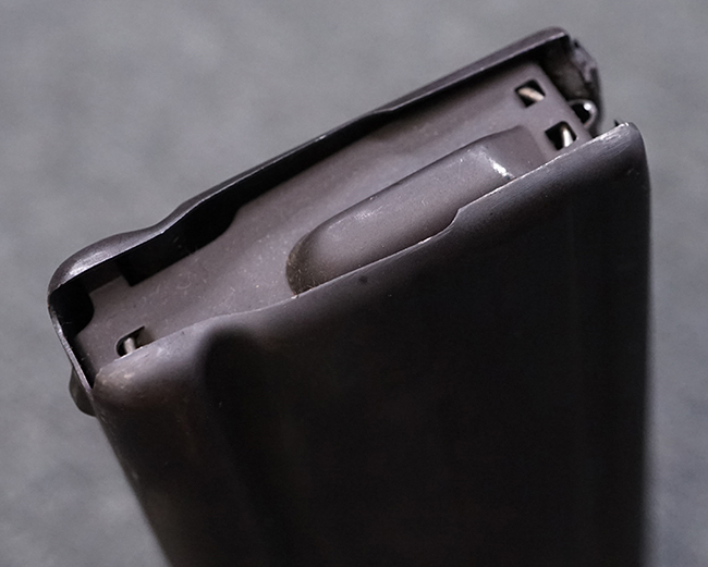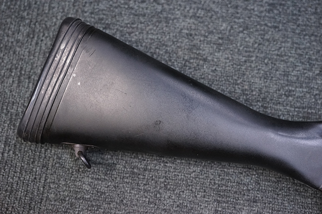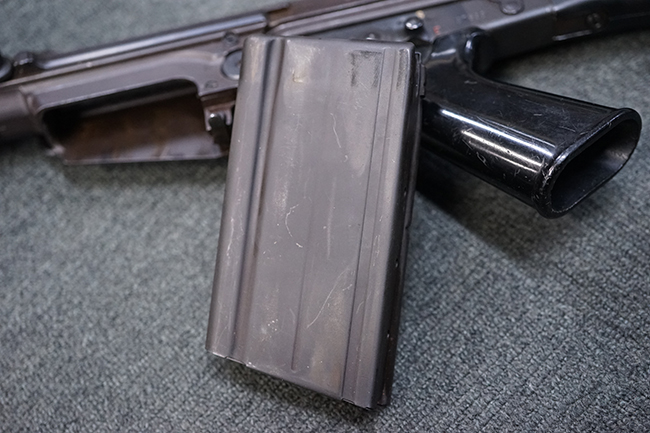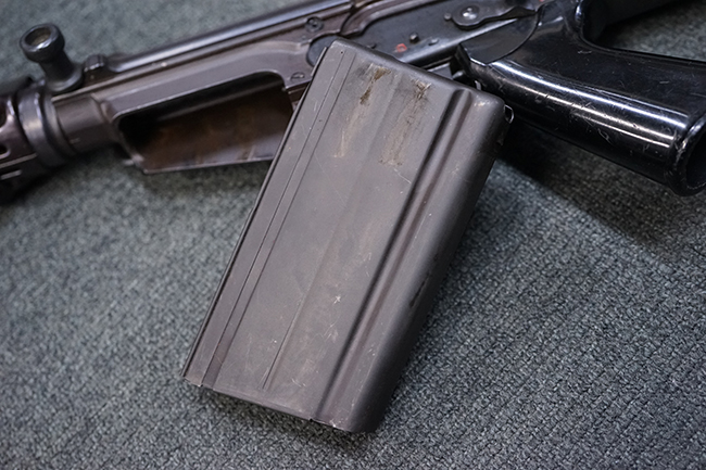 全体に若干の使用感が見受けられますが、全体的にみると状態の良い品です。 金属部は、多少の小傷や擦れ、経年による褪色が見られますが、目立った欠損等は見られず、しっかりとした状態が保たれています。 樹脂製のバット・ストックも、細かな打ち傷が全体に見られますが、大きな破損等は見られず、がたつきなども見られません。 樹脂製のバット・プレートとグリップも、やや打ち傷や若干の擦れが見られますが、現状目立った破損は見受けられません。 マガジンの着脱やリア・サイトの調整については問題なく行う事が可能です。 セレクターの切り替えも可能で、安全位置でトリガーがロックされます。 また、レシーバー左側面のレバーを操作する事により、レシーバーのテイクダウンも可能となっています。 付属のマガジンは本体と状態が揃った良い状態で、目立った凹みや変形等は見受けられません。 マガジン・スプリングは入っています。