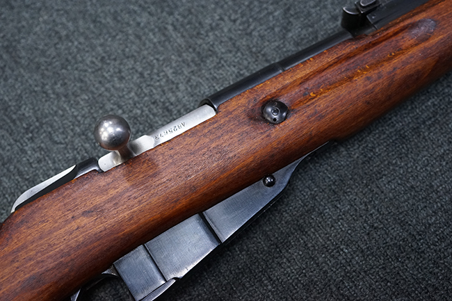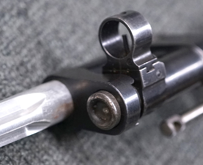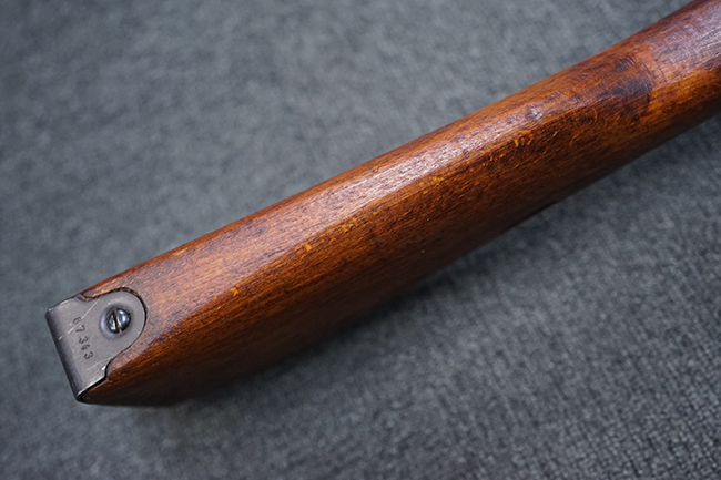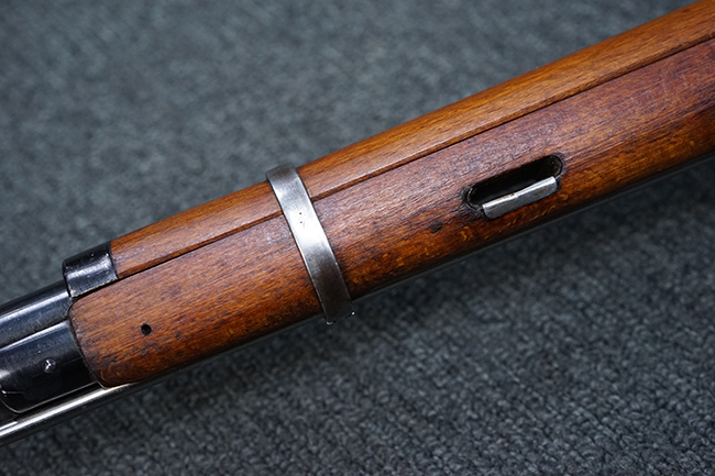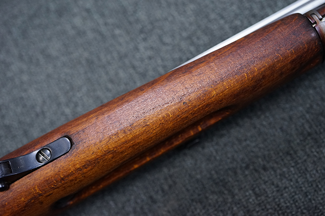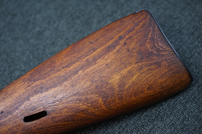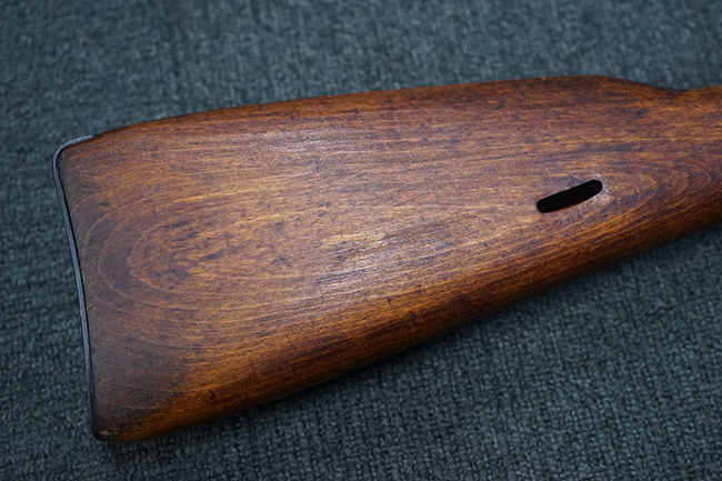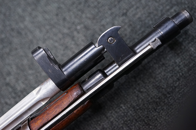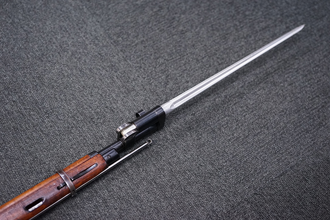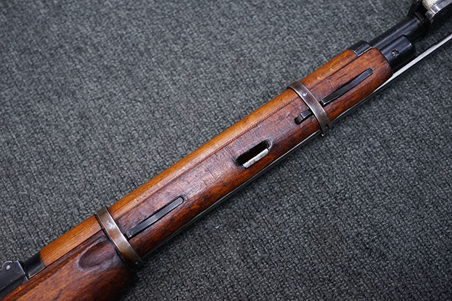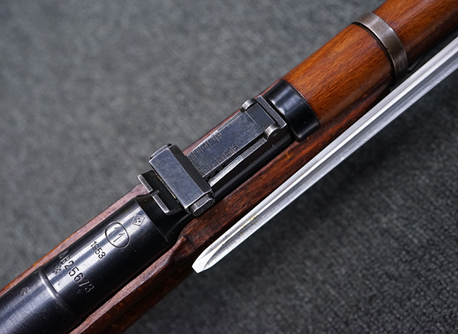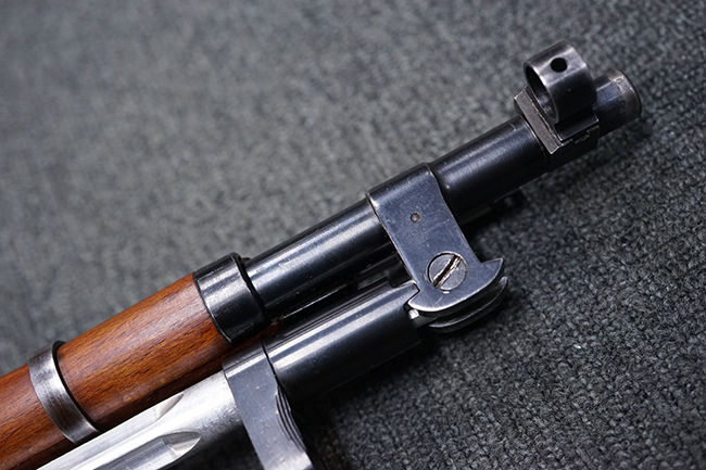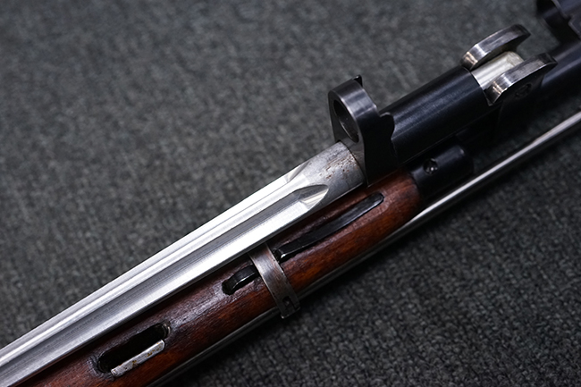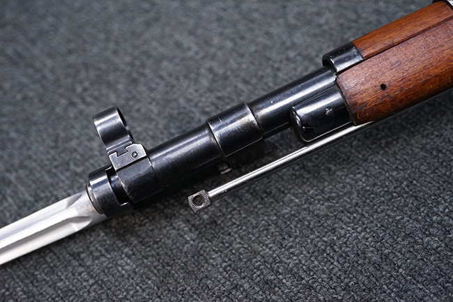 機関部や銃身といった金属部はブルーイング仕上げで、角張った部分や銃剣基部など擦れやすい箇所は地金っぽくなっているものの、全体的に多少の小傷が見られる程度で大変鮮やかです。 前後のバンドとボルト、クリーニング・ロッドは白磨きで多少のくすみが感じられますが、やはり目立った損傷はなく良い状態です。 木製銃床についても、大きな破損等は見られず、しっかりとした状態が保たれています。 付属の銃剣はアルミ製の合法模造刀身に置き換えられており、起剣操作を楽しむことが出来ます。 リア・サイトの調整については問題なく行う事が可能です。 マガジン・スプリングは除去されています。