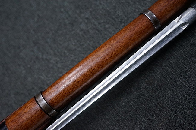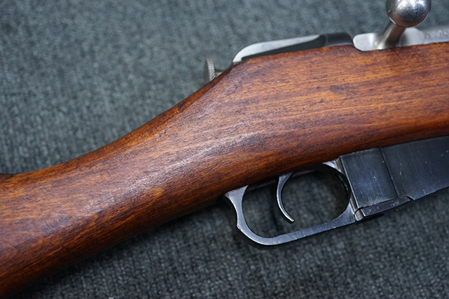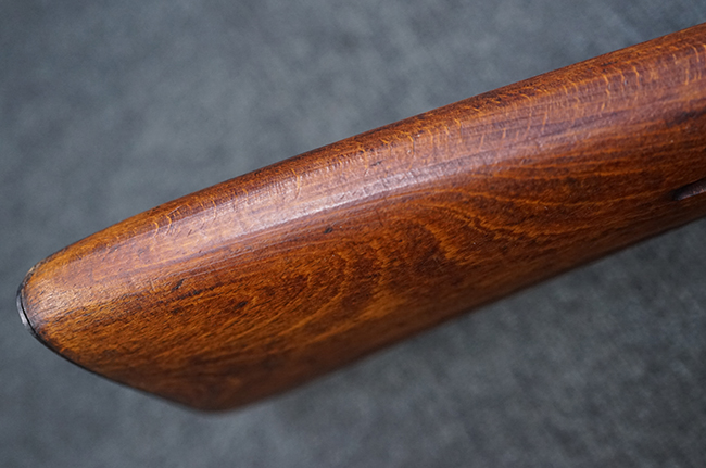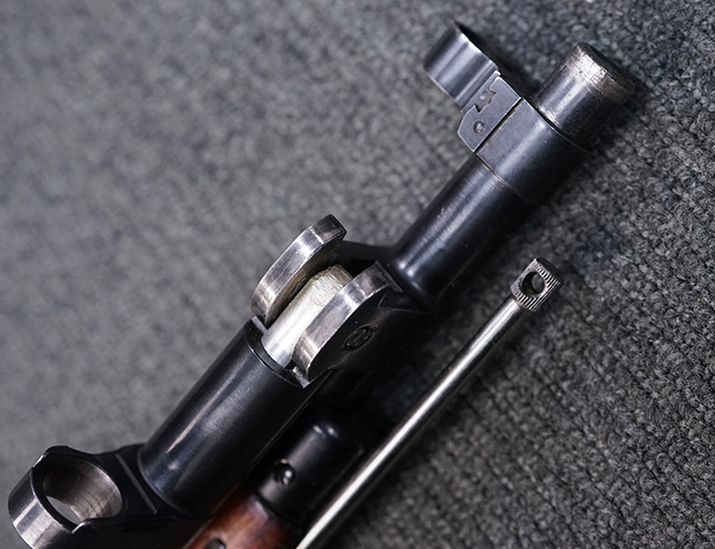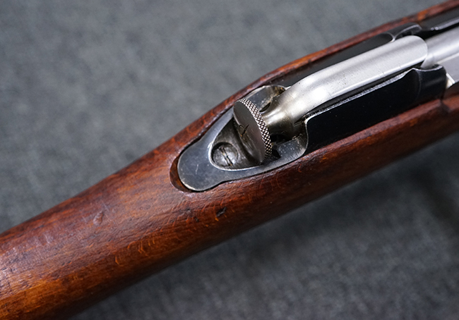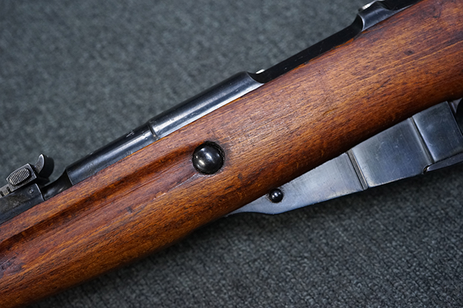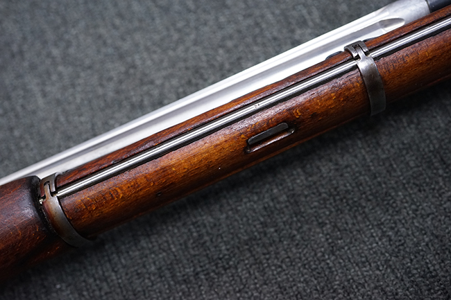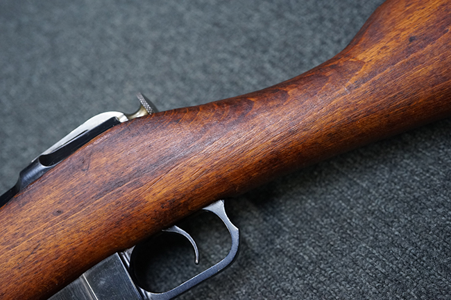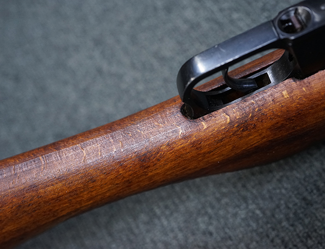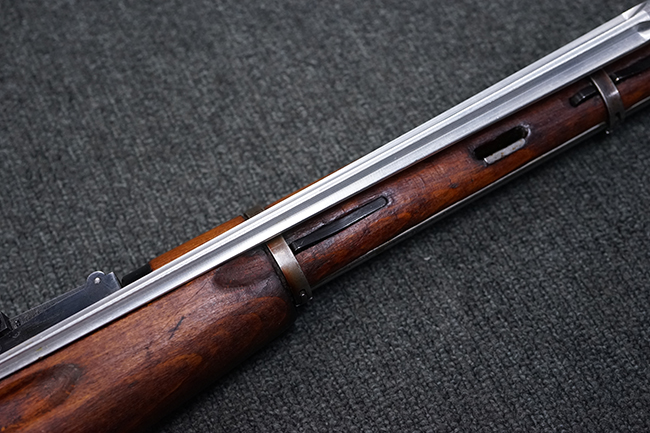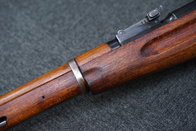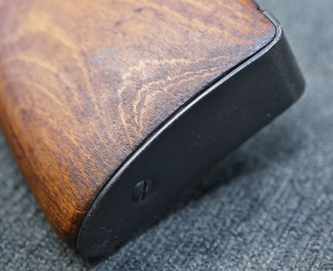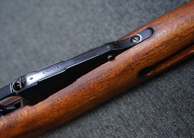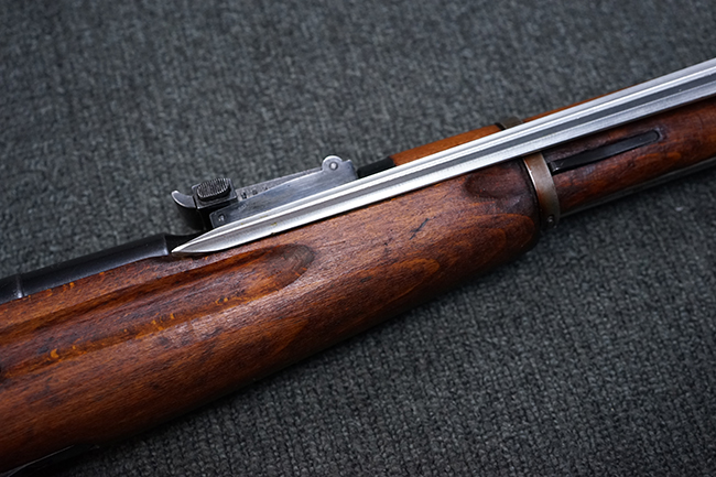 機関部や銃身といった金属部はブルーイング仕上げで、角張った部分や銃剣基部など擦れやすい箇所は地金っぽくなっているものの、全体的に多少の小傷が見られる程度で大変鮮やかです。 前後のバンドとボルト、クリーニング・ロッドは白磨きで多少のくすみが感じられますが、やはり目立った損傷はなく良い状態です。 木製銃床についても、大きな破損等は見られず、しっかりとした状態が保たれています。 付属の銃剣はアルミ製の合法模造刀身に置き換えられており、起剣操作を楽しむことが出来ます。 リア・サイトの調整については問題なく行う事が可能です。 マガジン・スプリングは除去されています。