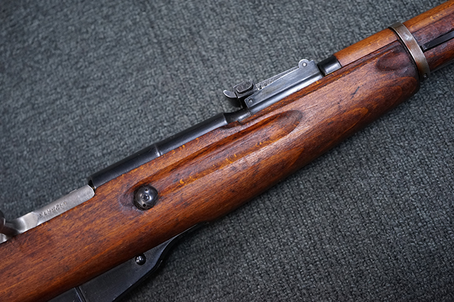 そのようなモシンナガン小銃のバリエーションの一つとして開発されたのがモシンナガン M1938 騎兵銃で、主に砲兵部隊や後方部隊等に配備されました。 M1891/30歩兵銃に比べて銃身や銃床前部、ハンドガードが短縮化された他、着剣機能が省略されています。 また、銃身の短縮に伴いクリーニング・ロッドも短縮された他、リア・サイトの最大射程についてもM1891/30歩兵銃の2,000mに対してM1938騎兵銃では1,000mへと変更されていました。 更に、M1891/30歩兵銃では銃身にフロント・サイト・ベースがろう接によって直接取り付けられていましたが、M1938騎兵銃ではスリーブ状のフロント・サイト・ベースを銃身に圧入した後、ピンにより側面から固定する構造へと変更されています。 M1938騎兵銃は1939年から1945年にかけて主にイジェフスク造兵廠で製造された他、ツーラ造兵廠でも1940年と1944年に製造が行われました。
