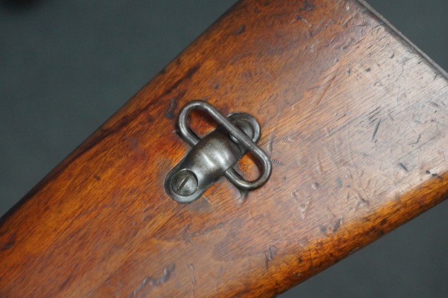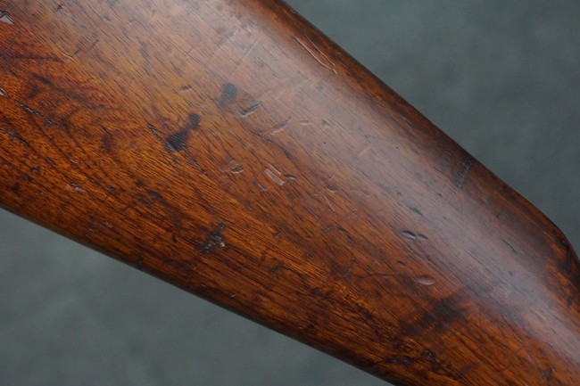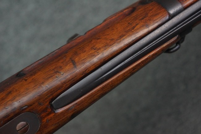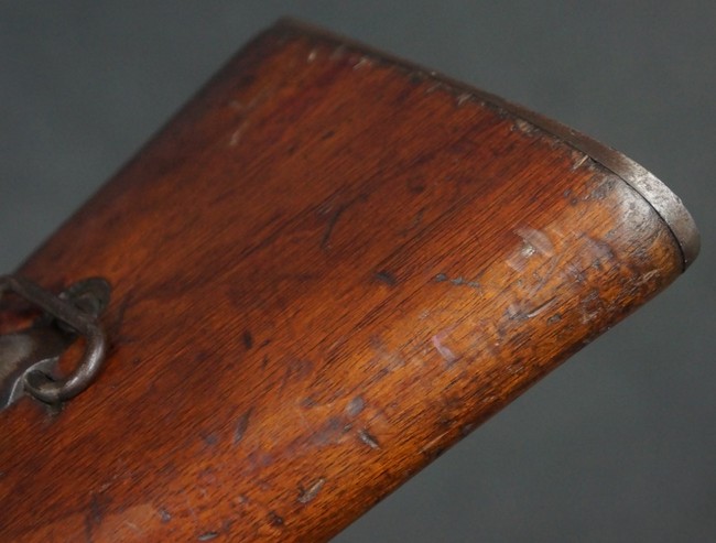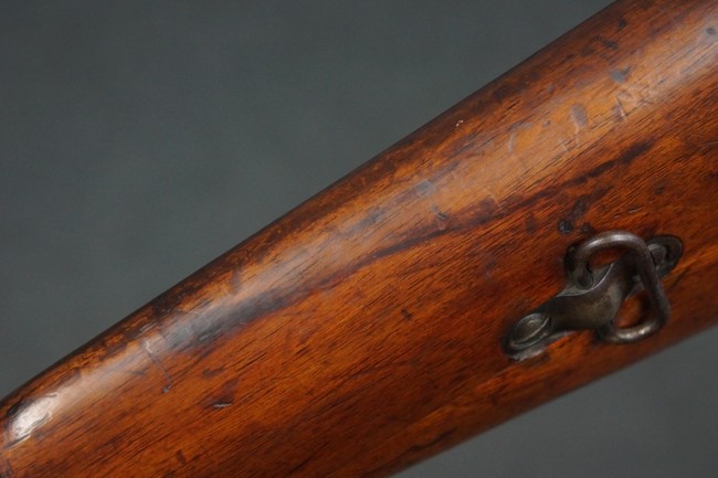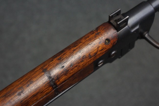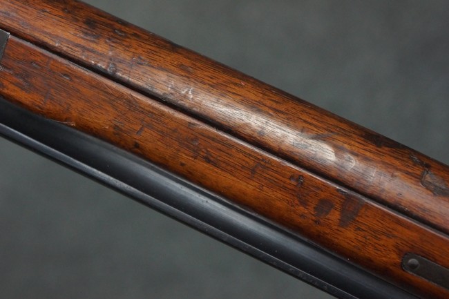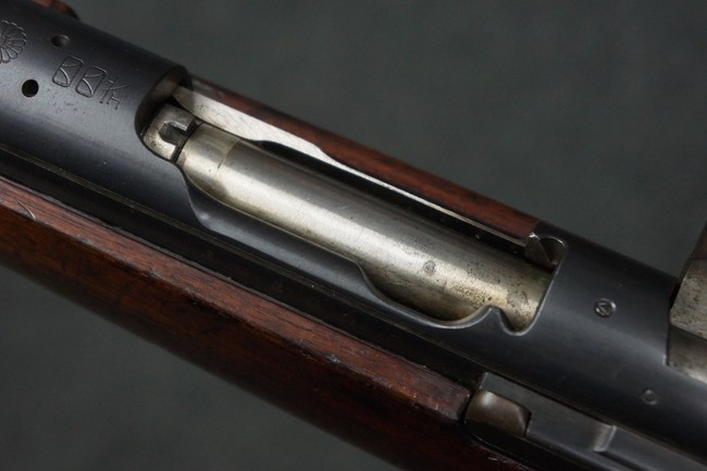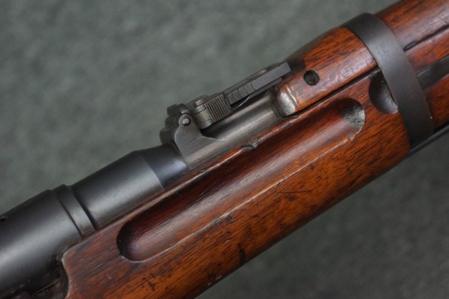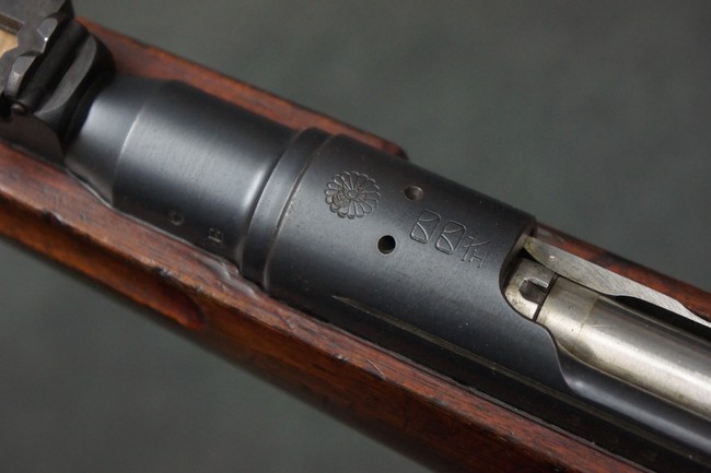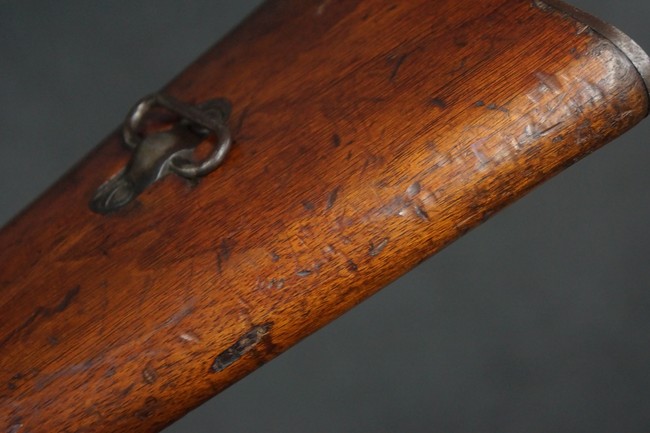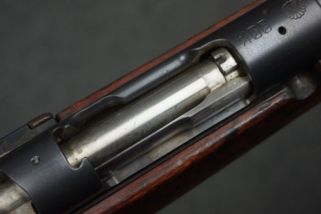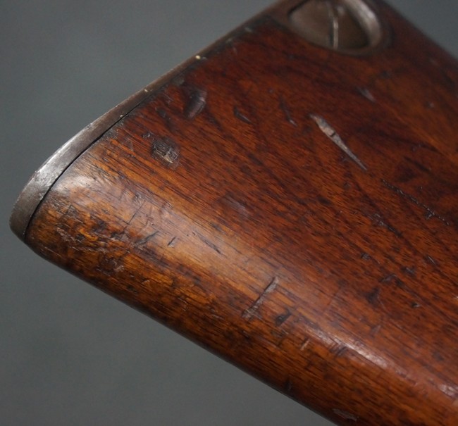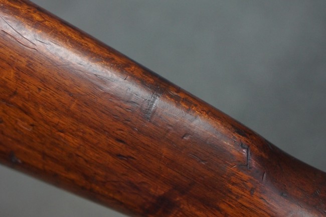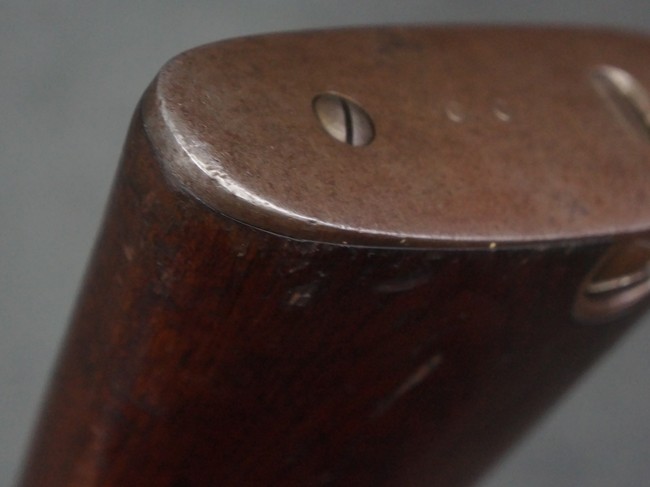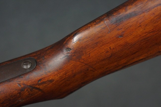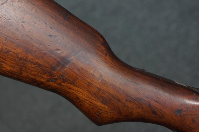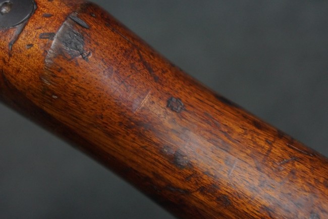 本品の銃身や機関部といった金属部は、やや経年による褪色や若干の時代錆及び表面錆痕が見受けられるものの、目立った欠損等は見受けられず、オリジナルの仕上げも比較的残っています。 木製銃床及び木被については、やや打ち傷や線傷が見られるものの、目立った破損等は見られず、オリジナルの色合いが比較的良好に保たれています。 木被上面には木目に沿って一部ヘアライン・クラックが見受けられますが、あまり気にならないレベルのもので、強度的にもしっかりとした状態が保たれています。 旧軍小銃特有の銃床上下の継ぎ目については、僅かな隙間は見られるものの、十分許容レベルで現状目立ったがたつきは見受けられません。 床尾板については、やや時代錆や表面錆痕、一部仕上げが落ちて金属の地肌が表れている箇所は見られますが、現状目立った朽ち込みや変形等は見られず、さく杖収納部の蓋の開閉機能についても正常です。 照尺の起倒・調整や弾倉底板の着脱については問題なく行う事が可能で、弾倉内の弾受 (フォロワー) 及び発条は入っています。 尚、安全子は固定されています。 銃剣は基部で溶接固定されており、起剣は出来なくなっています。