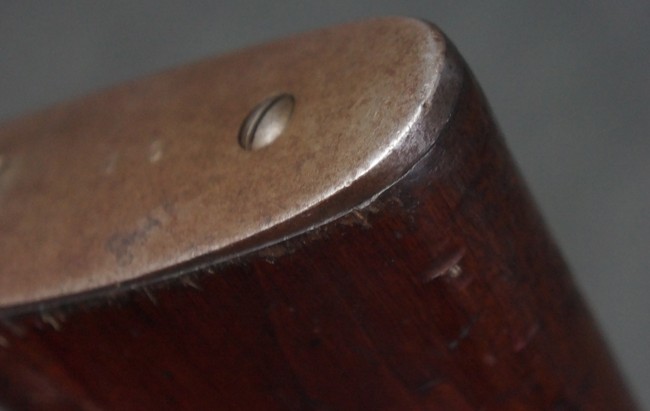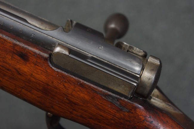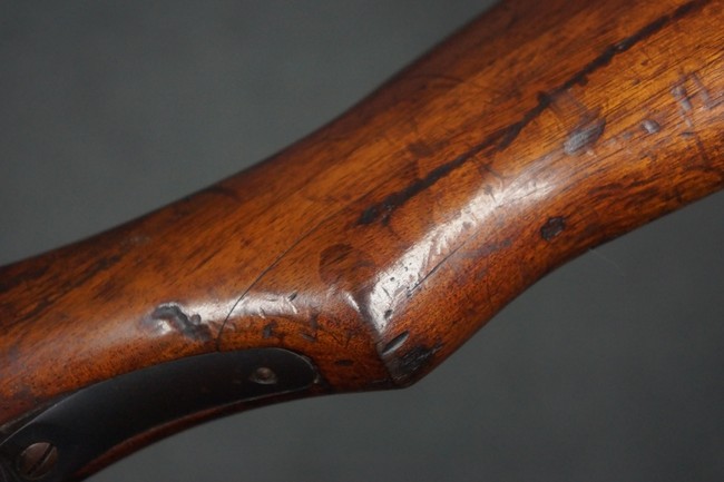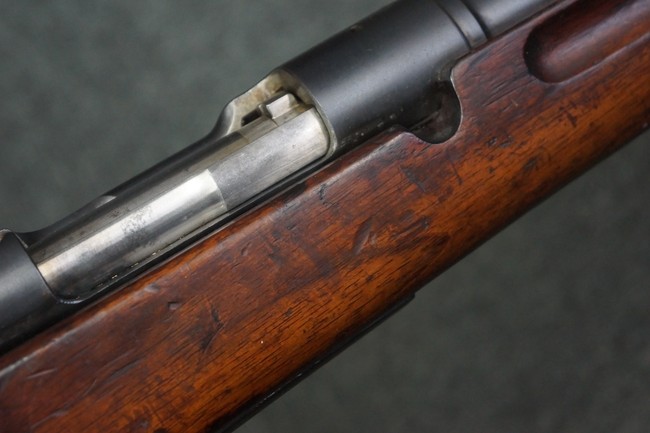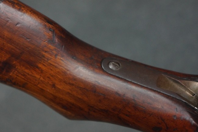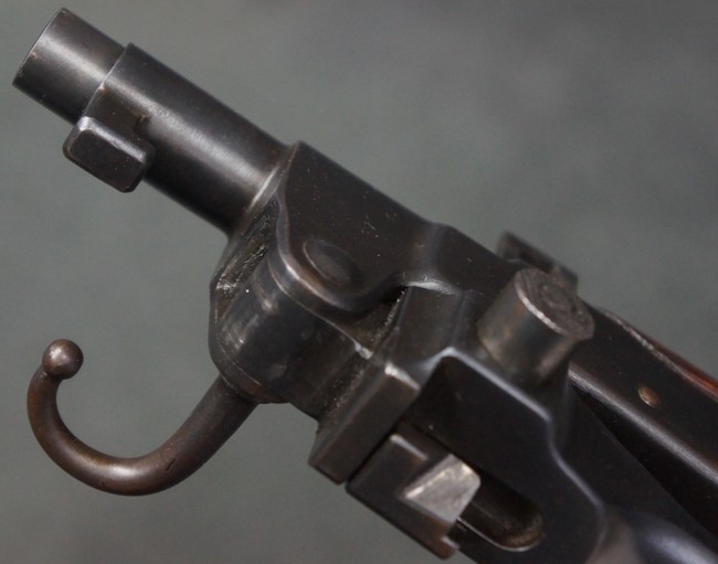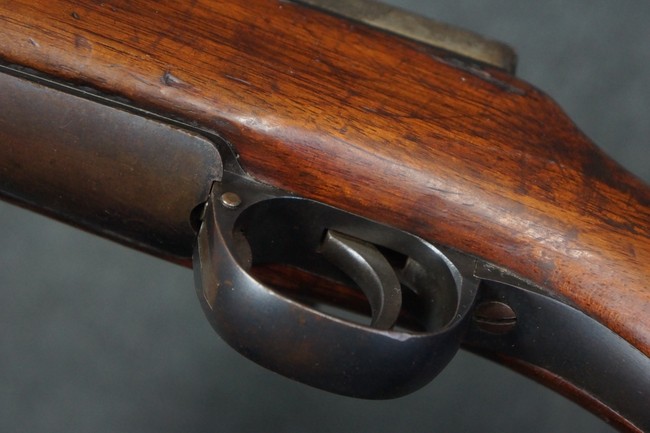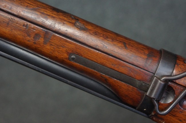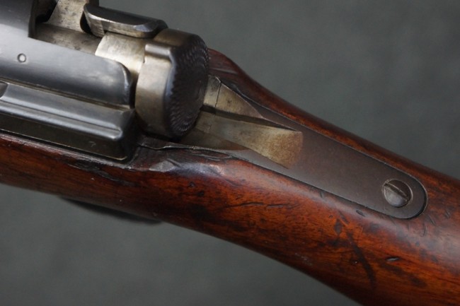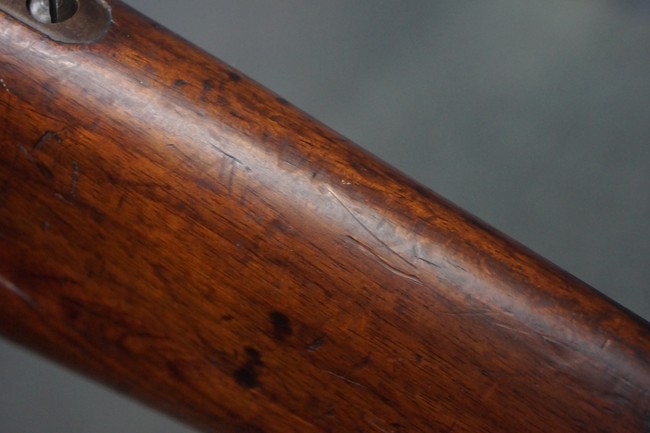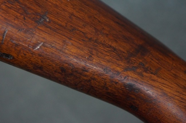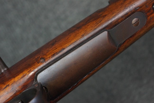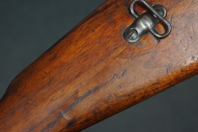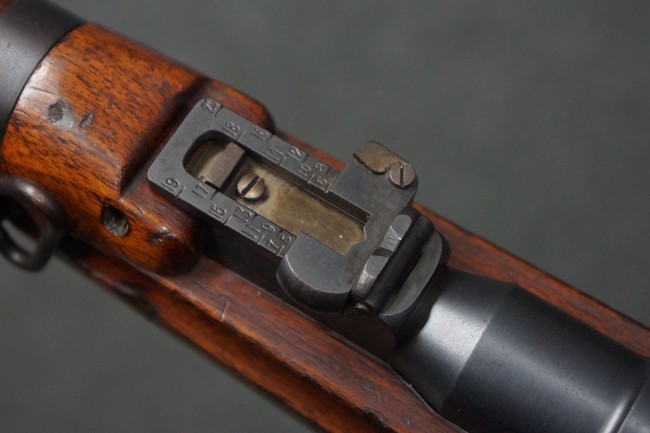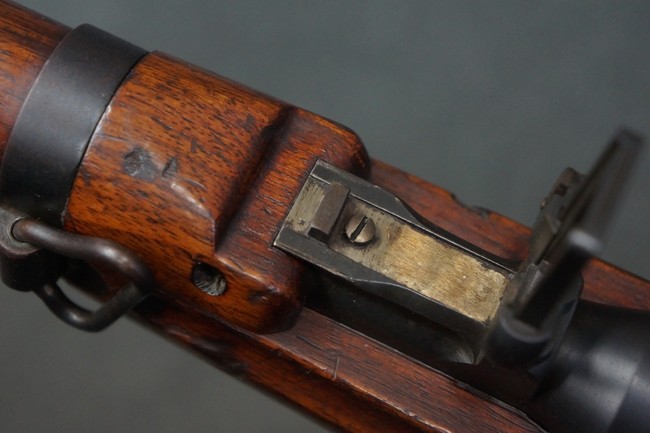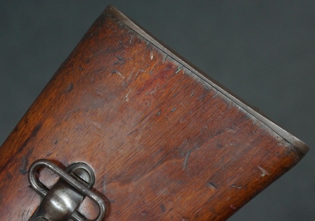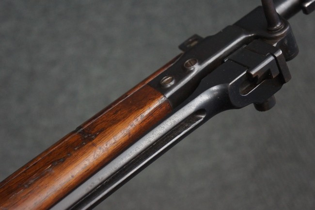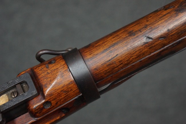 本品の銃身や機関部といった金属部は、やや経年による褪色や若干の時代錆及び表面錆痕が見受けられるものの、目立った欠損等は見受けられず、オリジナルの仕上げも比較的残っています。 木製銃床及び木被については、やや打ち傷や線傷が見られるものの、目立った破損等は見られず、オリジナルの色合いが比較的良好に保たれています。 木被上面には木目に沿って一部ヘアライン・クラックが見受けられますが、あまり気にならないレベルのもので、強度的にもしっかりとした状態が保たれています。 旧軍小銃特有の銃床上下の継ぎ目については、僅かな隙間は見られるものの、十分許容レベルで現状目立ったがたつきは見受けられません。 床尾板については、やや時代錆や表面錆痕、一部仕上げが落ちて金属の地肌が表れている箇所は見られますが、現状目立った朽ち込みや変形等は見られず、さく杖収納部の蓋の開閉機能についても正常です。 照尺の起倒・調整や弾倉底板の着脱については問題なく行う事が可能で、弾倉内の弾受 (フォロワー) 及び発条は入っています。 尚、安全子は固定されています。 銃剣は基部で溶接固定されており、起剣は出来なくなっています。