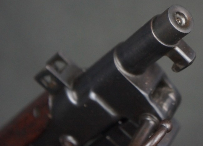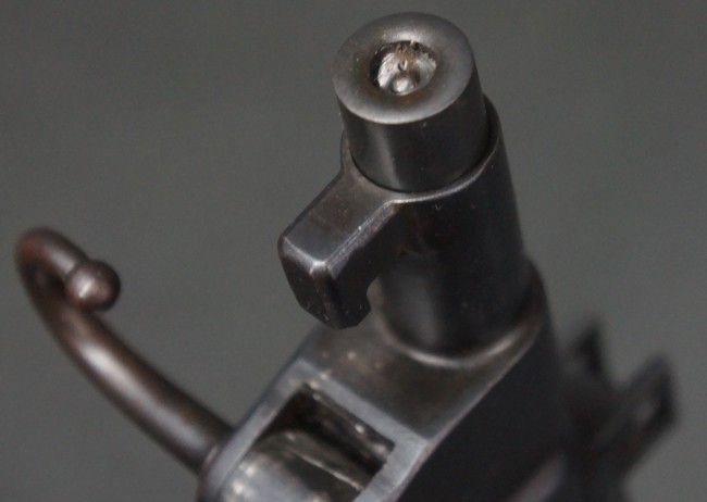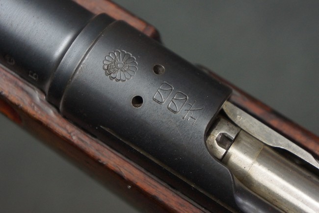 本品の機関部左側面にはシリアルNo.に加えて、小石川工廠を示す刻印が確認出来ます。 機関部上面には「四四式」の刻印がはっきりと確認出来、菊花紋章の中心付近には複数の円形の刻印が追加で打刻されています。