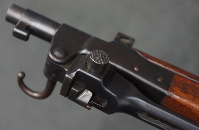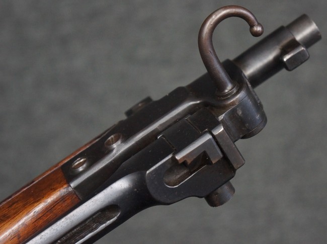 この為、三八式歩兵銃の騎銃型である三八式騎銃をベースに、折り畳み式のスパイク銃剣を追加し、馬上での利便性など更に騎兵用に特化させたモデルとして四四式騎銃が開発されました。 四四式騎兵銃は折畳み式の銃剣を追加した事によって前部のさく杖が廃止されています。 これにより叉銃ができなくなった為、叉銃専用のフックがフロント・バンド右側面に新たに追加されているのも特徴です。 また、四四式騎兵銃では、銃床の内部に二分割したさく杖を収納する構造となっており、この蓋の開閉を行う為のスイッチがバットストック後部右側面上部に設けられているのも特徴です。