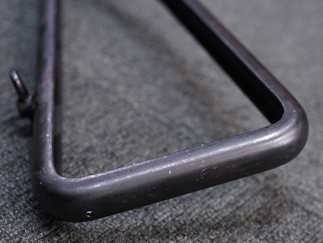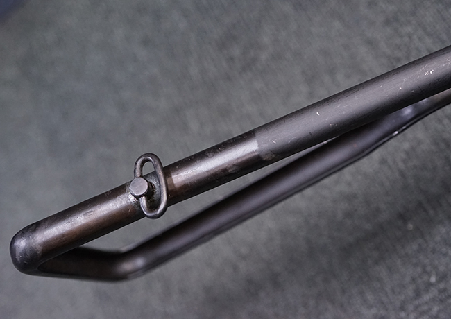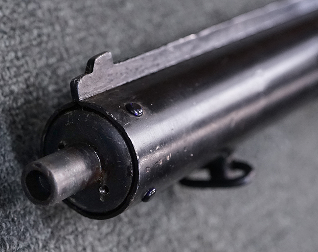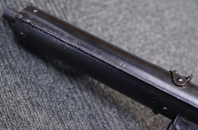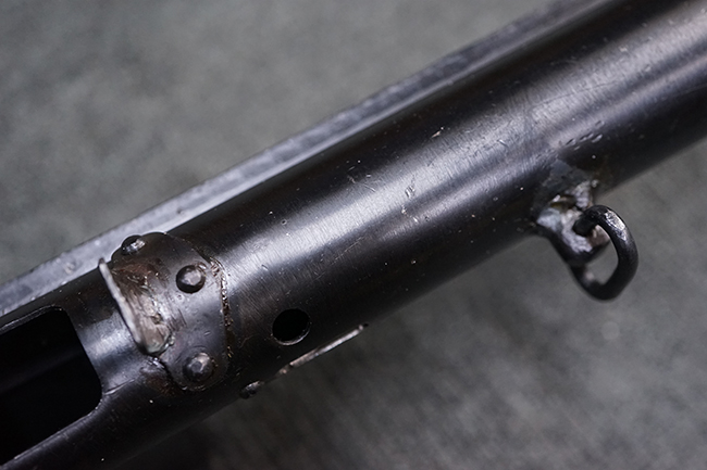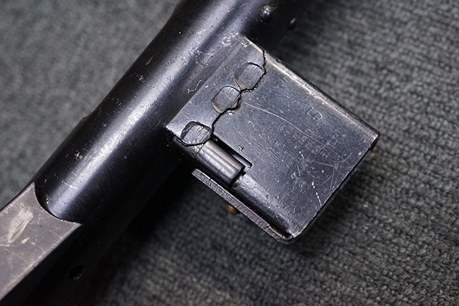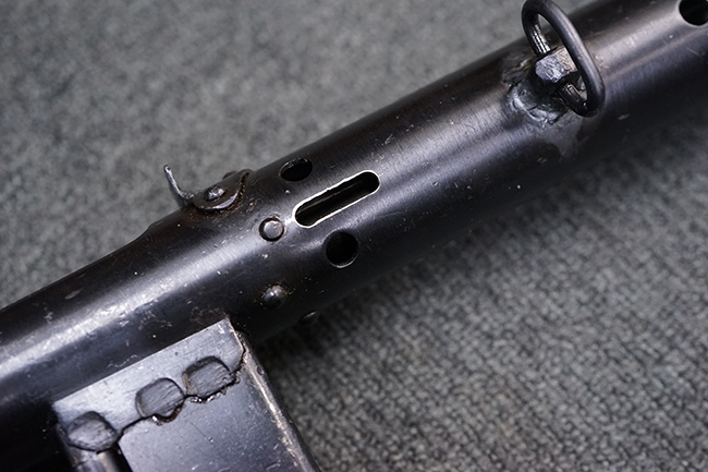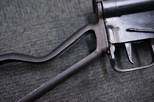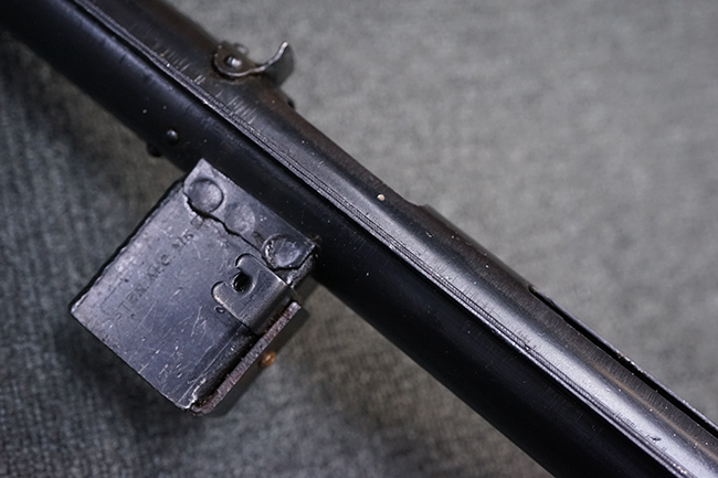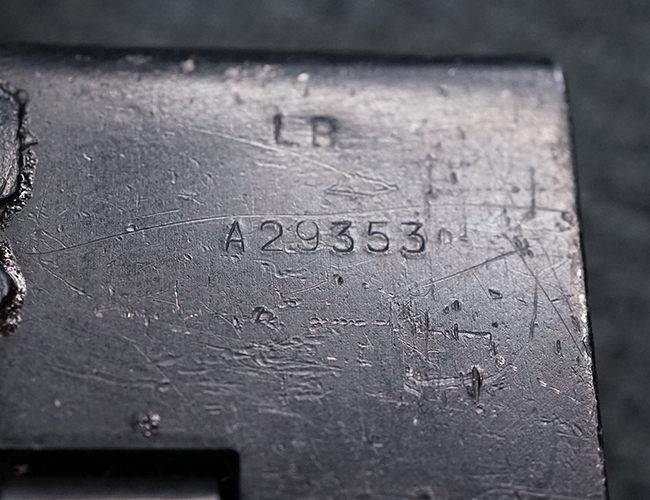 本品のマガジン・ハウジング上面には一部薄くなり判読が難しいものの「STEN. M. C. MK III」のモデル名刻印が入っており、マガジン・ハウジング下面にはシリアルNo.A29353の刻印が確認出来ます。 ラインズ・ブラザーズ社を示す「L. B.」のメーカー刻印が確認出来ます。 ストックはループ・タイプが取り付けられています。