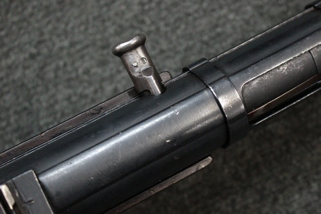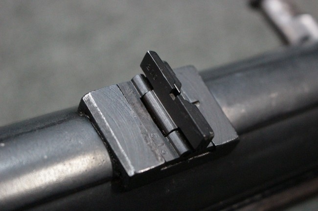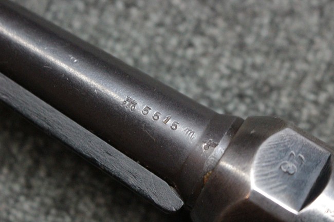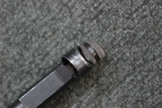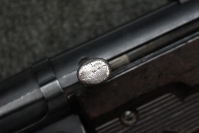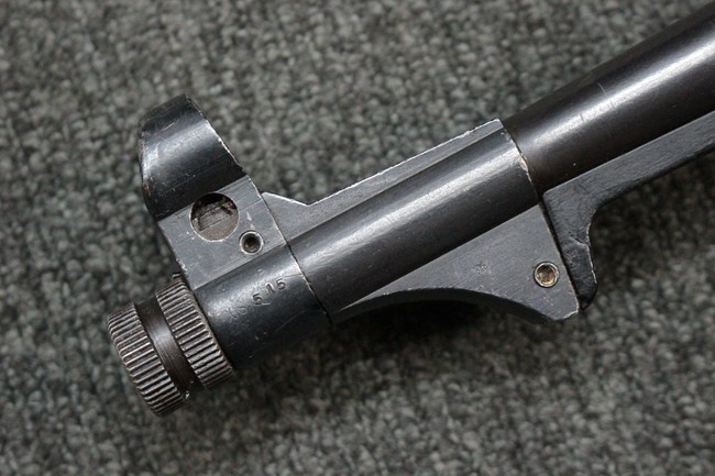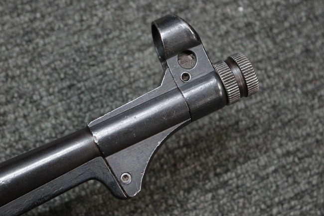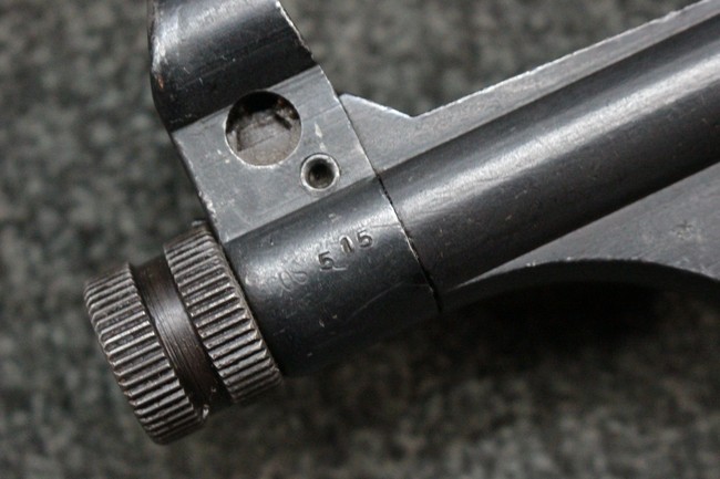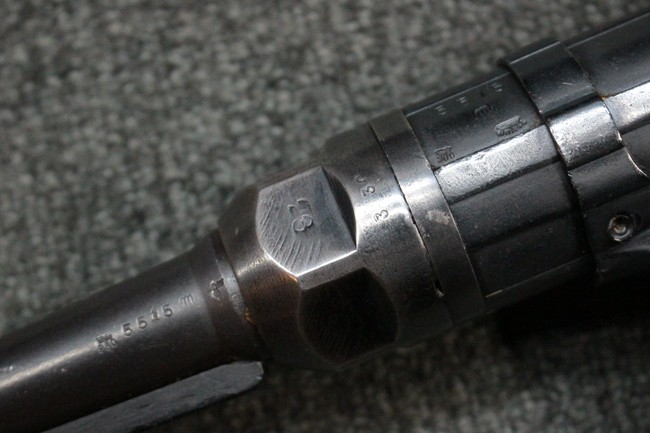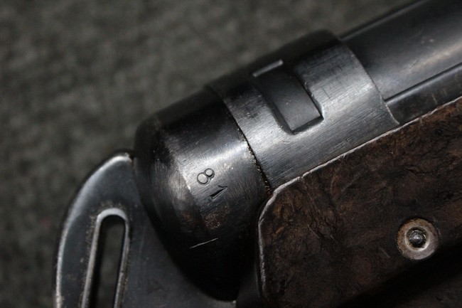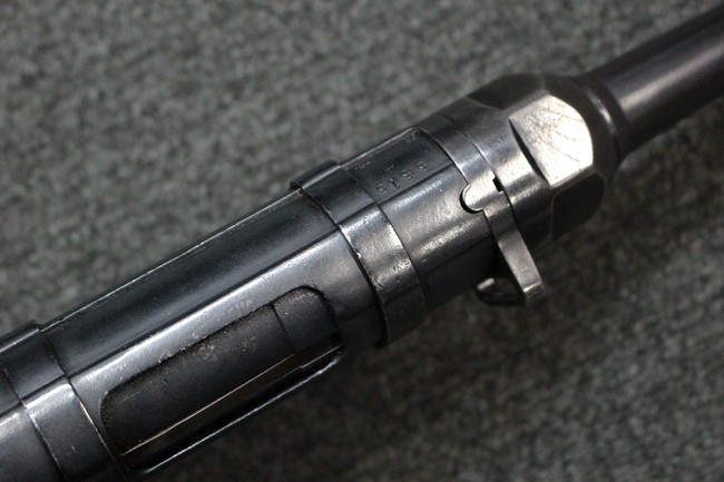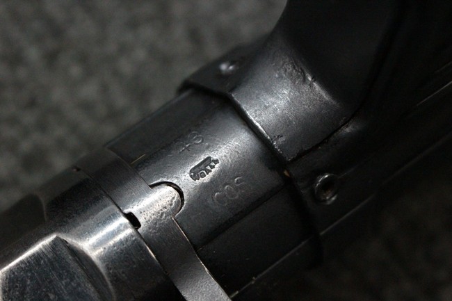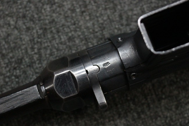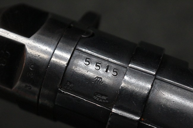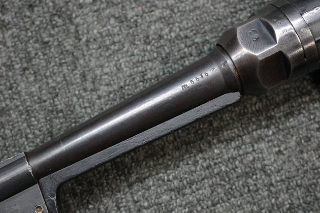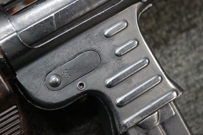 本品のレシーバー・エンド・キャップ上面にはC.G.ハーネル社製を示す「MP40 fxo 」の刻印が入っています。 マガジン・ハウジングは両面に5本の強化リブが追加されたタイプとなっています。 シリアルNo.5515はアッパー・レシーバー、フロント・サイト・ガード、銃身、リア・サイトでマッチしています。 その他の部分のシリアルNo.については、ロア・レシーバーは35437、トリガー・ガードが749、ストックのロック解除ボタンと折り畳みストックが81や437、リコイル・スプリング・アッセンブリが140となっています。 その他、各部にはアムト刻印が見られます。 マズル・リングは後期型の中央に溝のあるH型、バレル・ナットは六角型、バレル・レストは樹脂製となっており、コッキング・ハンドルは1942年半ば以降に本格的に導入されたボルト・セーフティ機能を備えた2ピース・タイプが装備されています。